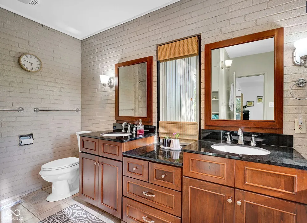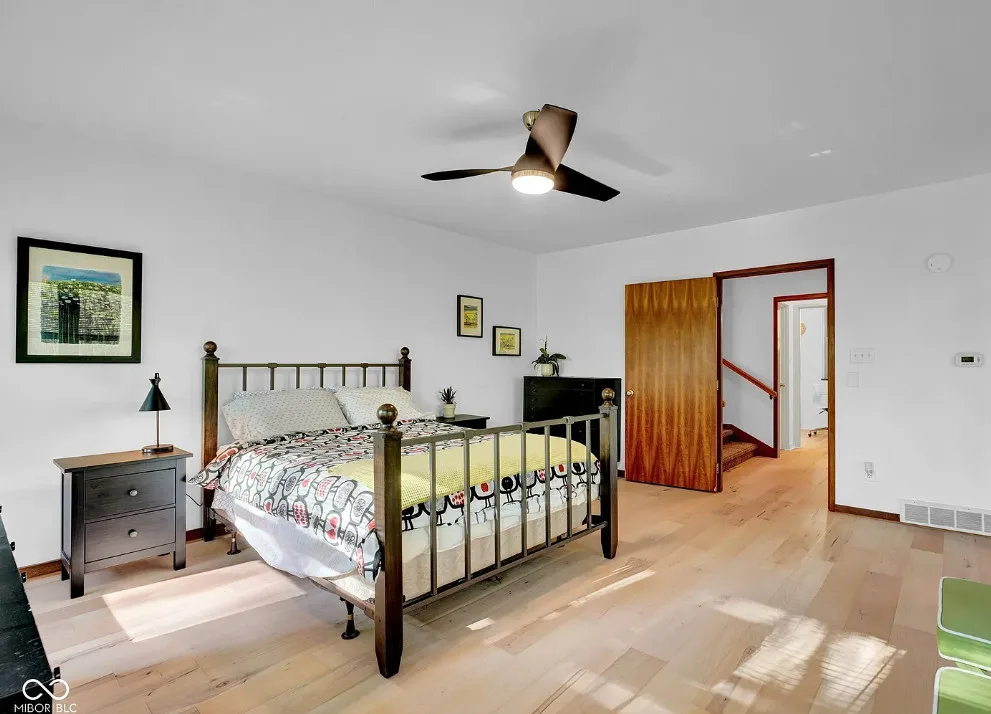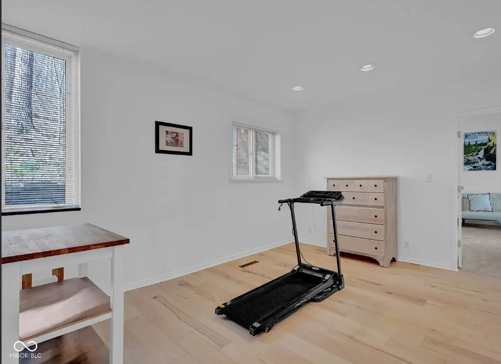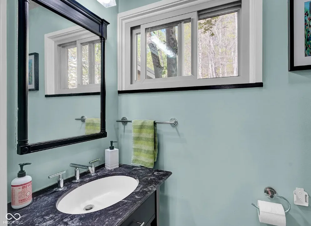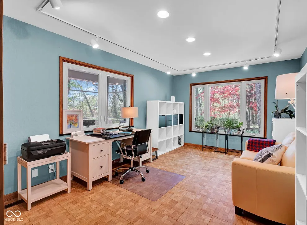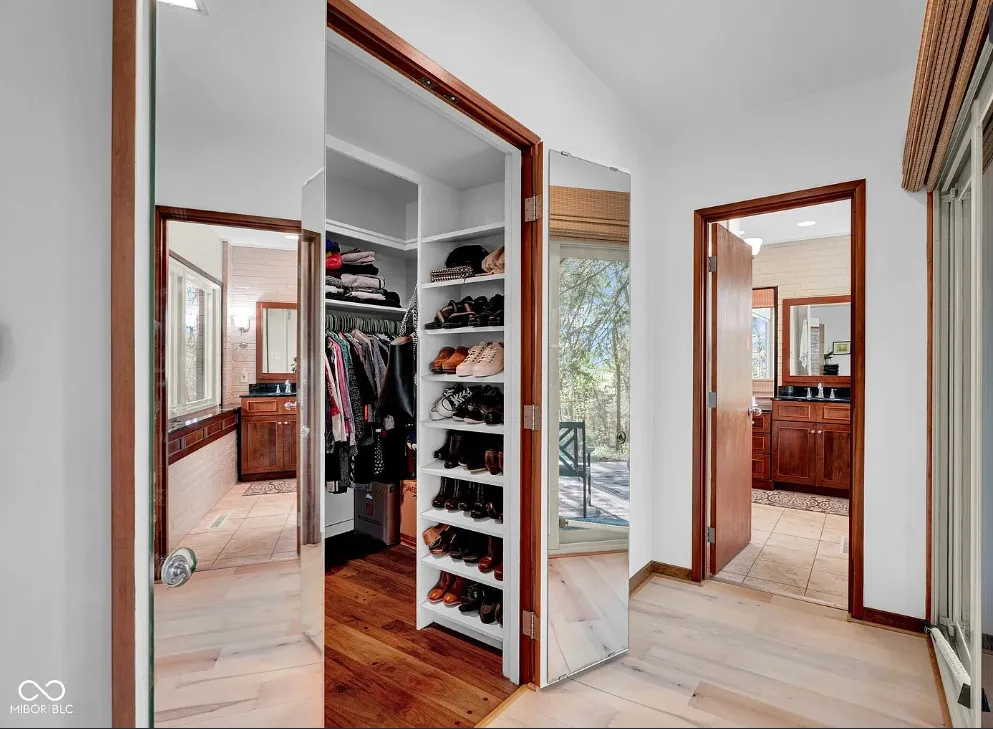 Love the windows in this mid-century home! Pretty view! The house was built in 1950. It is located on 4.14 acres in Columbus, Indiana. The house features a large deck, a beautiful patio, wood floors, a lot of natural light. spacious kitchen and built-in bookshelves. This is a big house! Four bedrooms, four bathrooms and 3,468 square feet. $695,000