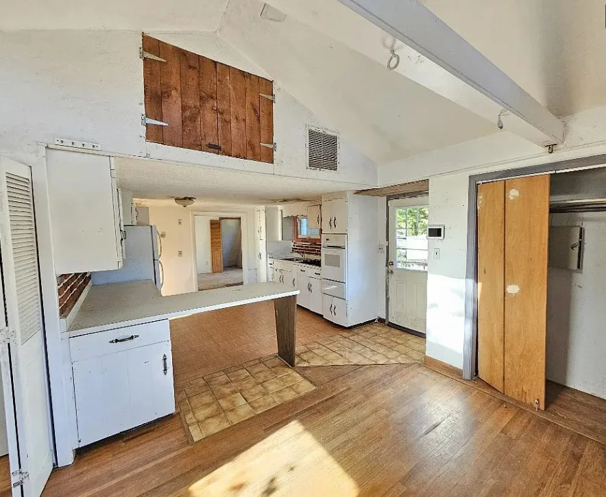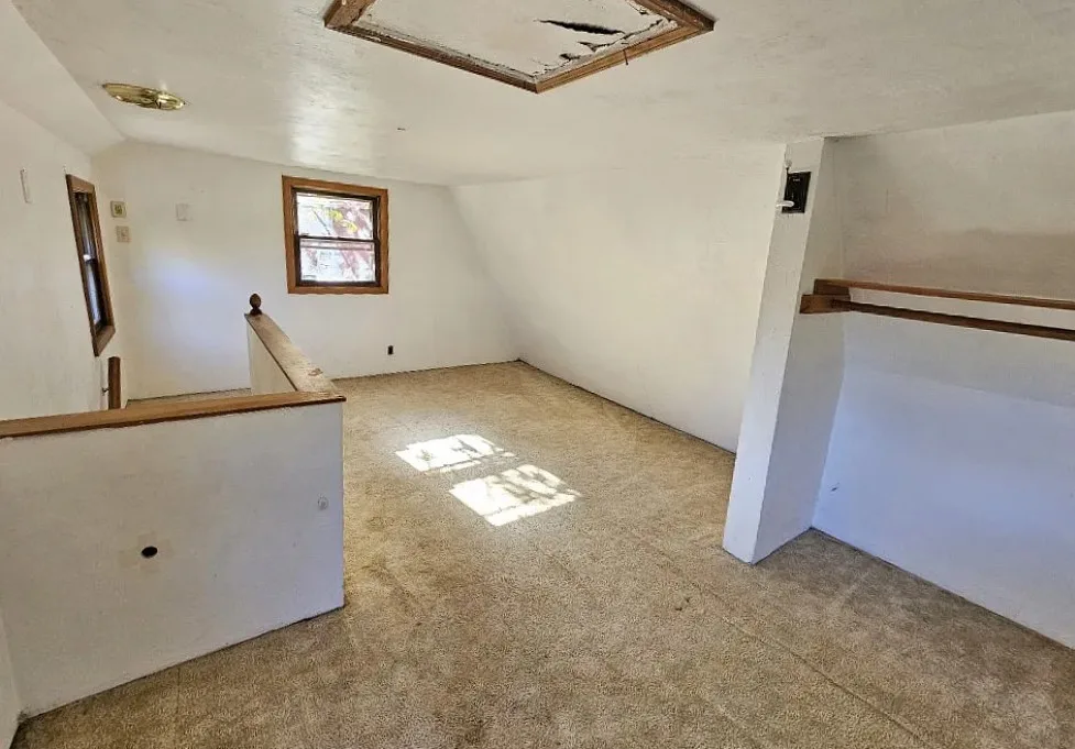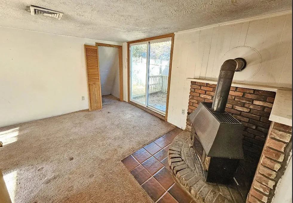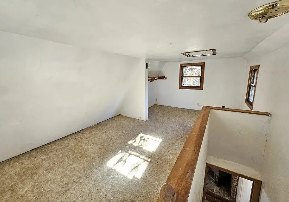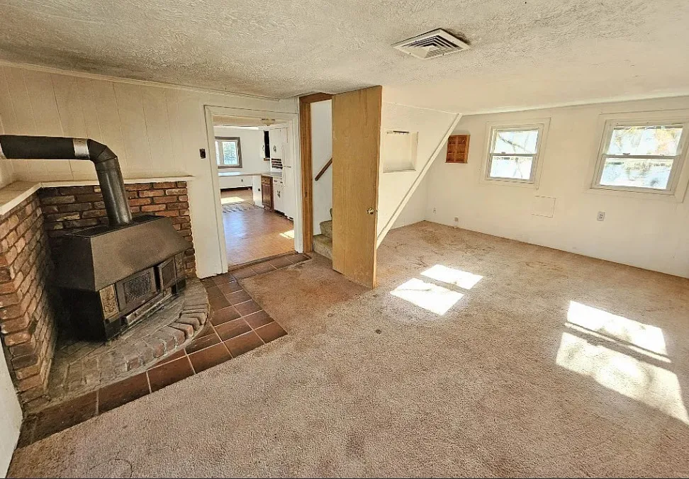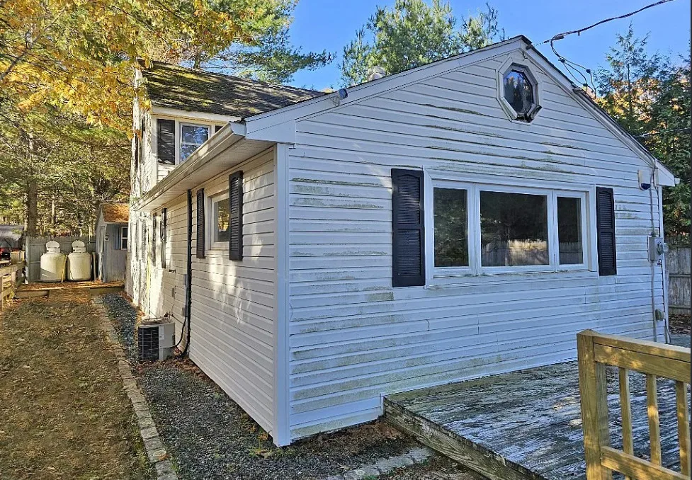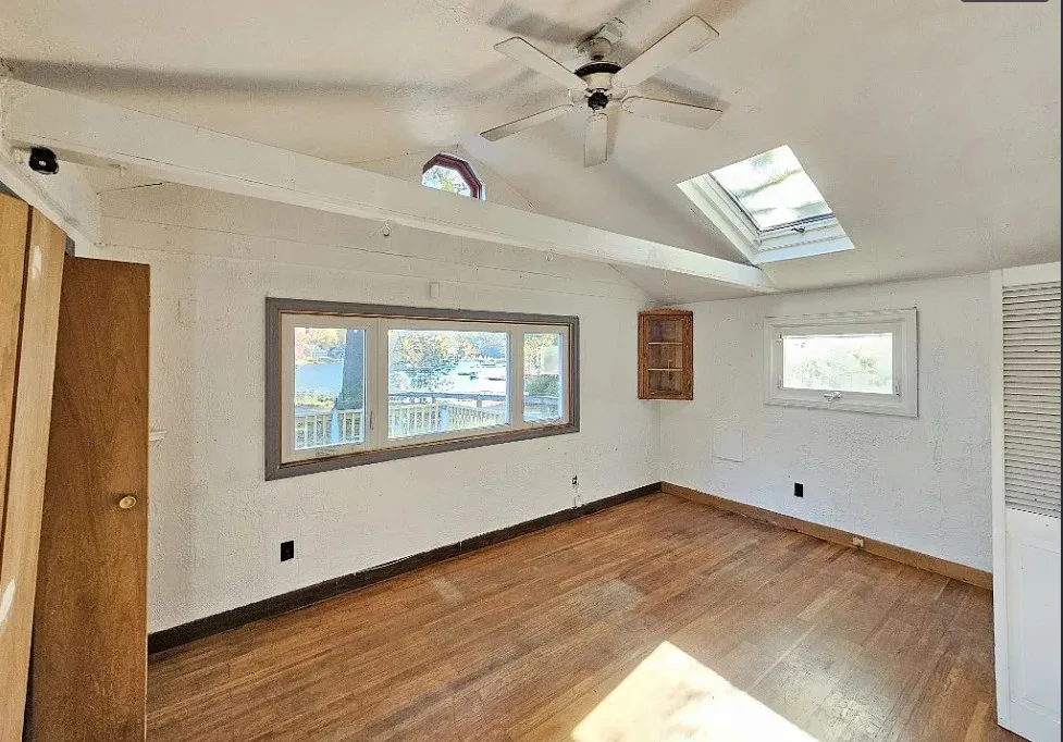 Fixer upper alert! Waterfront in Massachusetts. The house was built in 1938. It is located in Spencer, Massachusetts. The house definitely needs work, but it has a pretty setting. The house features a large wrap around deck, a small dock and vintage kitchen cabinets. There are two detached storage sheds on the property. One bedroom, one bathroom and 976 square feet. $189,900