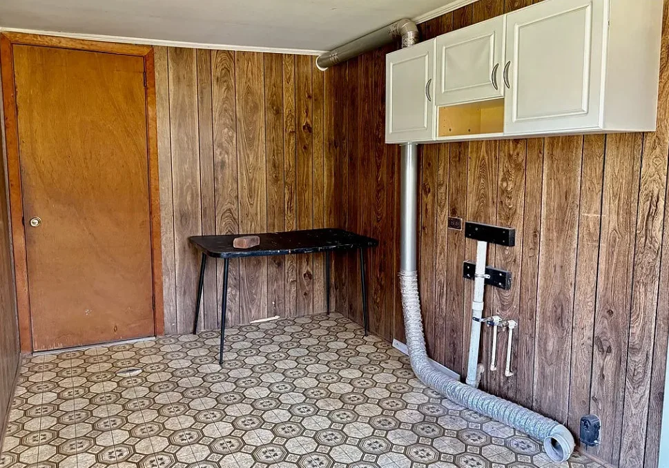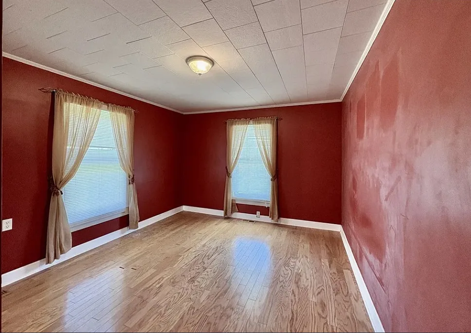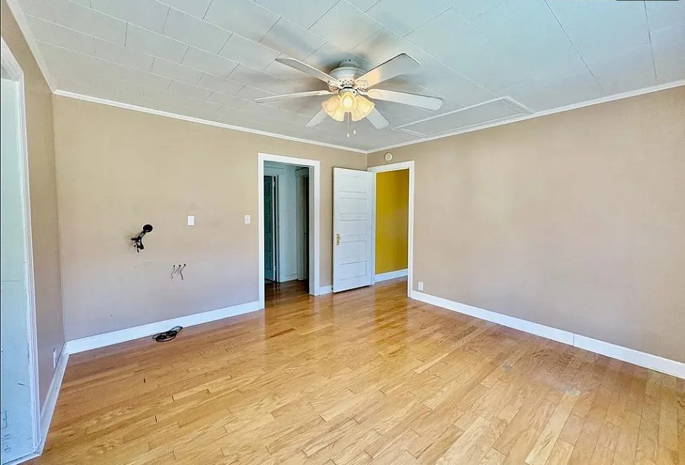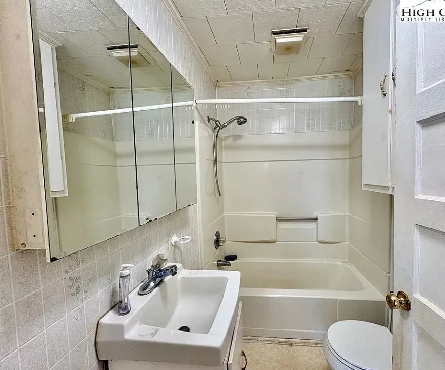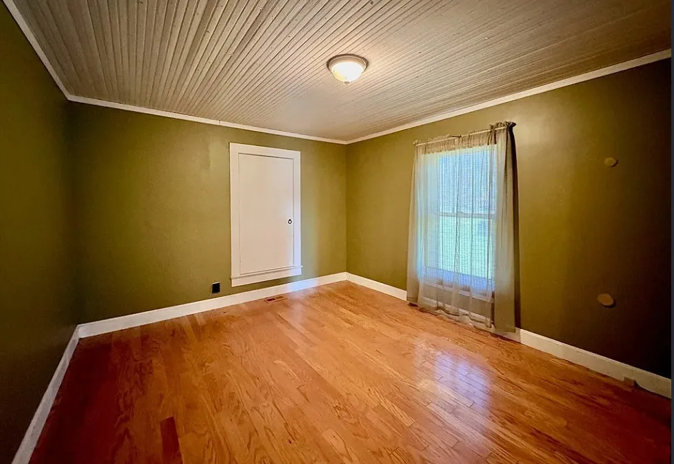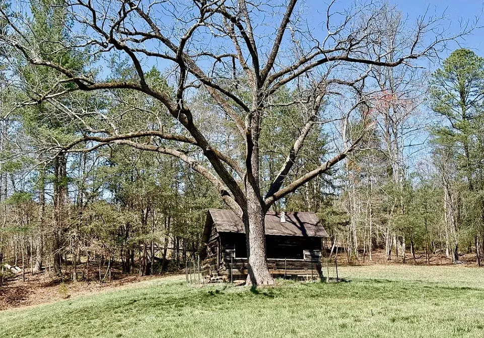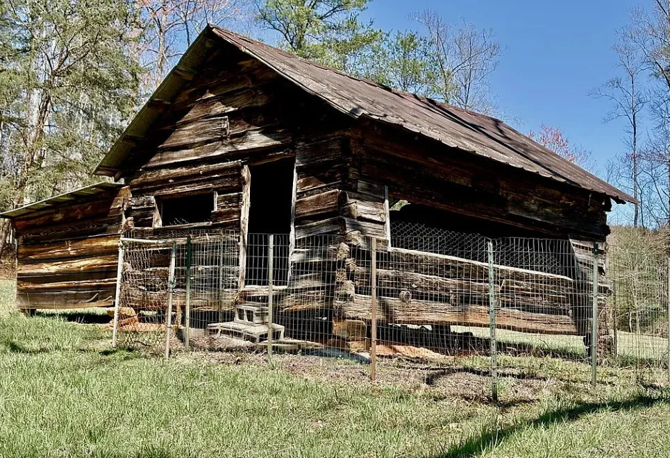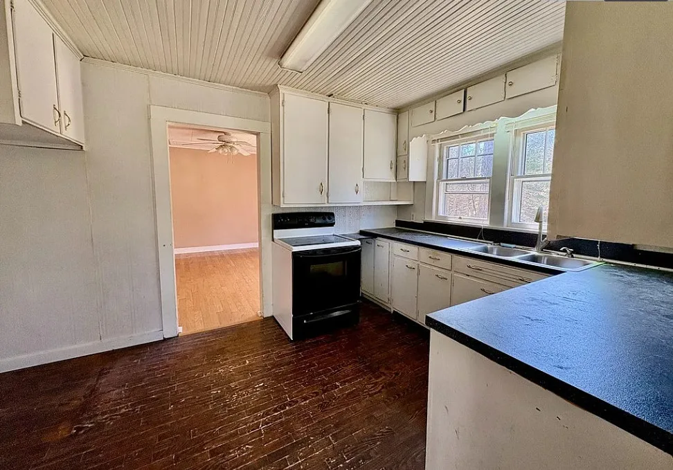 I kind of want this! What a nice little homestead this could be! The outbuildings are great! The house was built in 1931. It is located on 4.92 acres in Lenoir, North Carolina. The house features a covered front porch, a long driveway, wood floors, baseboards, crown moulding, decent kitchen, laundry room and an english basement. There is a large detached garage with space above, an old log cabin and another storage shed. Two bedrooms, one bathroom and 988 square feet. $210,000