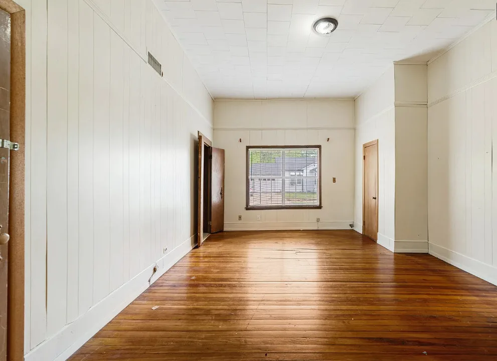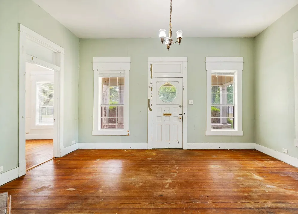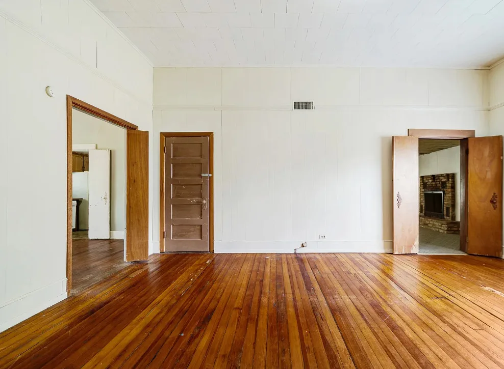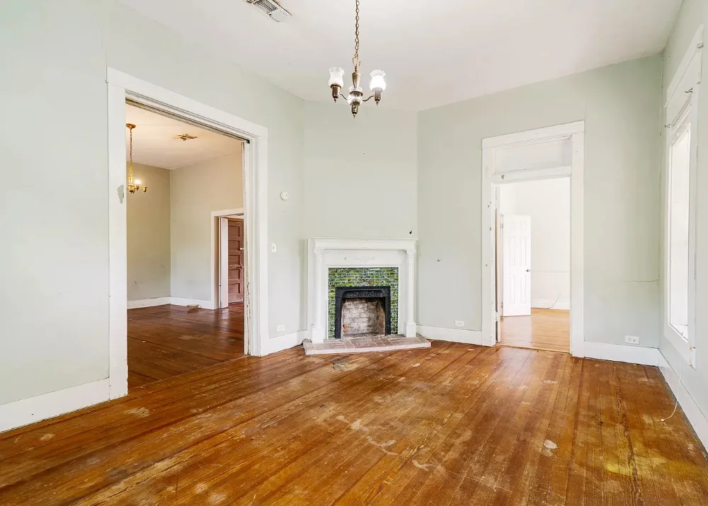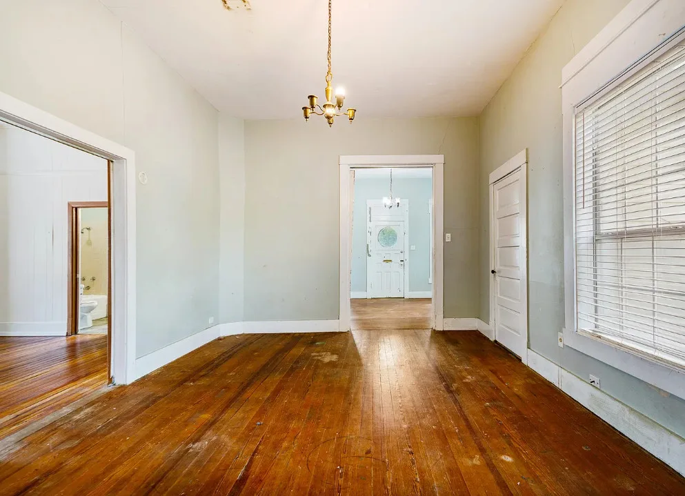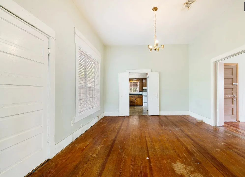 With some work these floors could be really nice! This house has a lot of potential. The house was built in the early 1900’s. It is located on .4 acre in Paris, Texas. The house features a covered front porch, original wood floors, large brick fireplace, baseboards and vintage light fixtures. There is a large back porch. Three bedrooms, two bathrooms and 2,230 square feet. $139,000