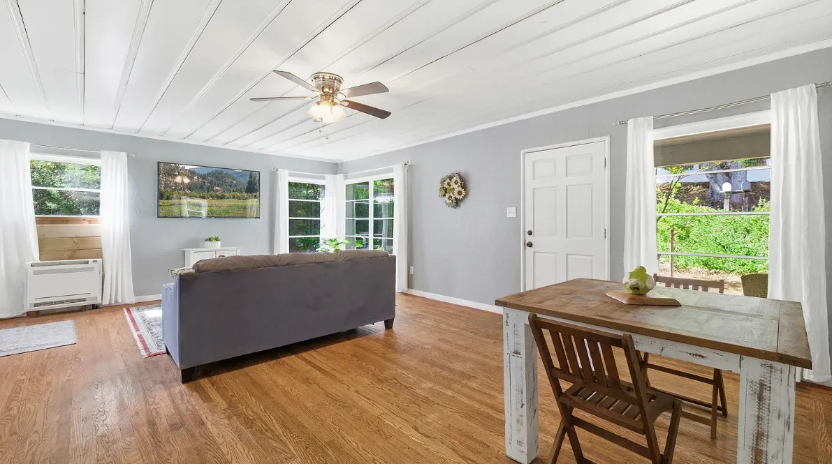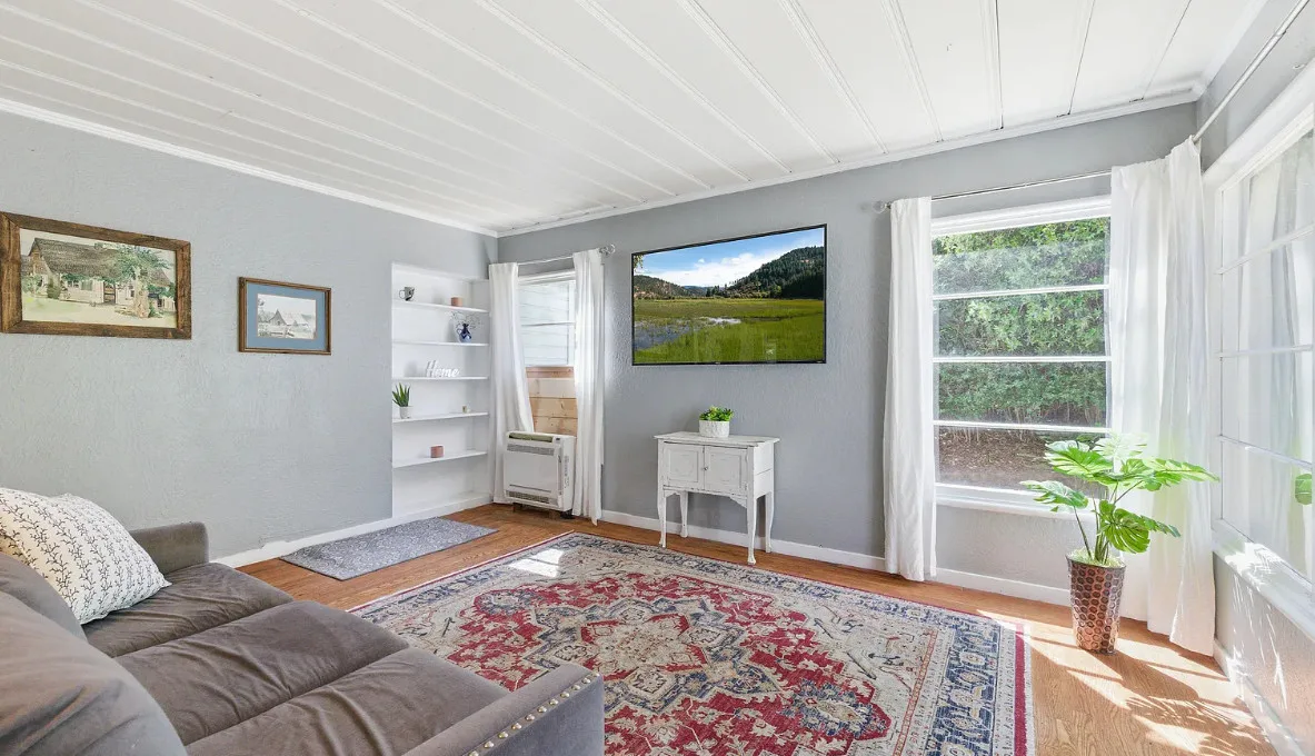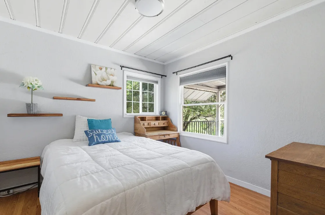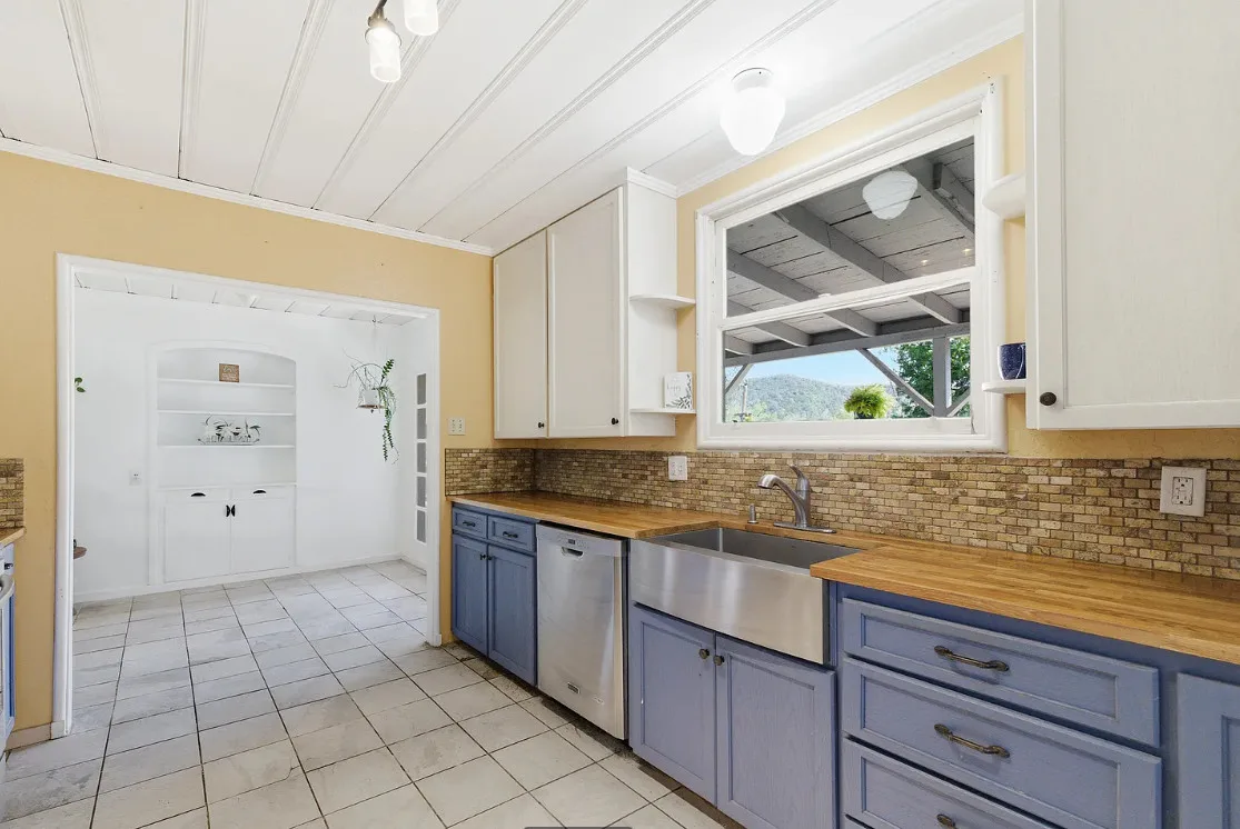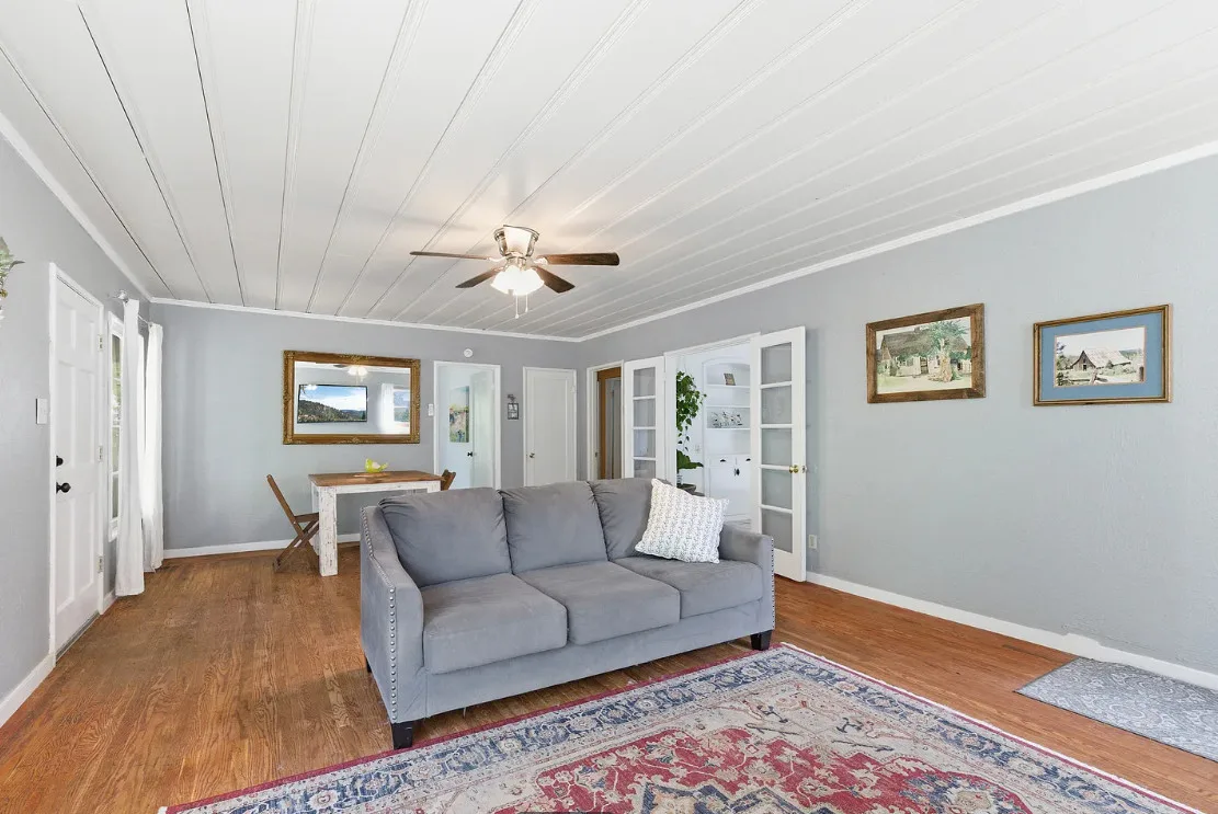 This is a cute house in California! There is nice curb appeal! The house was built in 1949. It is located on .40 acre in Sonora, California. The house features nice curb appeal, a covered front porch, a lot of natural light, built-in bookshelves, french doors, baseboards, crown moulding and wood ceilings. There is unfinished space on the bottom floor. The yard has flat garden areas. Two bedrooms, one bathroom and 1,059 square feet. $253,000