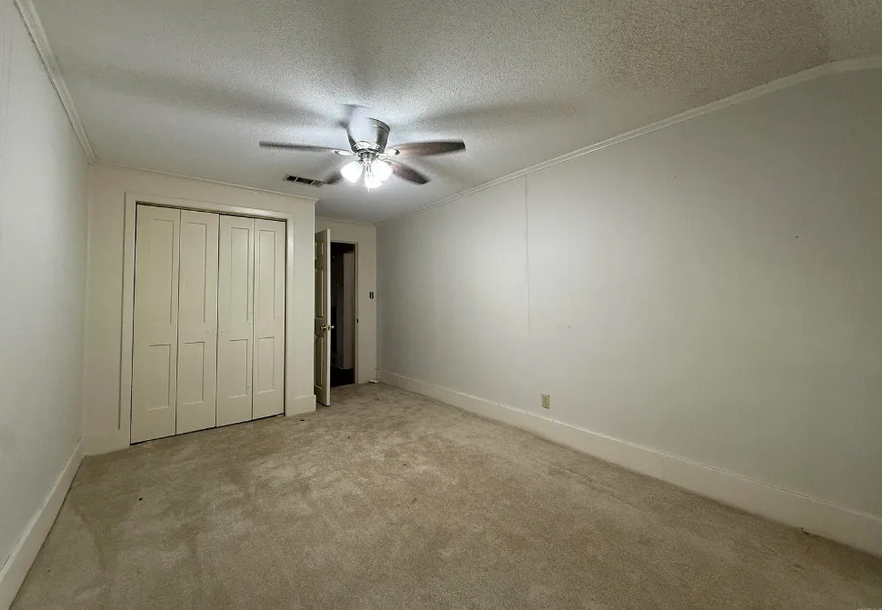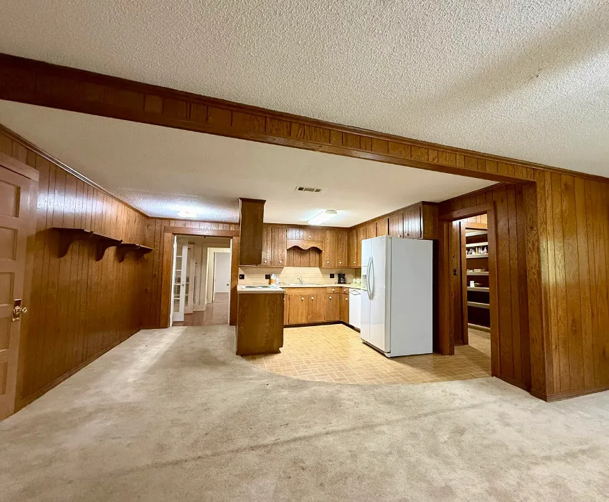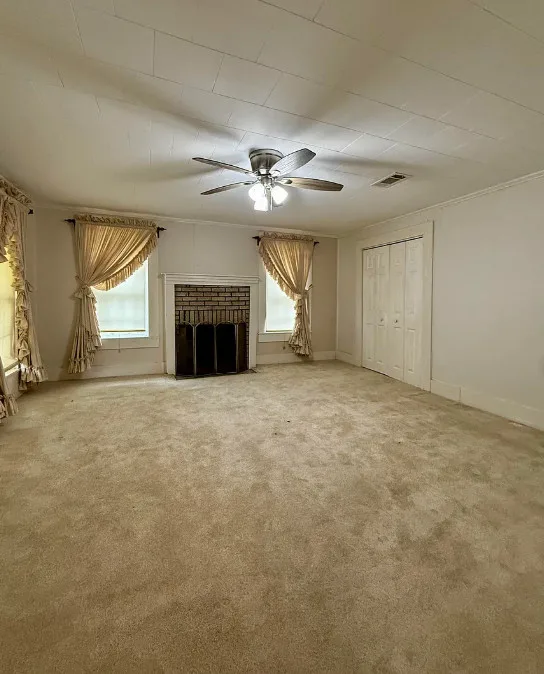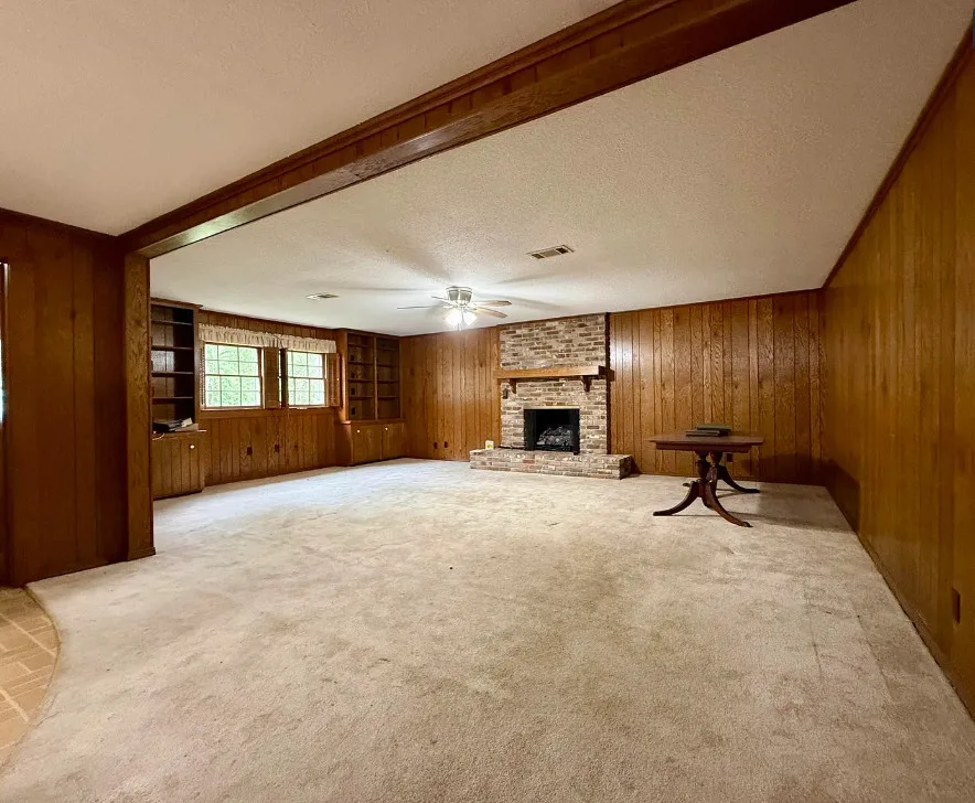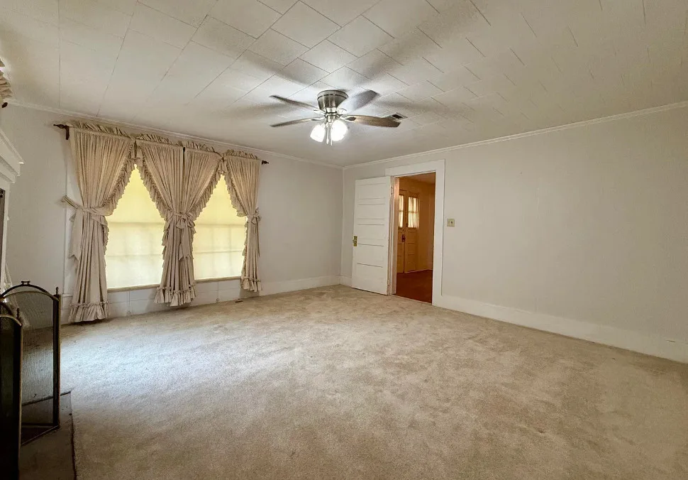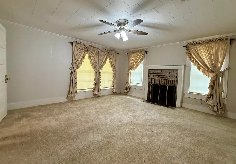 This house has potential! I like the setting and the other buildings. This house is known as the Harveyville home. The house was built in 1940. It is located on 6.51 acres in Camden, Arkansas. The house features a covered front porch, some wood flooring, baseboards, crown moulding and vintage light fixtures. Would love to see what is underneath the carpeting and behind some of that sheetrock. Three bedrooms, two bathrooms and 2,280 square feet. $169,900