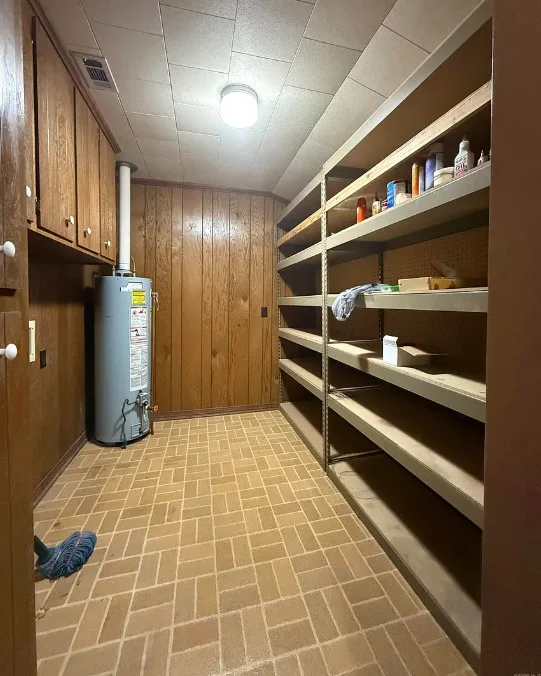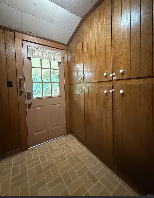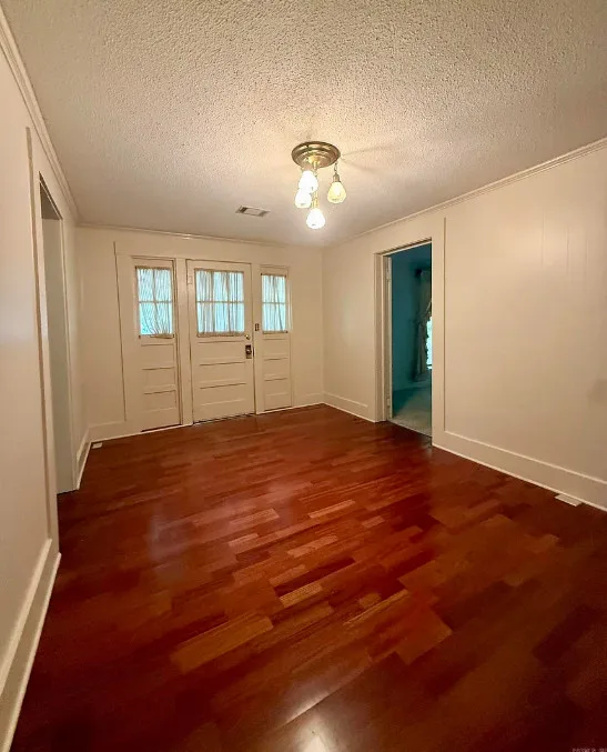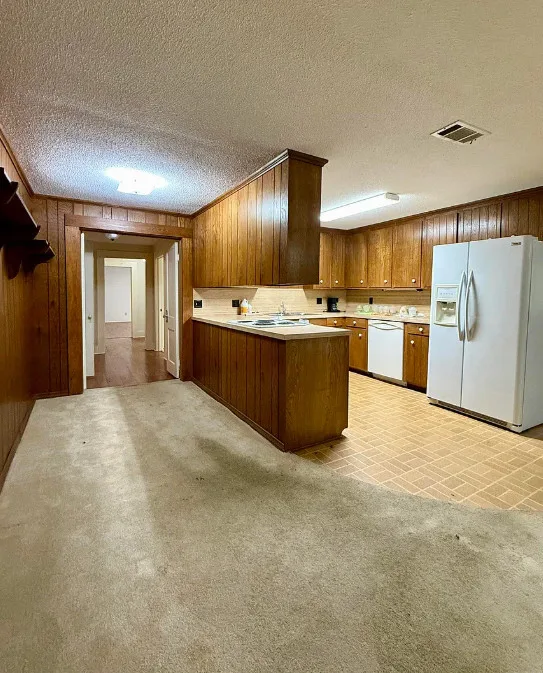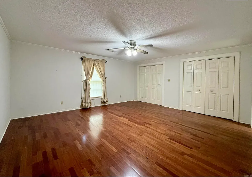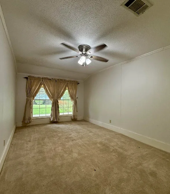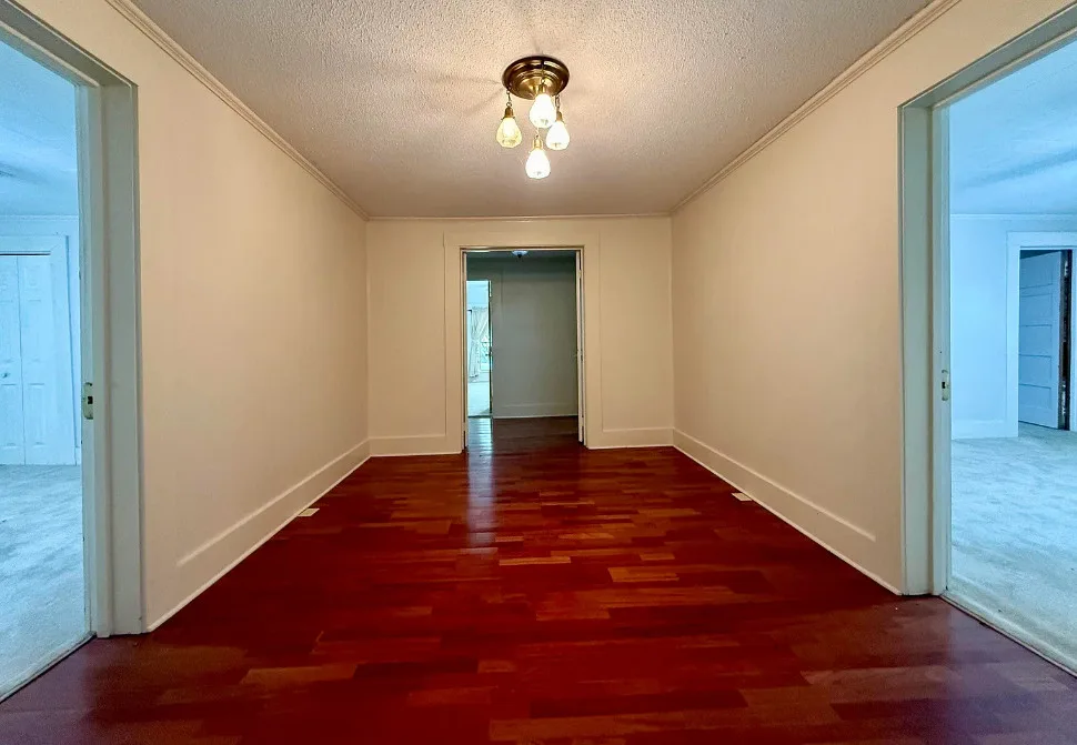 This house has potential! I like the setting and the other buildings. This house is known as the Harveyville home. The house was built in 1940. It is located on 6.51 acres in Camden, Arkansas. The house features a covered front porch, some wood flooring, baseboards, crown moulding and vintage light fixtures. Would love to see what is underneath the carpeting and behind some of that sheetrock. Three bedrooms, two bathrooms and 2,280 square feet. $169,900