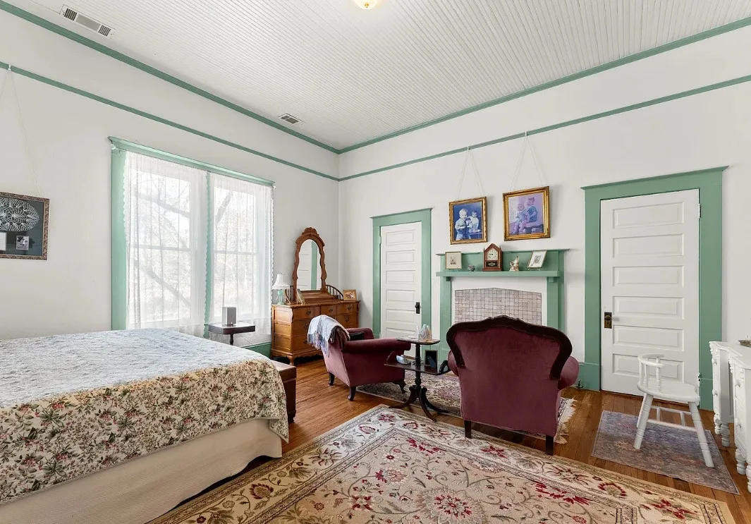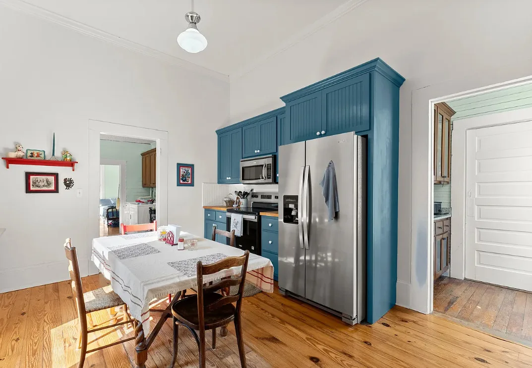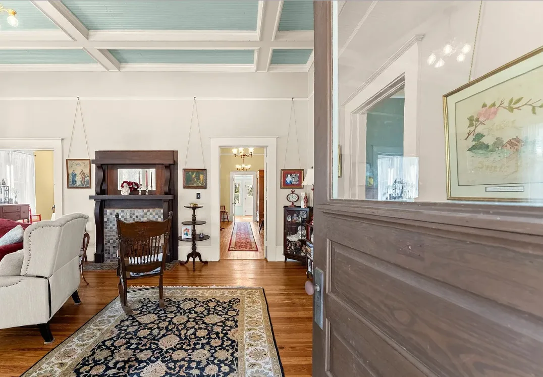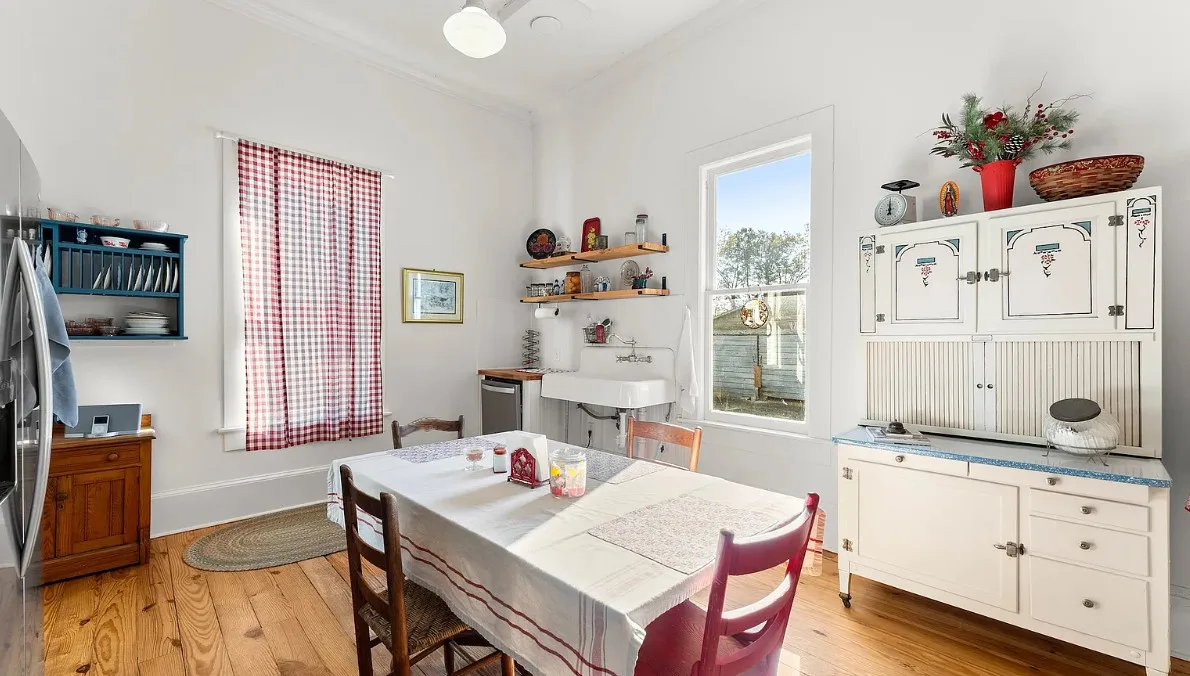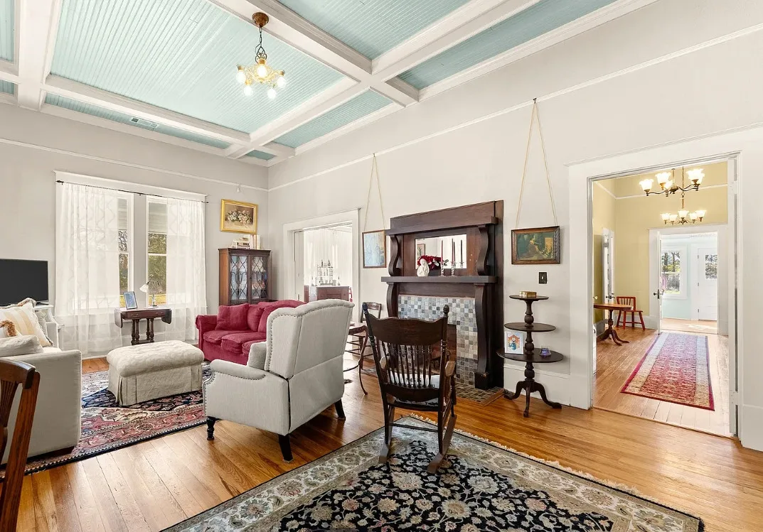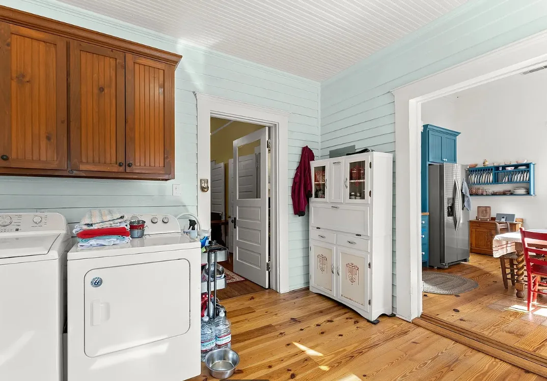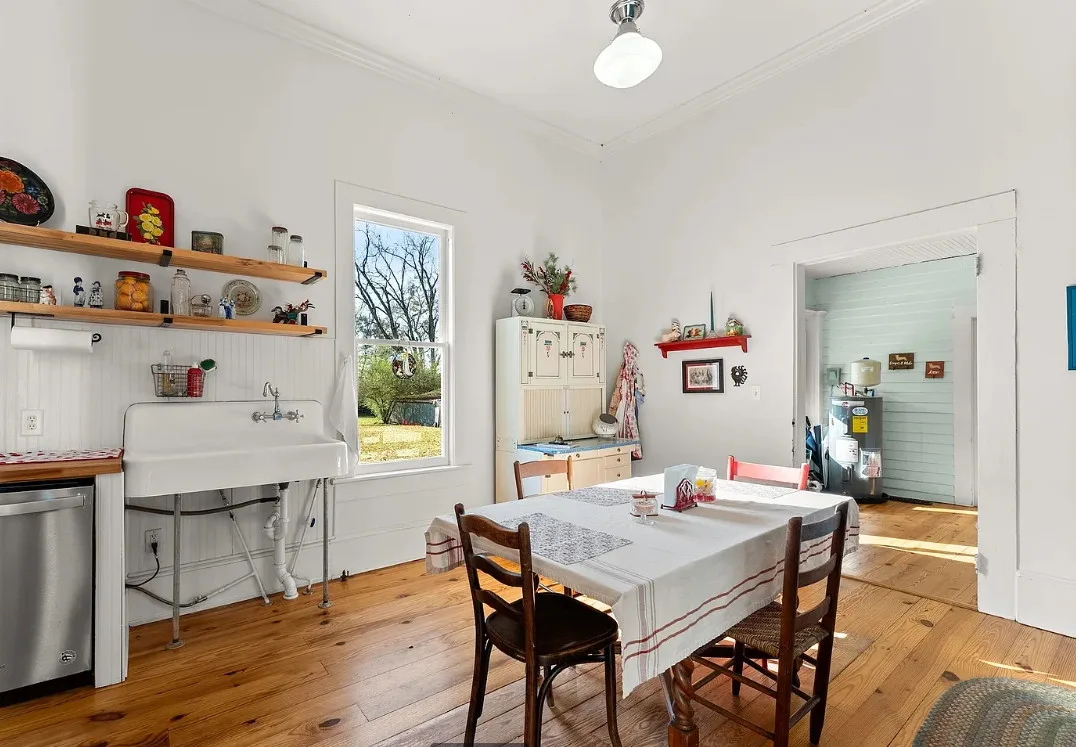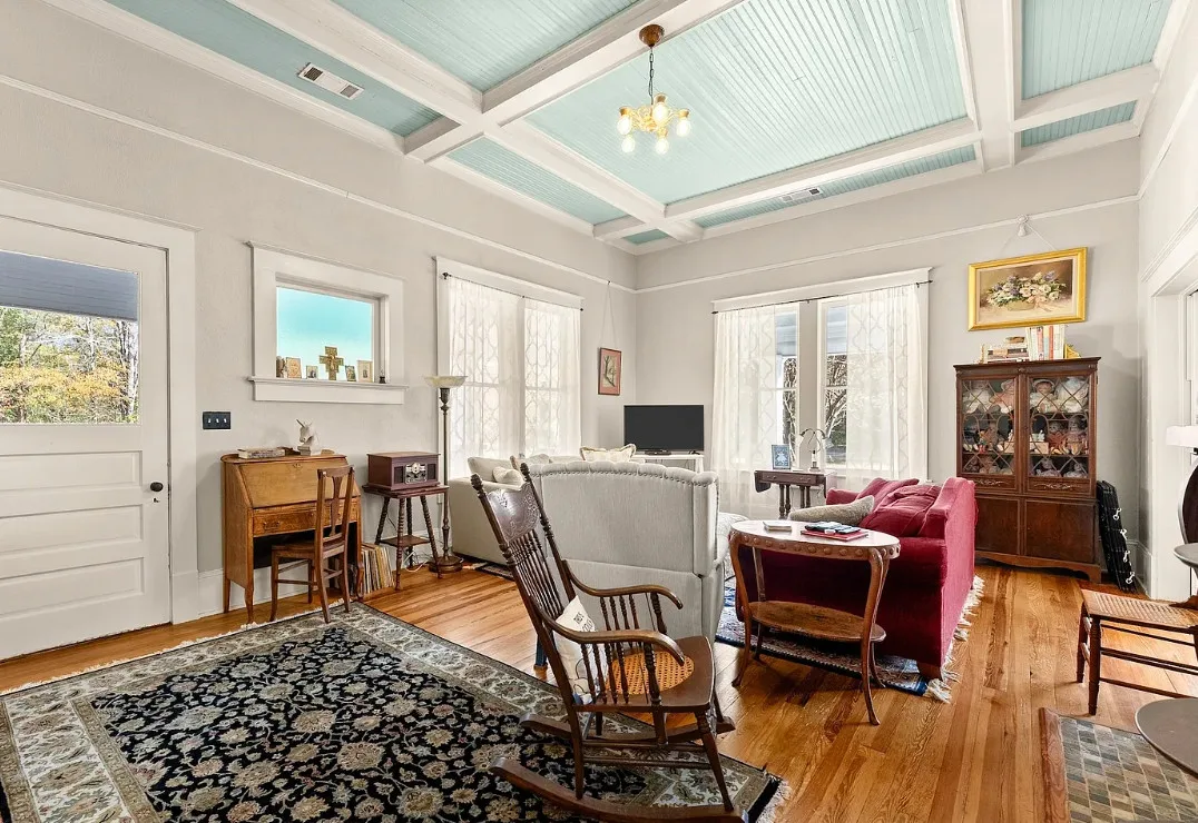The kitchen has a bit of a vintage look to it! Love the sink! The living room ceiling is pretty! I never thought of doing a haint blue inside. The house was built in 1917. It is located on 2.43 acres in Carlton, Georgia. The house features a large covered front porch, original wood floors, coffered ceiling, picture rails, bead board, wide baseboards, crown moulding, tall ceilings, a lot of natural light, vintage kitchen, built-in china cabinet in dining room and a large laundry room. There is a detached garage, back deck and garden area. Three bedrooms, two bathrooms and 2,148 square feet. $394,900