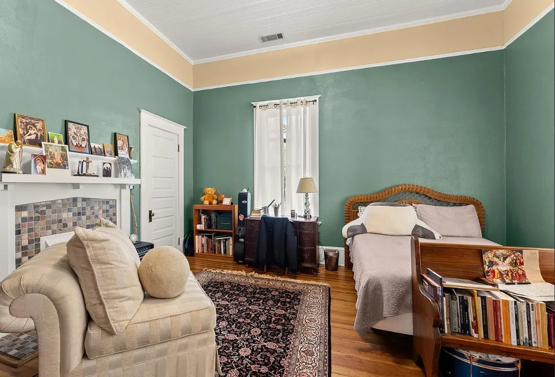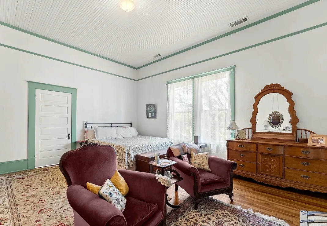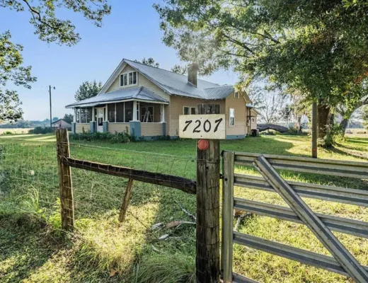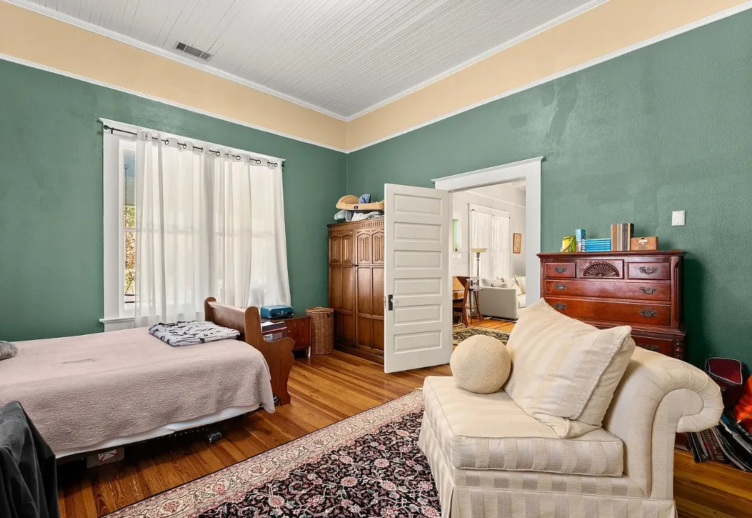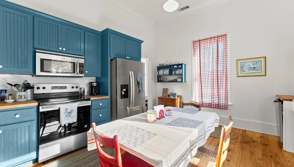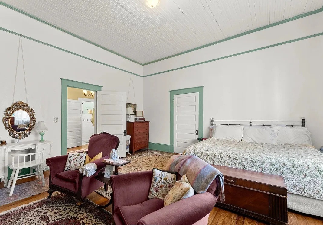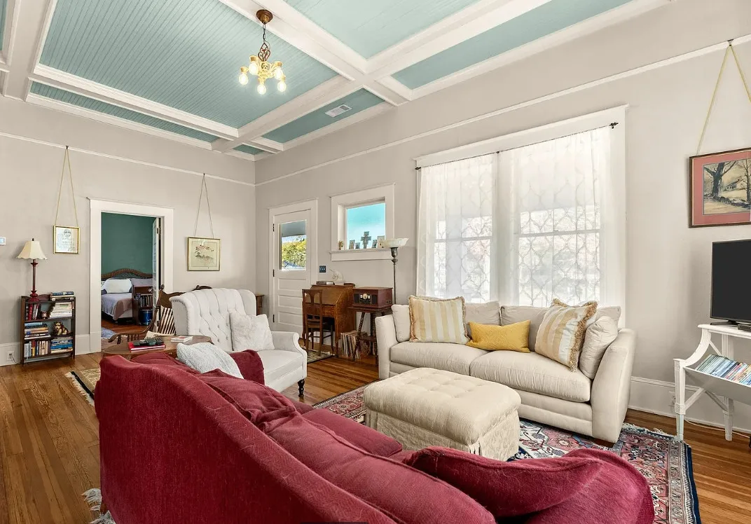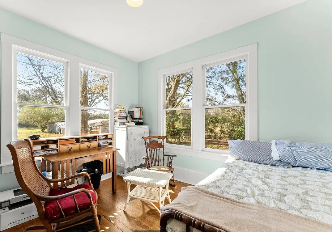 The kitchen has a bit of a vintage look to it! Love the sink! The living room ceiling is pretty! I never thought of doing a haint blue inside. The house was built in 1917. It is located on 2.43 acres in Carlton, Georgia. The house features a large covered front porch, original wood floors, coffered ceiling, picture rails, bead board, wide baseboards, crown moulding, tall ceilings, a lot of natural light, vintage kitchen, built-in china cabinet in dining room and a large laundry room. There is a detached garage, back deck and garden area. Three bedrooms, two bathrooms and 2,148 square feet. $394,900
