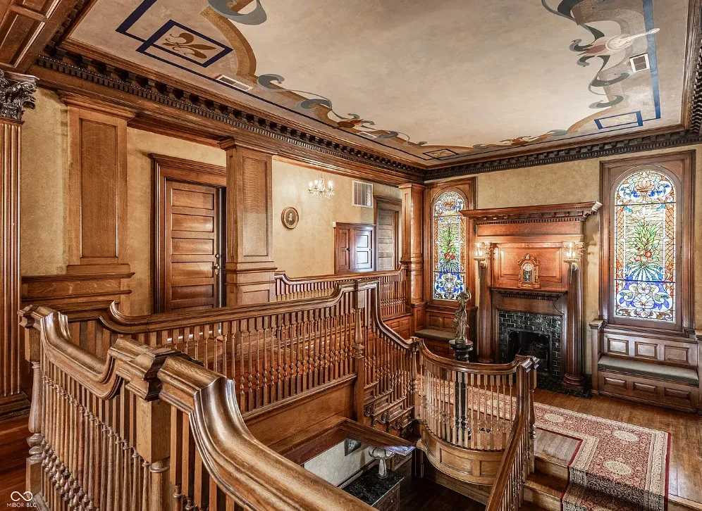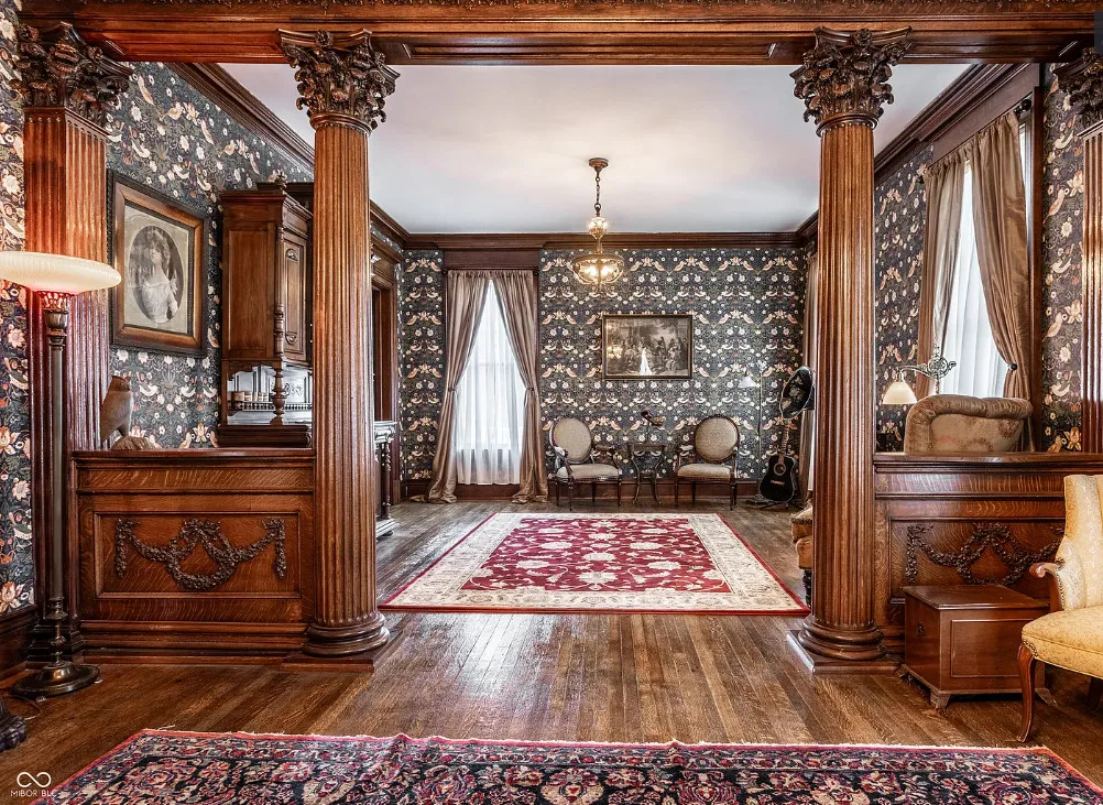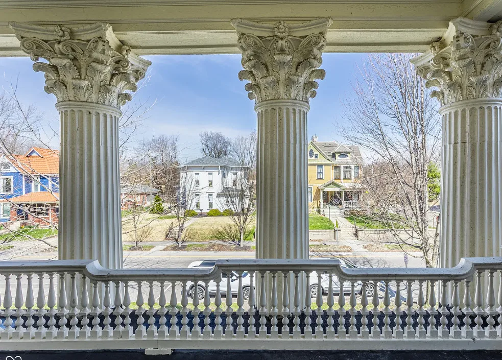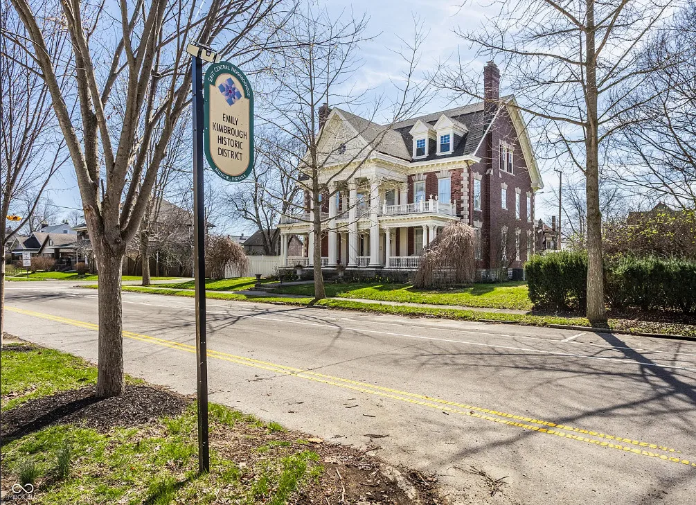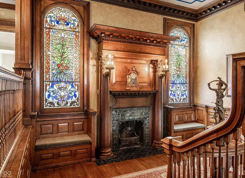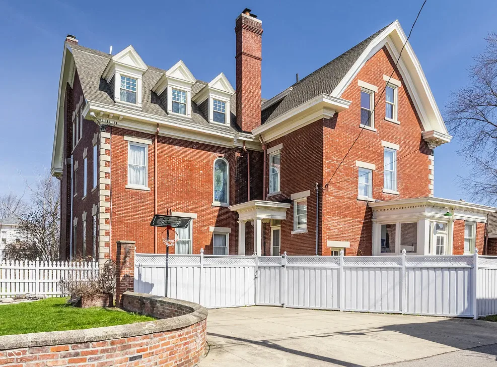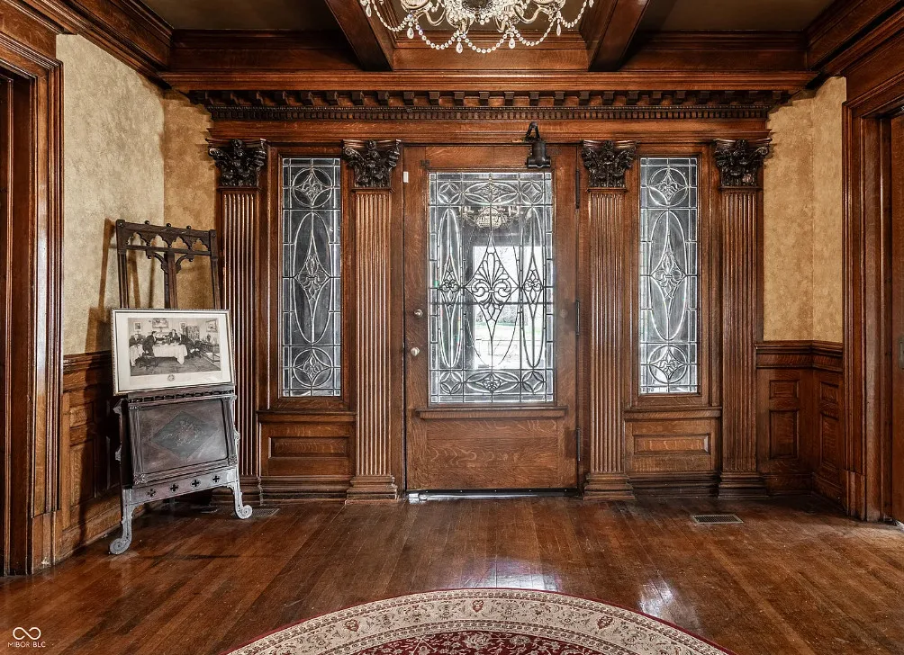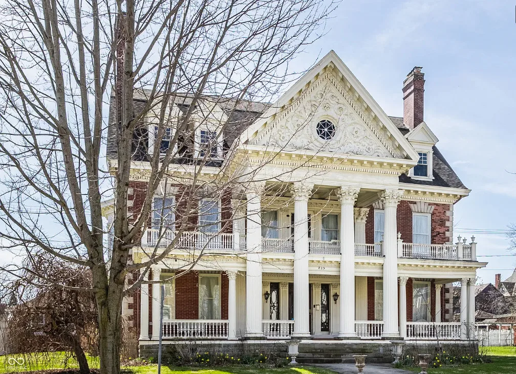 The Charles Over Mansion | Keystone of Muncie’s Emily Kimbrough Historic District A rare opportunity to own one of the area’s most iconic historic estates, where timeless architecture, a hidden third-floor ballroom, and modern luxury converge. Meticulously restored, this 1902 Georgian Revival and Neo-Classical landmark offers a level of craftsmanship and presence rarely found. Built by industrialist Charles Over (founder of Over Glass Works), the brick mansion makes an unforgettable 1st impression with grand Corinthian columns, an expansive front porch, and matching second-level portico. Inside, original terrazzo floors welcome you into the vestibule. A breathtaking solid oak and ornate leaded glass entry opens into an interior of luxurious Victorian grandeur. Original hardwood floors, curated ornate gilded bronze, crystal chandeliers and other authentic period lighting carry throughout. The main level flows effortlessly from the grand entrance hall, surrounded by a formal dining room with oak wainscoting, panoramic murals, coffered ceiling, a drawing room and parlor with fireplaces, ornate pediments, oak pillars and seven original oak pocket doors. Original marble bathroom sinks, claw-foot tub, leaded and stained glass, and a grand fireplace atop the grand staircase with dual built-in bench seating, all showcasing exceptional craftsmanship. The 3rd floor offers a true showpiece, an immersive speakeasy-style retreat with Chicago brick floors, guest bedroom, full bath with soaking tub, and a stunning ballroom featuring an expansive dance floor, stage, wet bar, and media lounge. Painstakingly preserved, restored and thoughtfully modernized with 4 zoned high-efficiency HVAC systems, chef’s kitchen featuring commercial-grade appliances, and unusually generous closet space throughout. Located in the revitalizing Emily Kimbrough Historic District, moments from downtown Muncie’s dining, shops, and culture. A legacy property for the next fortunate steward.