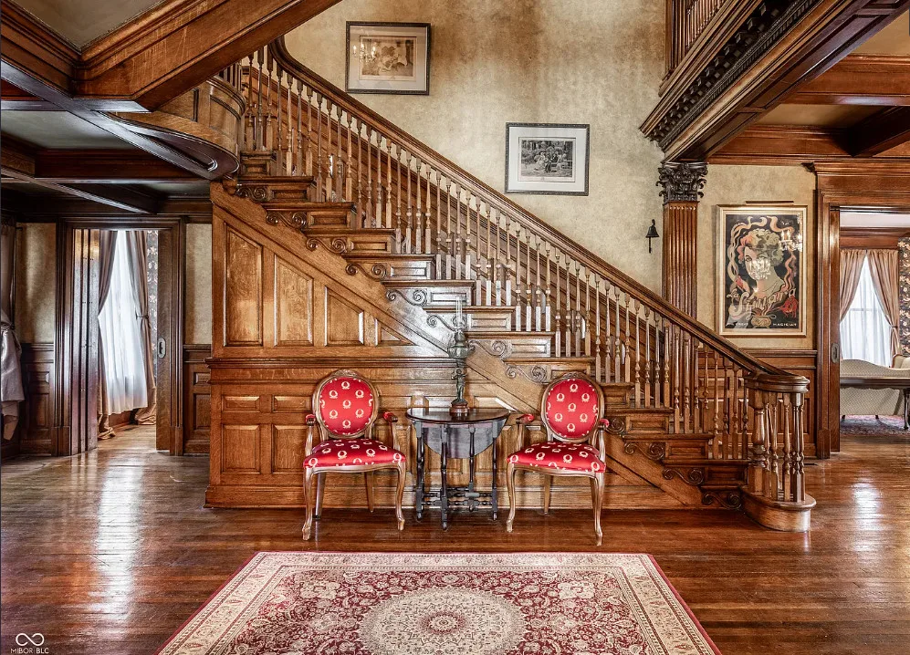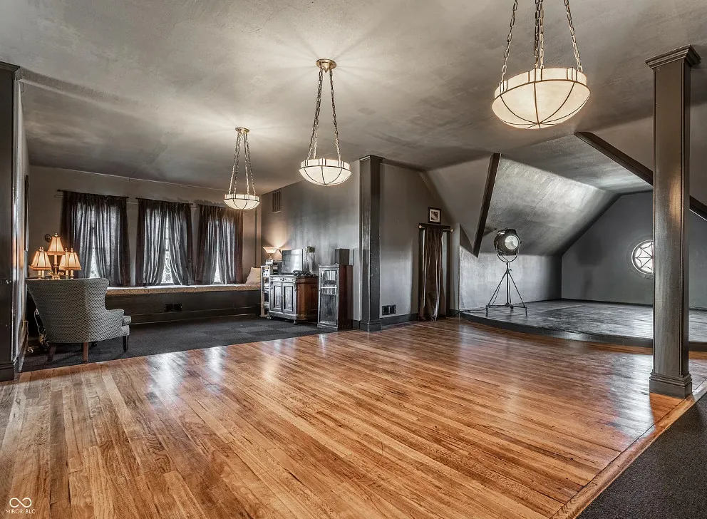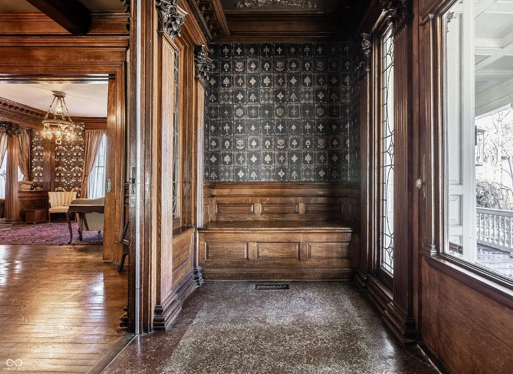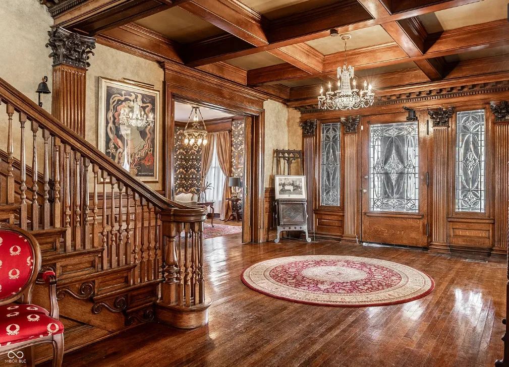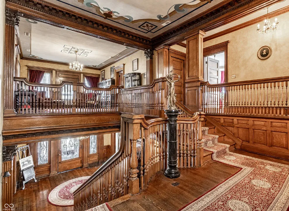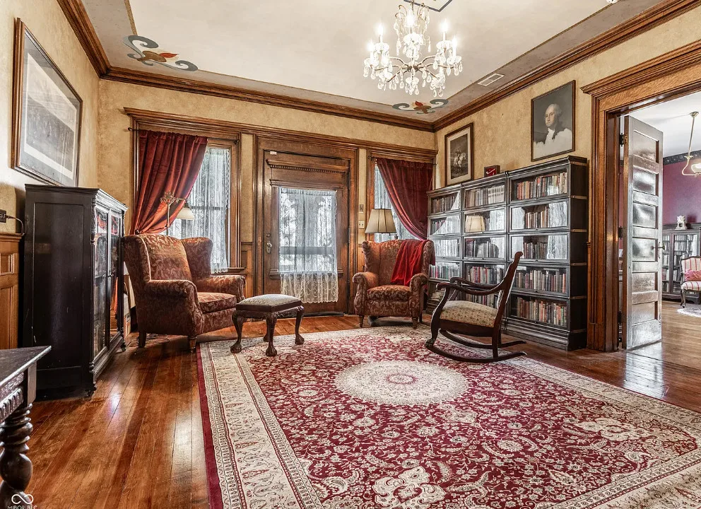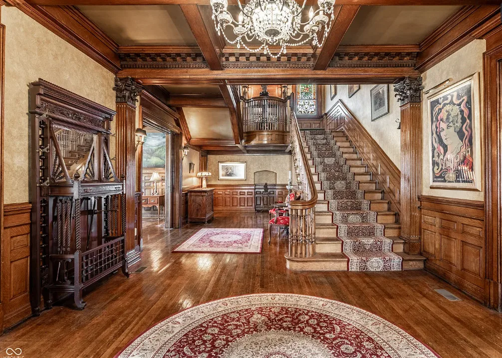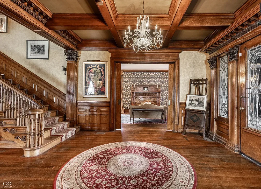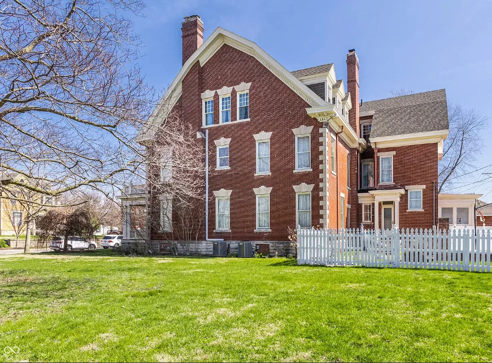 The Charles Over Mansion | Keystone of Muncie’s Emily Kimbrough Historic District A rare opportunity to own one of the area’s most iconic historic estates, where timeless architecture, a hidden third-floor ballroom, and modern luxury converge. Meticulously restored, this 1902 Georgian Revival and Neo-Classical landmark offers a level of craftsmanship and presence rarely found. Built by industrialist Charles Over (founder of Over Glass Works), the brick mansion makes an unforgettable 1st impression with grand Corinthian columns, an expansive front porch, and matching second-level portico. Inside, original terrazzo floors welcome you into the vestibule. A breathtaking solid oak and ornate leaded glass entry opens into an interior of luxurious Victorian grandeur. Original hardwood floors, curated ornate gilded bronze, crystal chandeliers and other authentic period lighting carry throughout. The main level flows effortlessly from the grand entrance hall, surrounded by a formal dining room with oak wainscoting, panoramic murals, coffered ceiling, a drawing room and parlor with fireplaces, ornate pediments, oak pillars and seven original oak pocket doors. Original marble bathroom sinks, claw-foot tub, leaded and stained glass, and a grand fireplace atop the grand staircase with dual built-in bench seating, all showcasing exceptional craftsmanship. The 3rd floor offers a true showpiece, an immersive speakeasy-style retreat with Chicago brick floors, guest bedroom, full bath with soaking tub, and a stunning ballroom featuring an expansive dance floor, stage, wet bar, and media lounge. Painstakingly preserved, restored and thoughtfully modernized with 4 zoned high-efficiency HVAC systems, chef’s kitchen featuring commercial-grade appliances, and unusually generous closet space throughout. Located in the revitalizing Emily Kimbrough Historic District, moments from downtown Muncie’s dining, shops, and culture. A legacy property for the next fortunate steward.