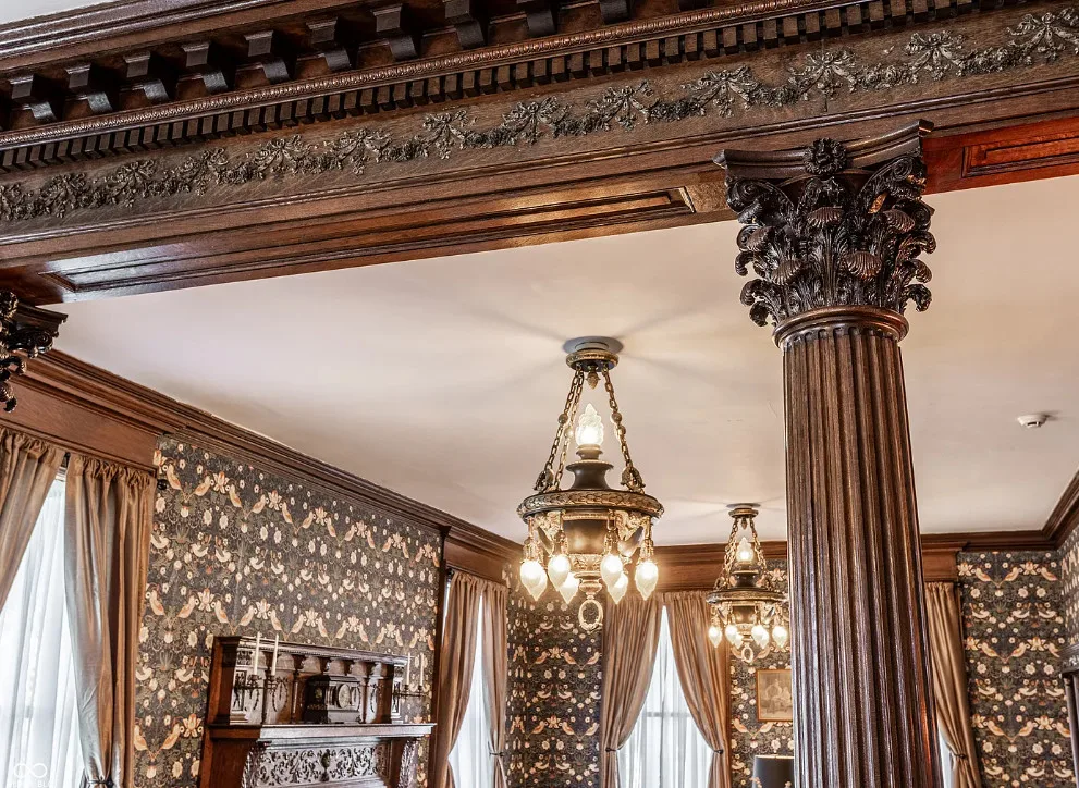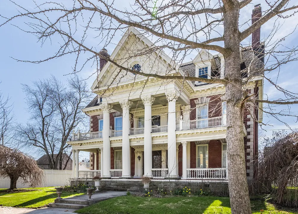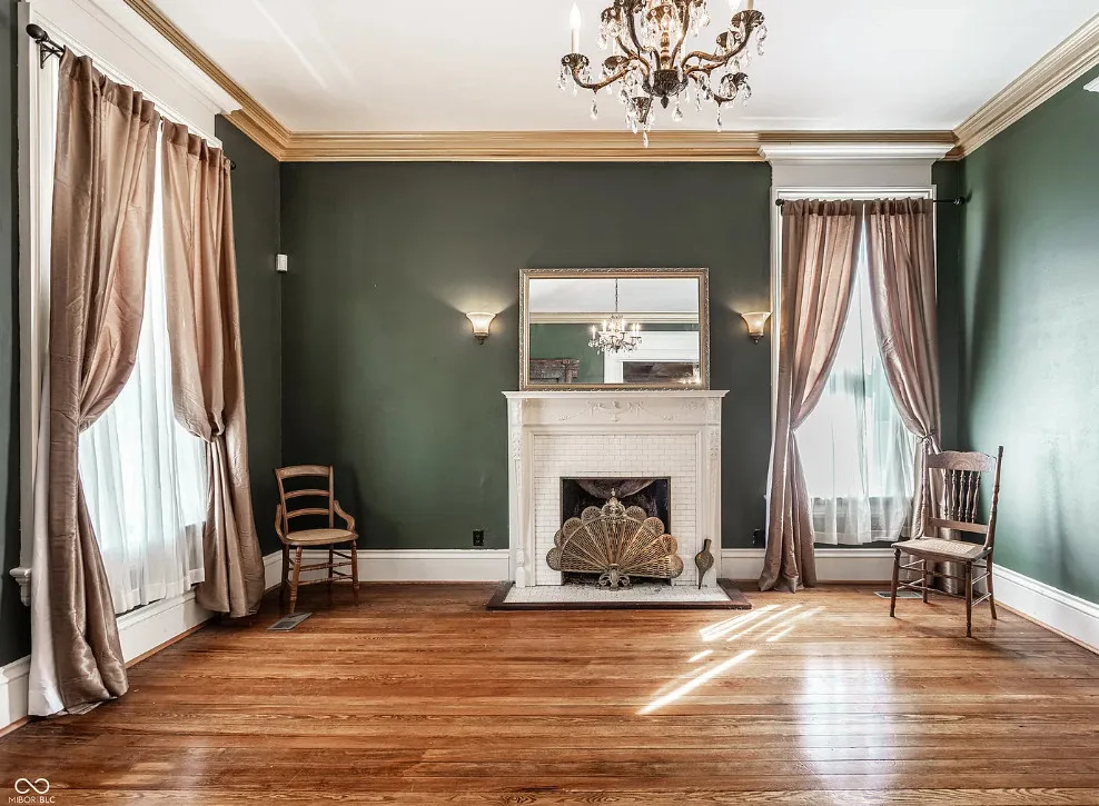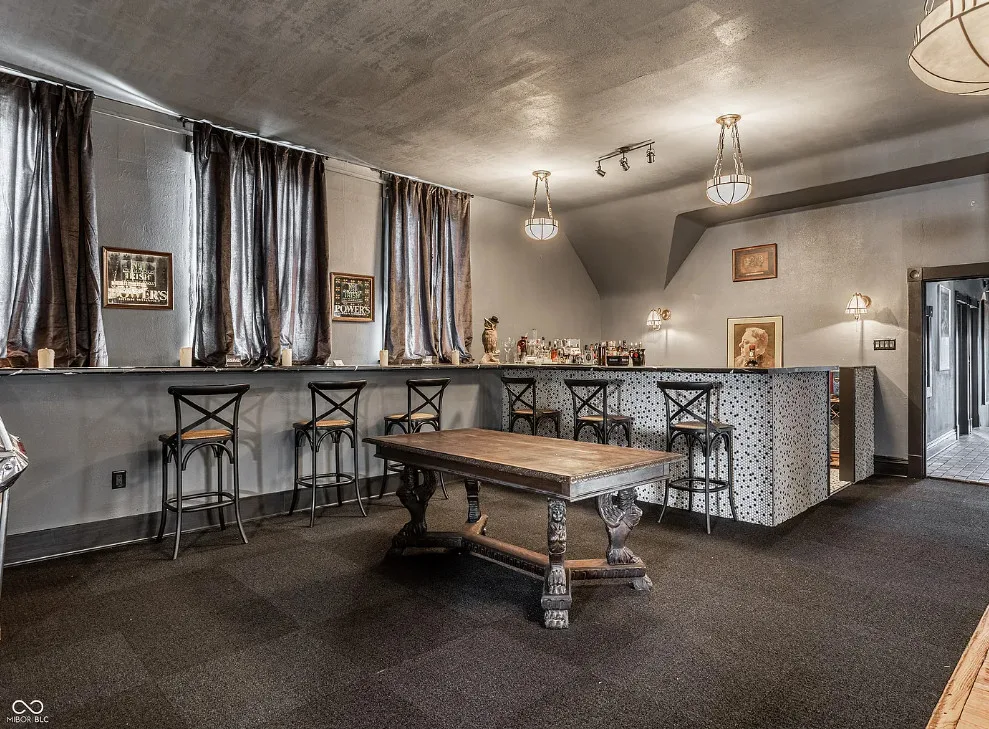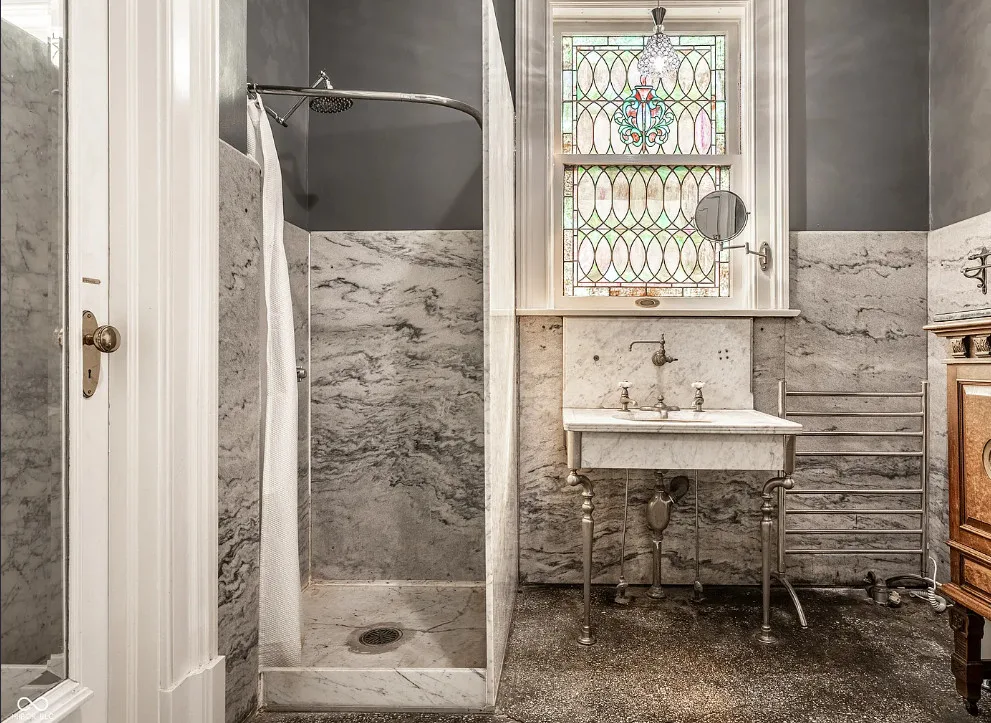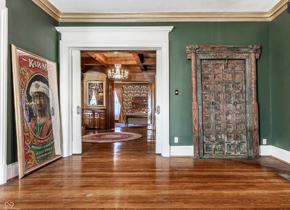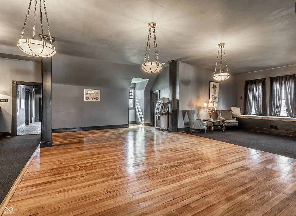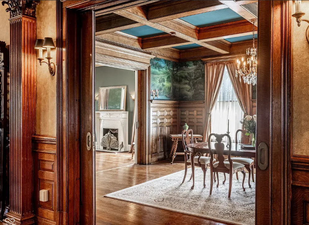 The Charles Over Mansion | Keystone of Muncie’s Emily Kimbrough Historic District A rare opportunity to own one of the area’s most iconic historic estates, where timeless architecture, a hidden third-floor ballroom, and modern luxury converge. Meticulously restored, this 1902 Georgian Revival and Neo-Classical landmark offers a level of craftsmanship and presence rarely found. Built by industrialist Charles Over (founder of Over Glass Works), the brick mansion makes an unforgettable 1st impression with grand Corinthian columns, an expansive front porch, and matching second-level portico. Inside, original terrazzo floors welcome you into the vestibule. A breathtaking solid oak and ornate leaded glass entry opens into an interior of luxurious Victorian grandeur. Original hardwood floors, curated ornate gilded bronze, crystal chandeliers and other authentic period lighting carry throughout. The main level flows effortlessly from the grand entrance hall, surrounded by a formal dining room with oak wainscoting, panoramic murals, coffered ceiling, a drawing room and parlor with fireplaces, ornate pediments, oak pillars and seven original oak pocket doors. Original marble bathroom sinks, claw-foot tub, leaded and stained glass, and a grand fireplace atop the grand staircase with dual built-in bench seating, all showcasing exceptional craftsmanship. The 3rd floor offers a true showpiece, an immersive speakeasy-style retreat with Chicago brick floors, guest bedroom, full bath with soaking tub, and a stunning ballroom featuring an expansive dance floor, stage, wet bar, and media lounge. Painstakingly preserved, restored and thoughtfully modernized with 4 zoned high-efficiency HVAC systems, chef’s kitchen featuring commercial-grade appliances, and unusually generous closet space throughout. Located in the revitalizing Emily Kimbrough Historic District, moments from downtown Muncie’s dining, shops, and culture. A legacy property for the next fortunate steward.