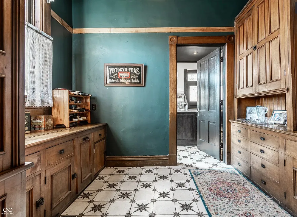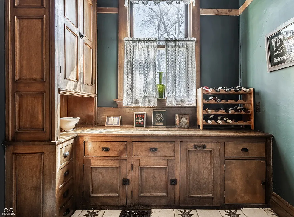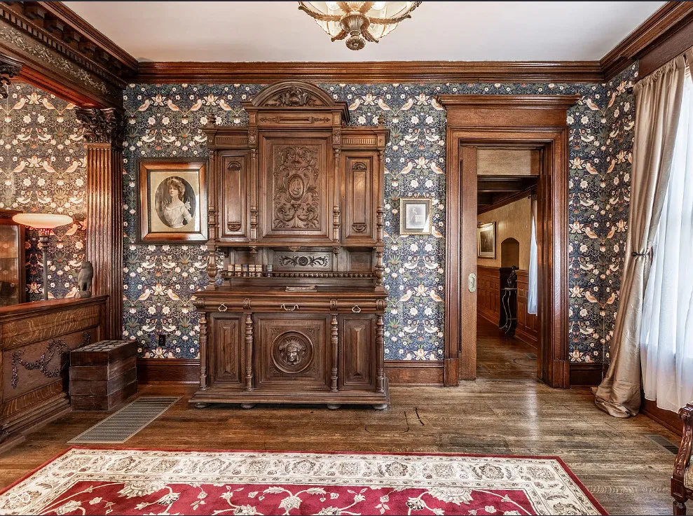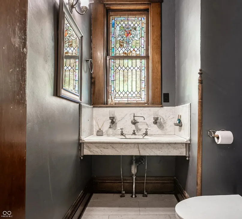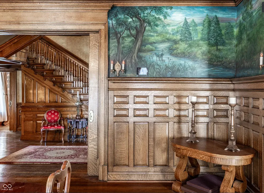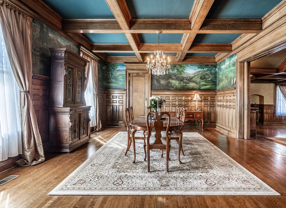 This house has some beautiful woodwork! And how about that stained glass! This is a huge house with 15,000 square feet of living space. The Charles Over mansion was built in 1902. It is located pm /39 acre in Muncie, Indiana. Charles Over was owner of Over Glass Works. The house features double front porches, grand entryway with leaded glass, wood floors, ornate crown moulding, coffered ceiling, beautiful staircase, stained glass, paneled wainscoting, pocket doors, vintage light fixtures, wide baseboards and amazing bathrooms sinks. There is an attached garage. Six bedrooms, four bathrooms and 15,267 square feet. $749,995