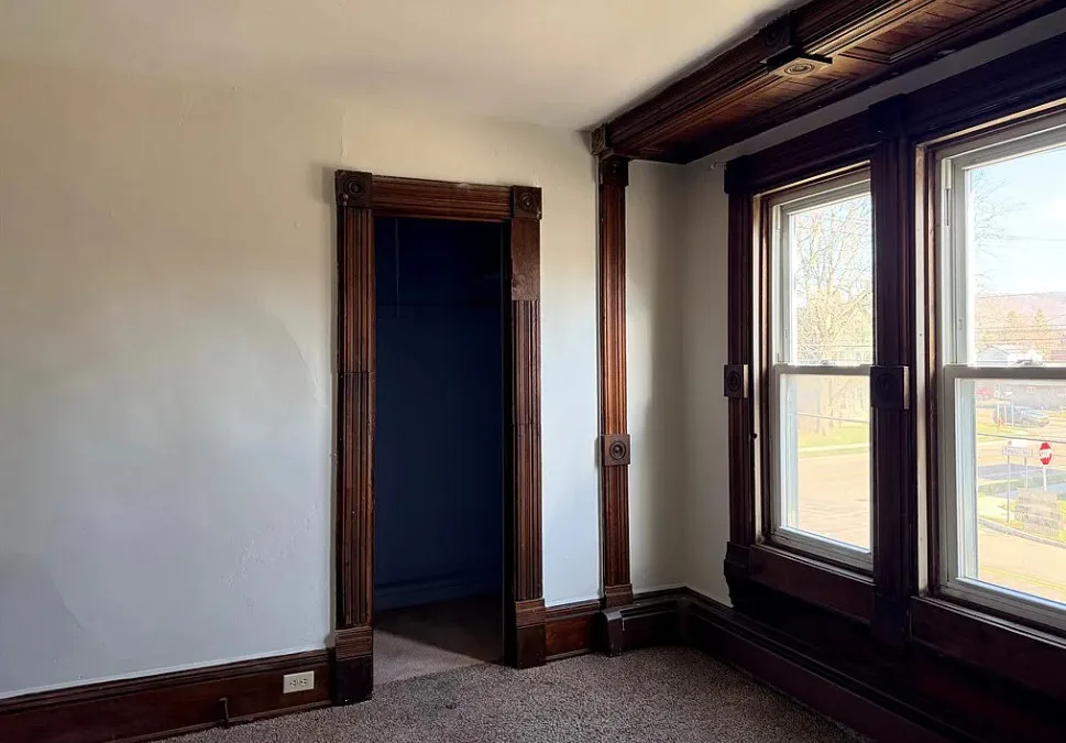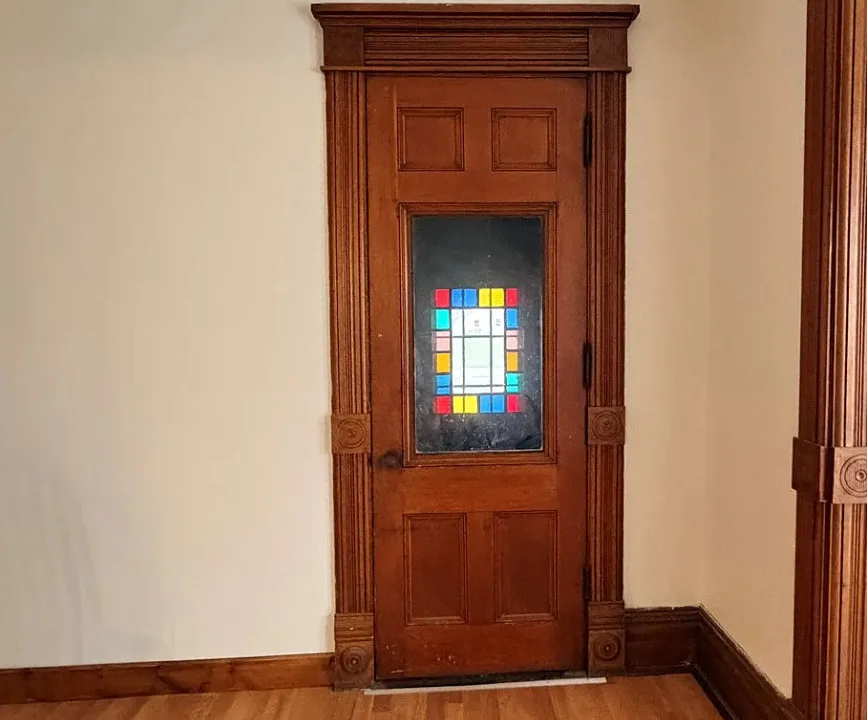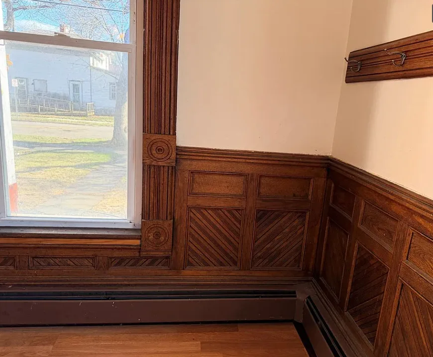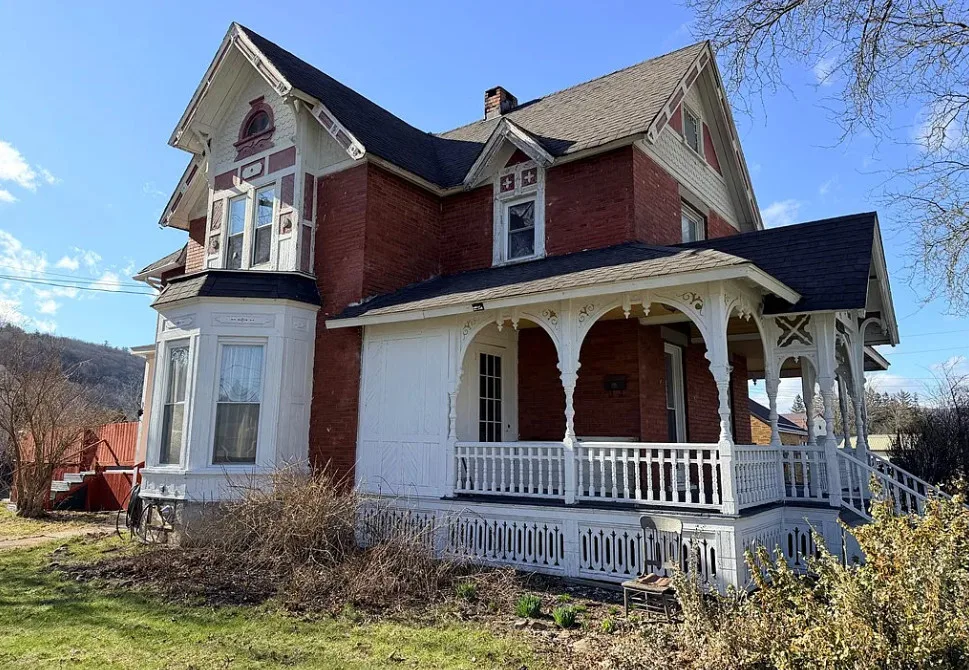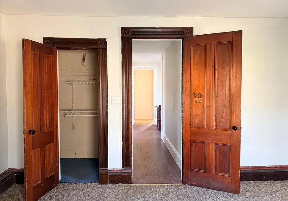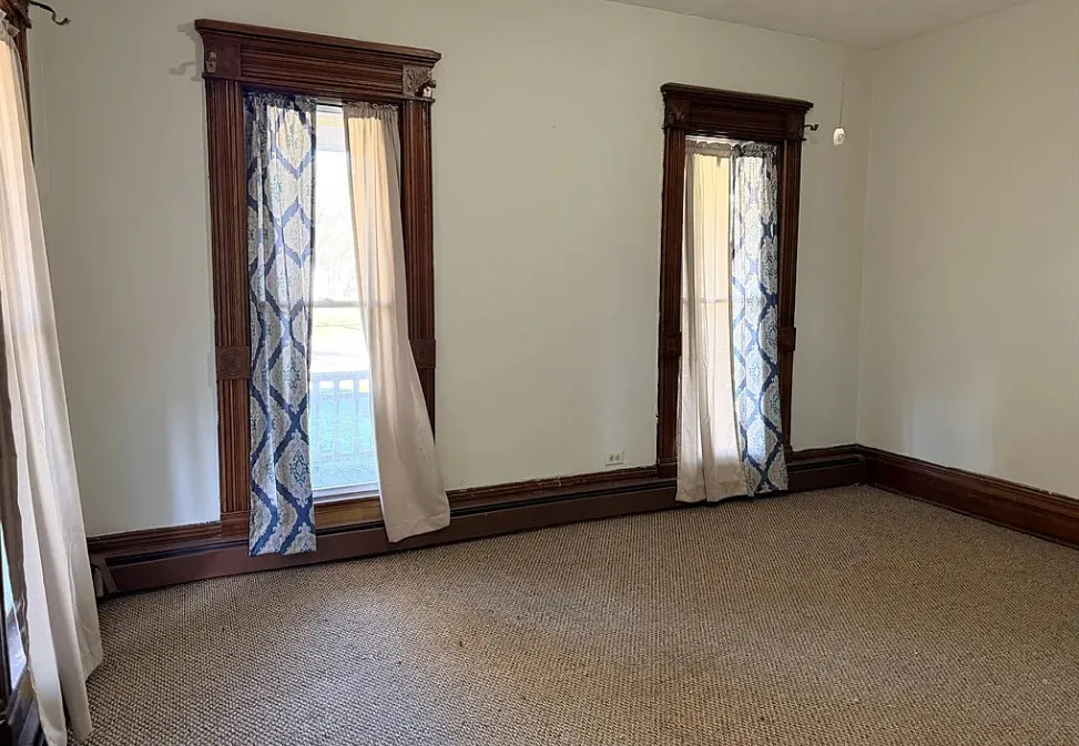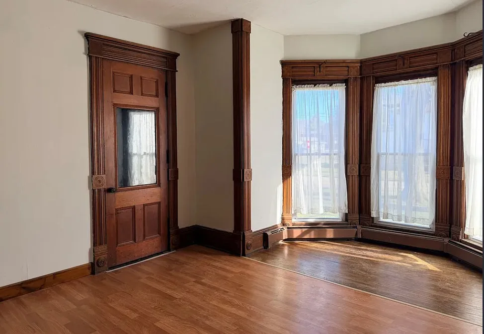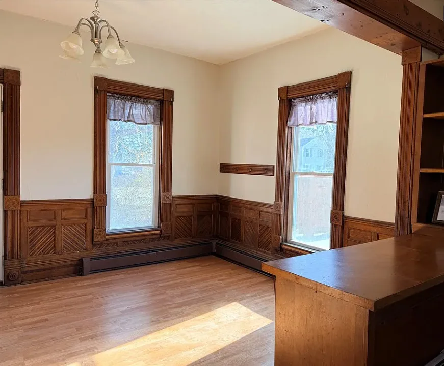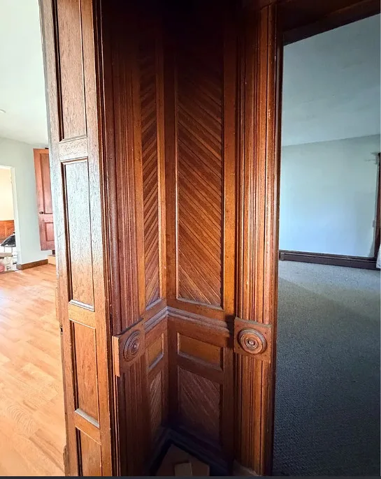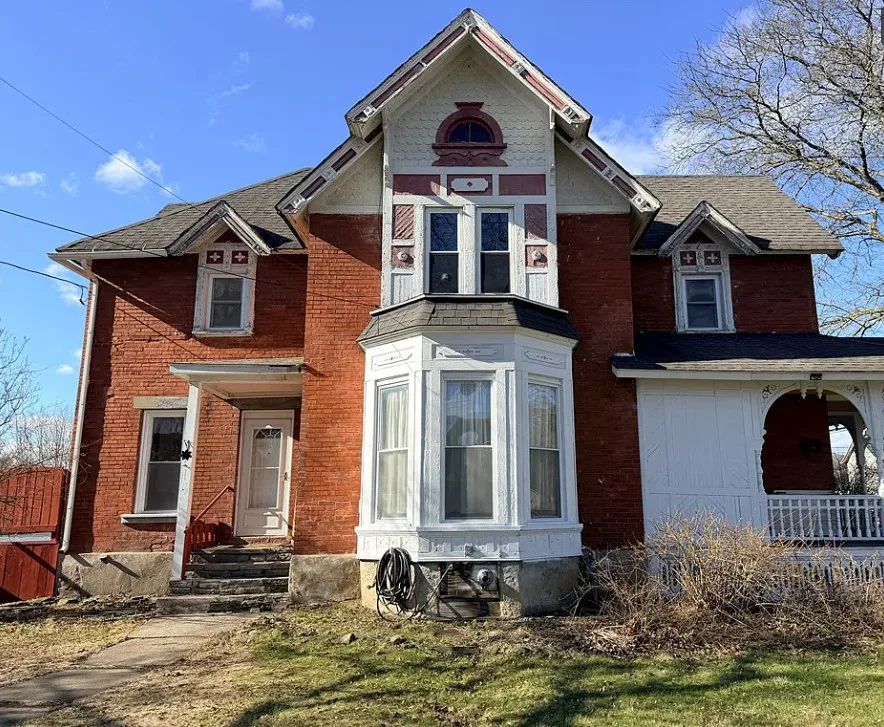 This house has some beautiful woodwork! I love the old picture! The house was built in 1854. It is located in Canisteo, New York. The house features a large wrap around front porch, wood floors, ornate ceiling, wainscoting, baseboards, stained glass and gorgeous doors! Four bedrooms, two bathrooms and 1,872 square feet. $193,000
