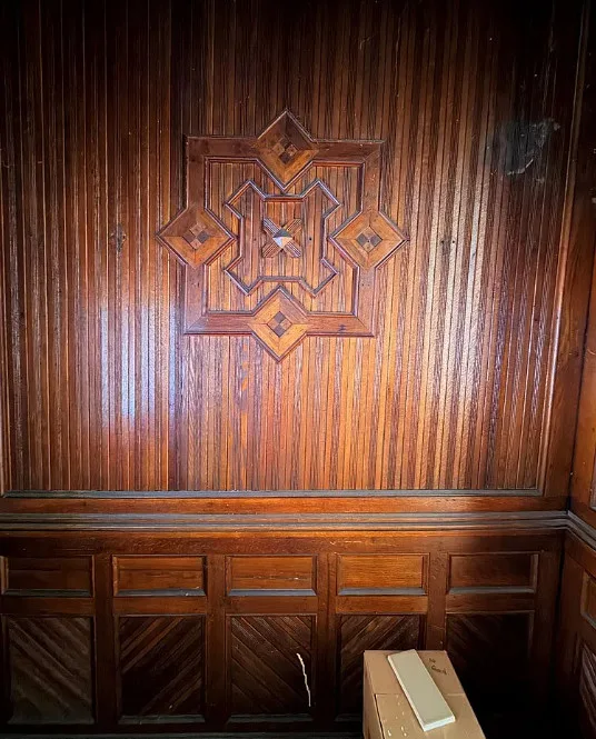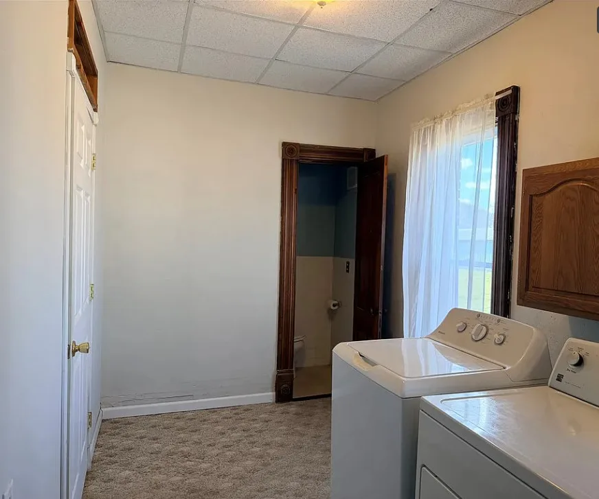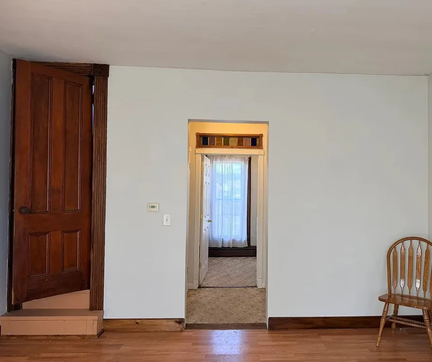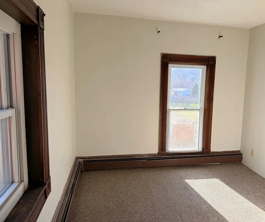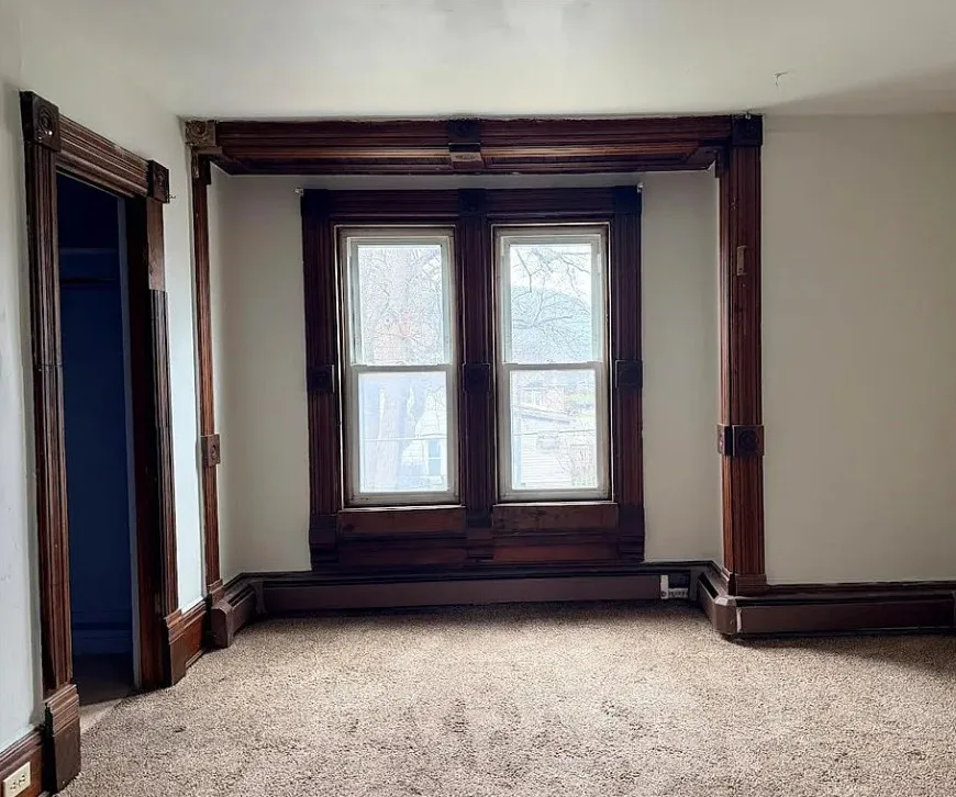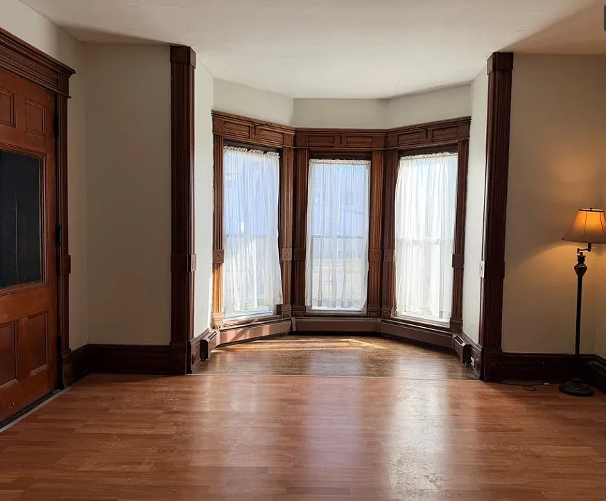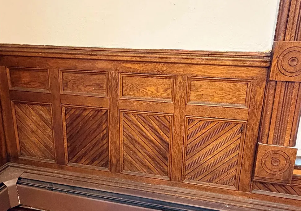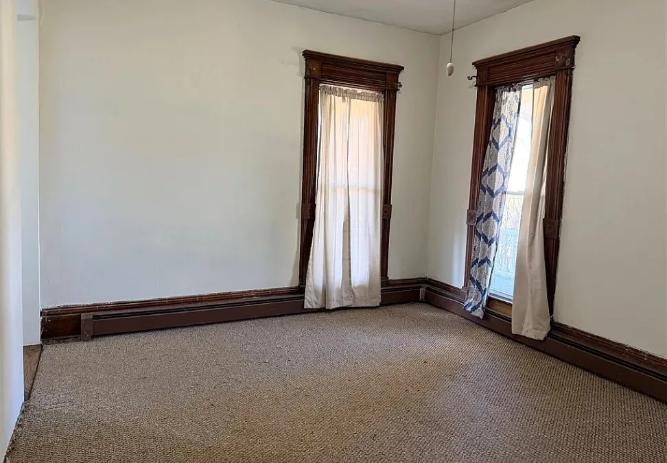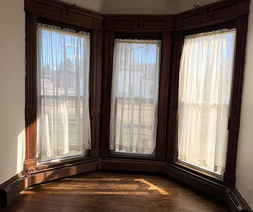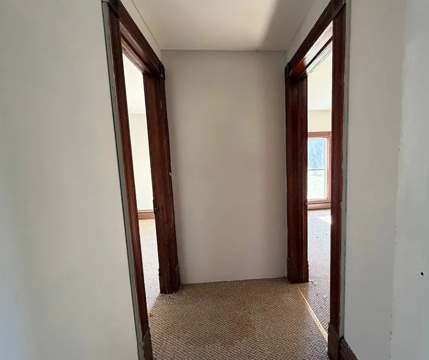 This house has some beautiful woodwork! I love the old picture! The house was built in 1854. It is located in Canisteo, New York. The house features a large wrap around front porch, wood floors, ornate ceiling, wainscoting, baseboards, stained glass and gorgeous doors! Four bedrooms, two bathrooms and 1,872 square feet. $193,000
