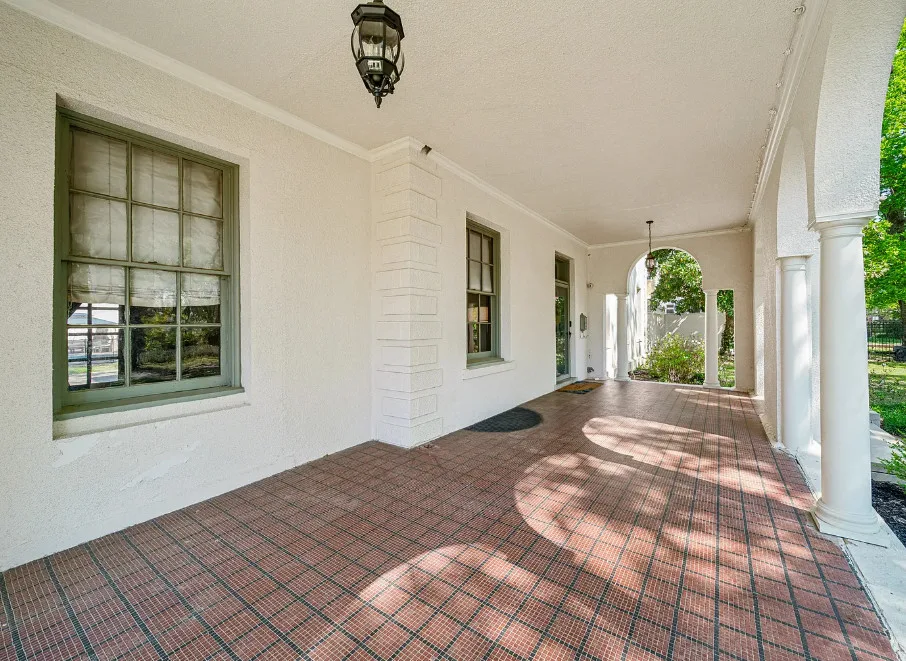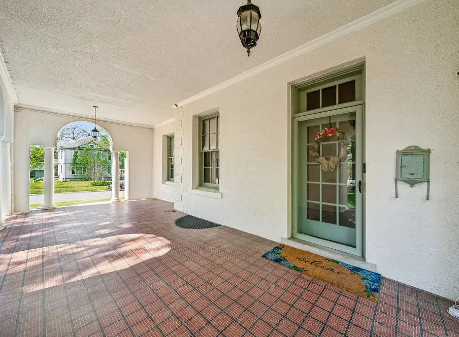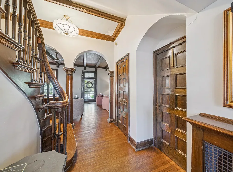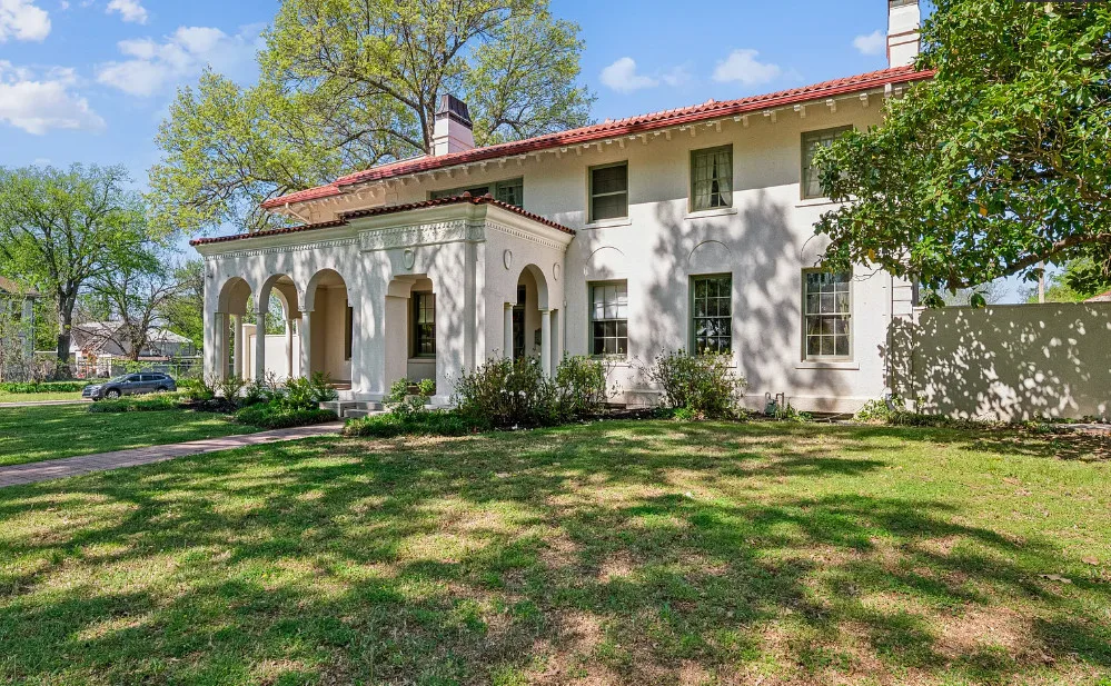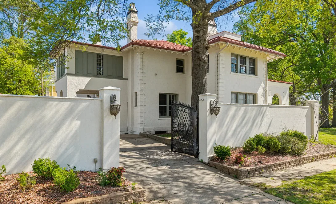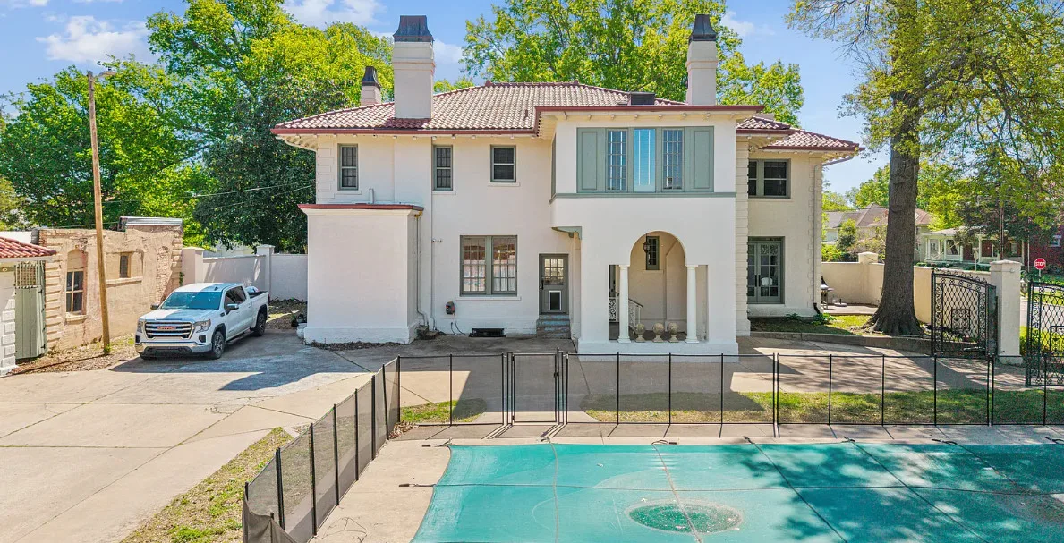 This is a really pretty home! I love the pretty interior details! There is a guest apartment and a large in-ground pool. The property is gated. The house was built in 1920. It is located on .54 acre in Muskogee, Oklahoma. The house features a gated entrance, pretty curb appeal, a covered front porch, wood floors, exposed beams, arched entryways, beautiful fireplace, grand staircase, crown moulding, solid wood doors, crystal chandeliers, ceiling medallions and huge walk in closets. There is a detached guest apartment, a porte cochere and a large in-ground pool. Three bedrooms, two bathrooms and 4,147 square feet. $335,000