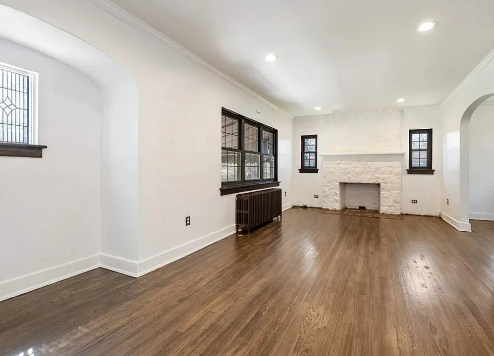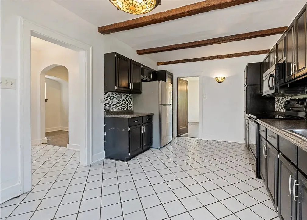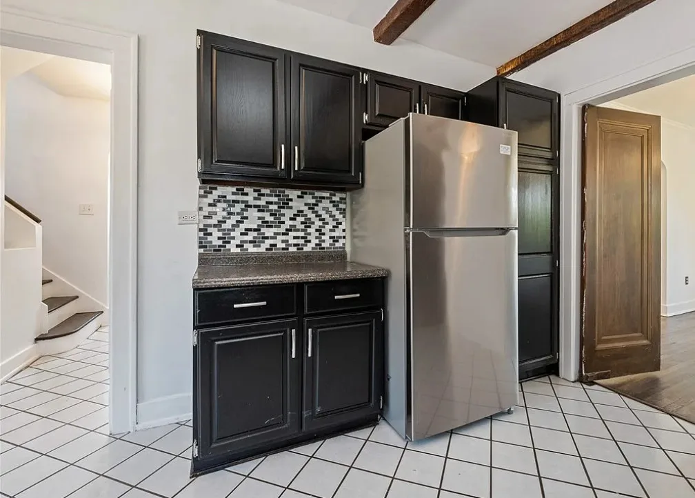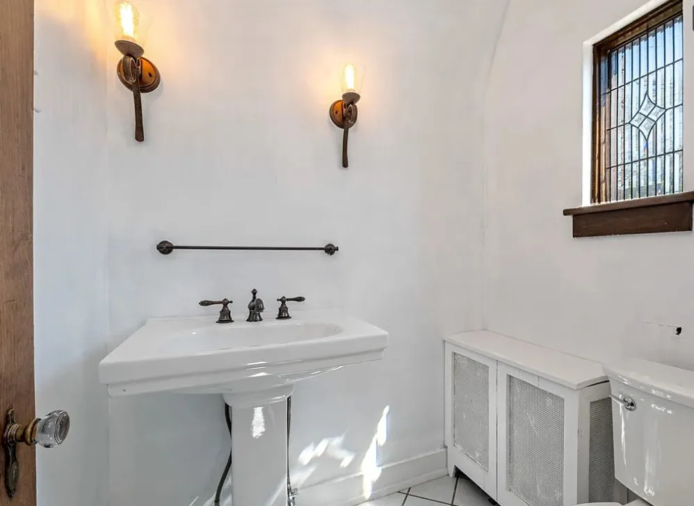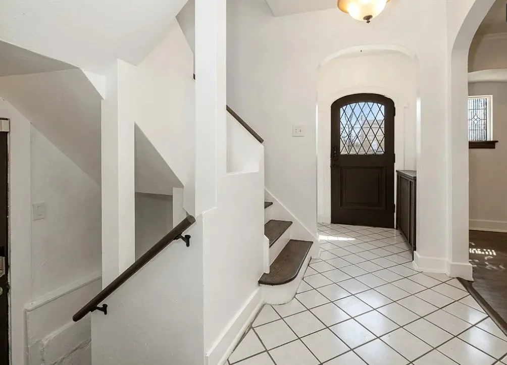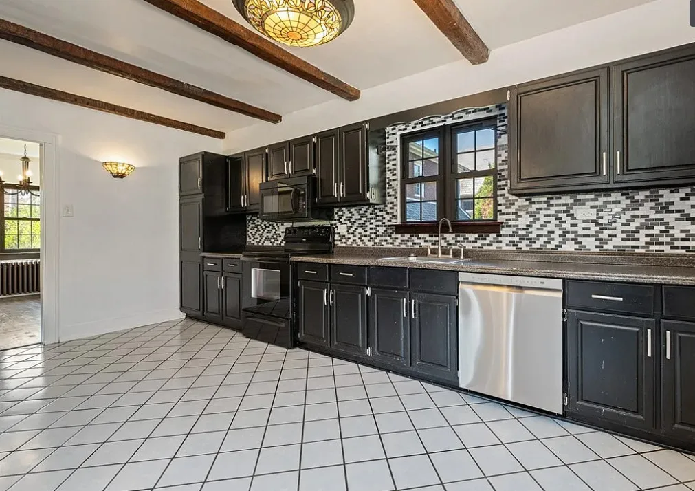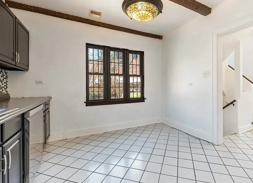 This is a pretty house! I love the exterior! The kitchen and foyer floor, yes or no? The house was built in 1930. It is located in Verona, Pennsylvania. The house features a partially covered front porch, wood floors, crown moulding, baseboards, unique fireplace, leaded glass and a large finished basement. There is a detached garage on the property. The interior could use some color, but that is an easy fix. Three bedrooms, three bathrooms and 1,460 square feet. $225,000