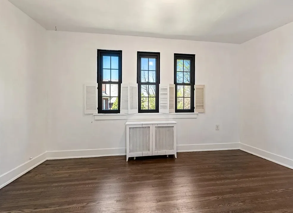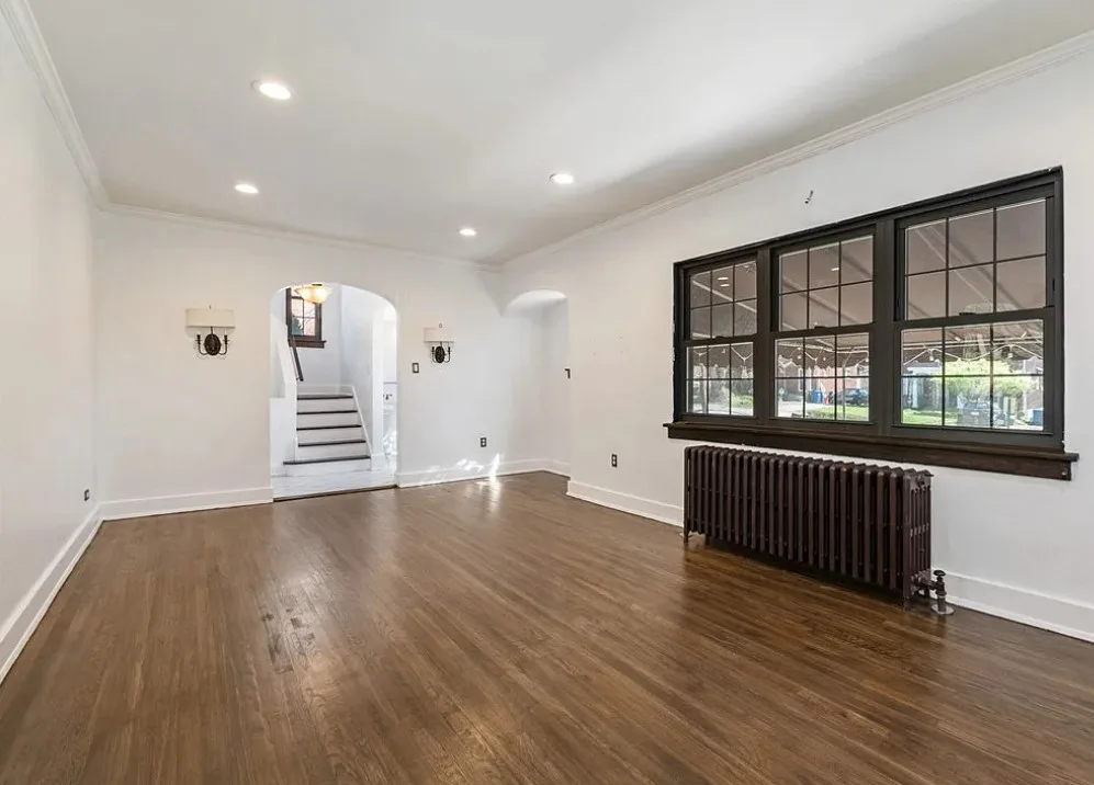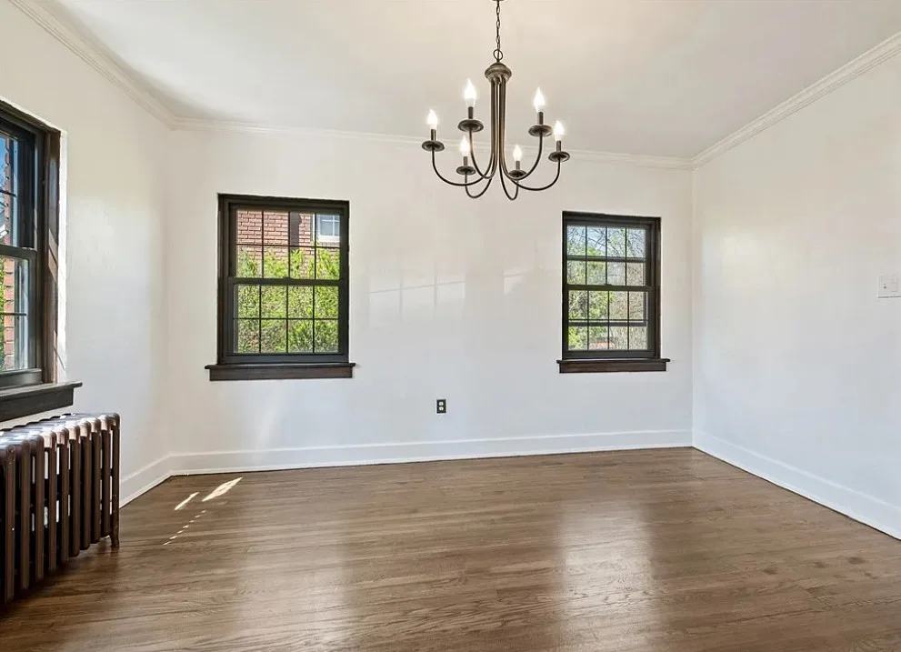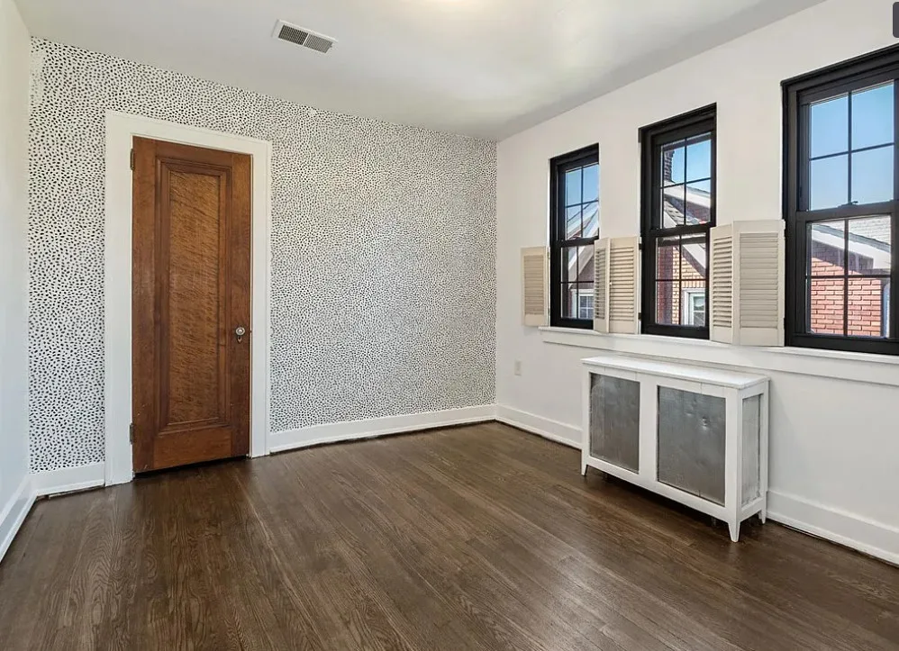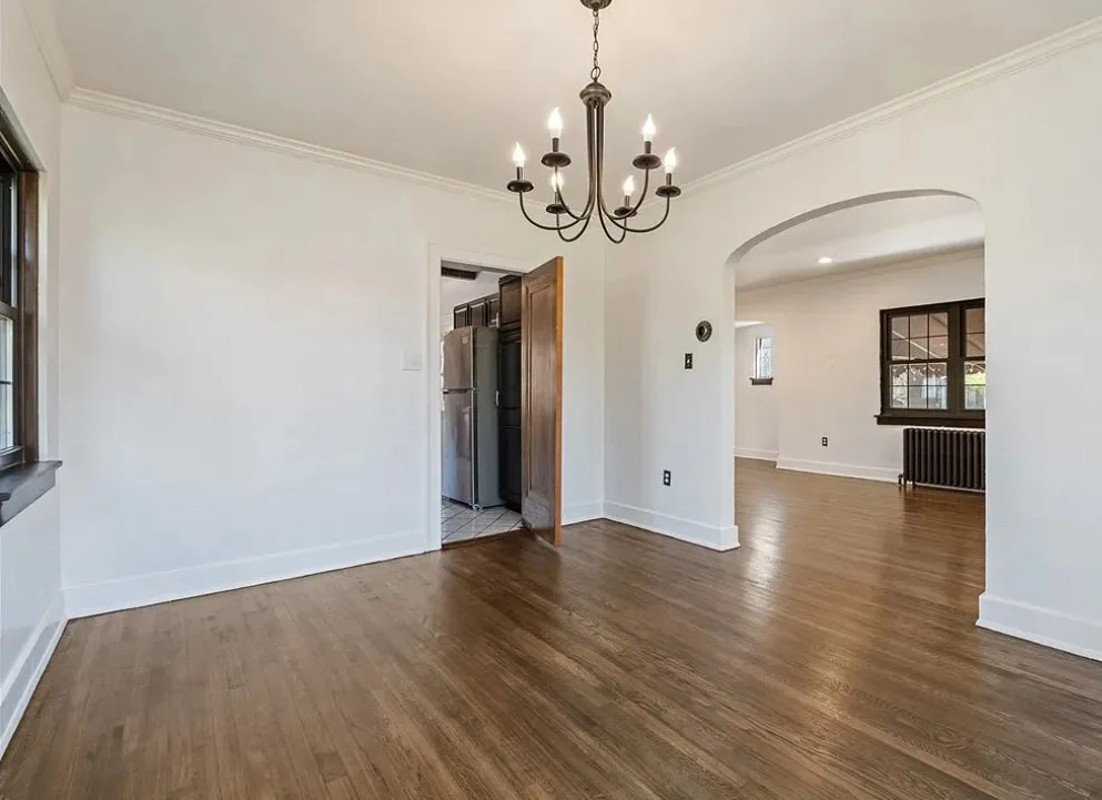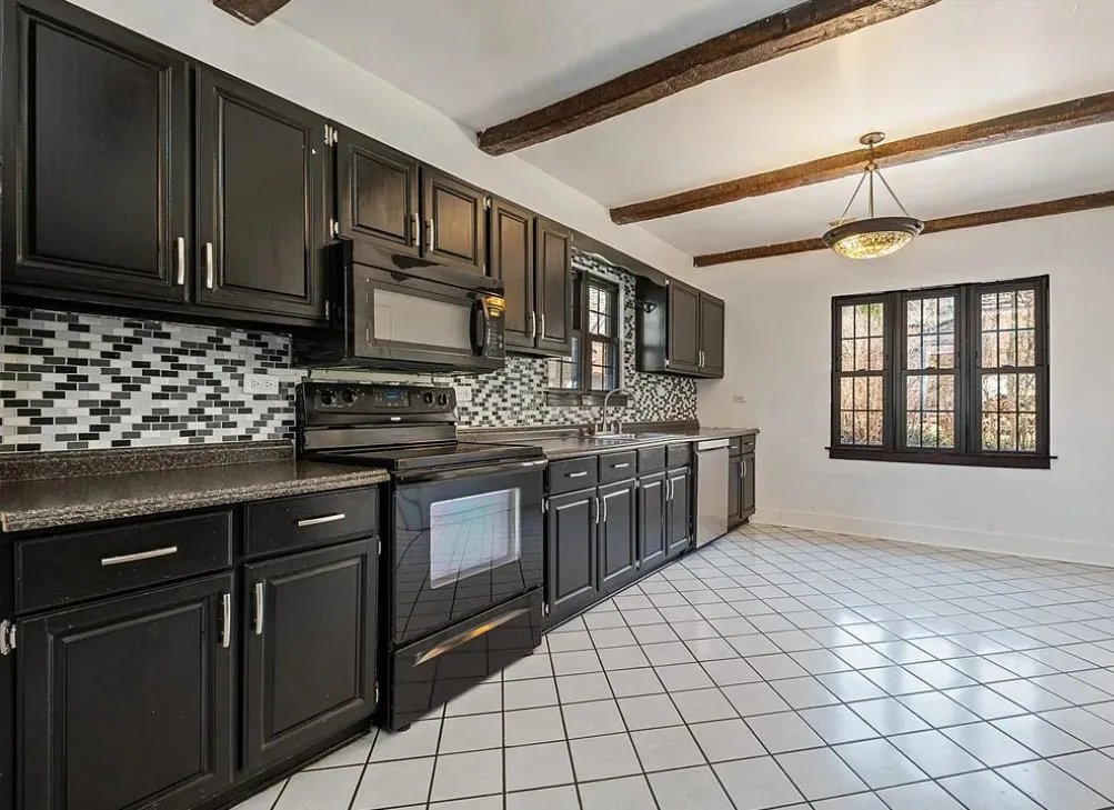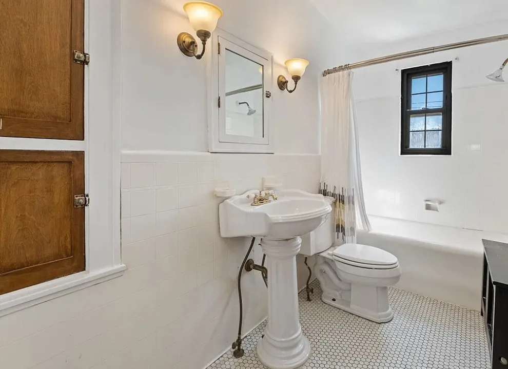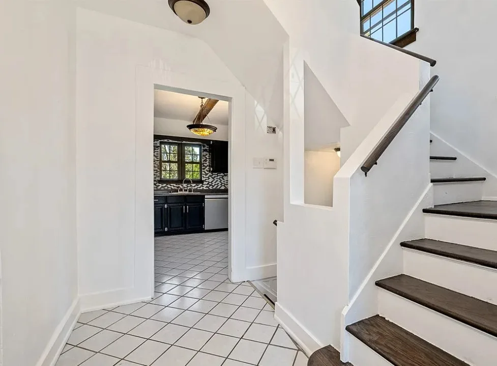 This is a pretty house! I love the exterior! The kitchen and foyer floor, yes or no? The house was built in 1930. It is located in Verona, Pennsylvania. The house features a partially covered front porch, wood floors, crown moulding, baseboards, unique fireplace, leaded glass and a large finished basement. There is a detached garage on the property. The interior could use some color, but that is an easy fix. Three bedrooms, three bathrooms and 1,460 square feet. $225,000