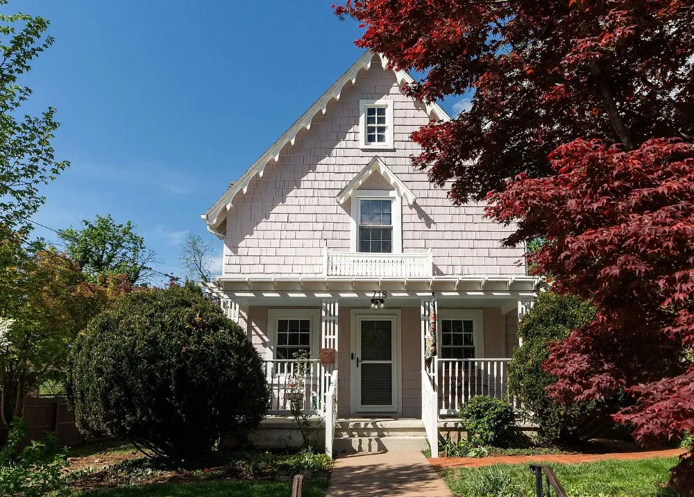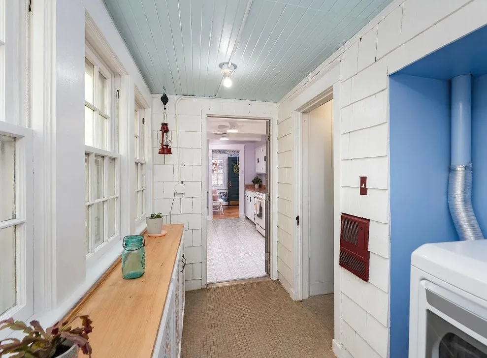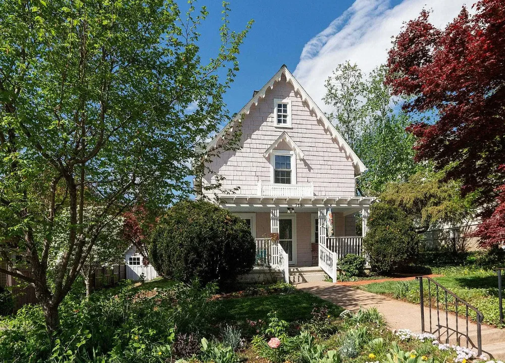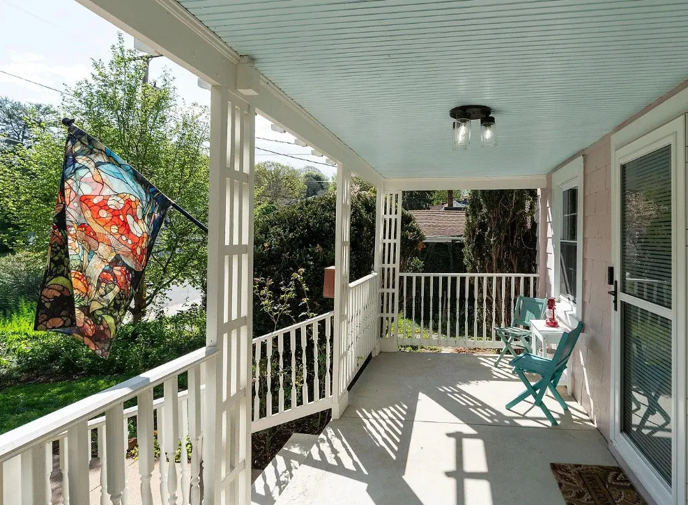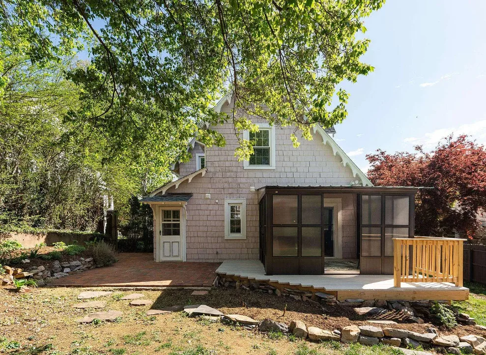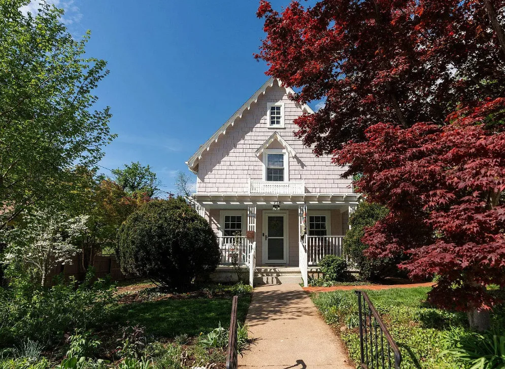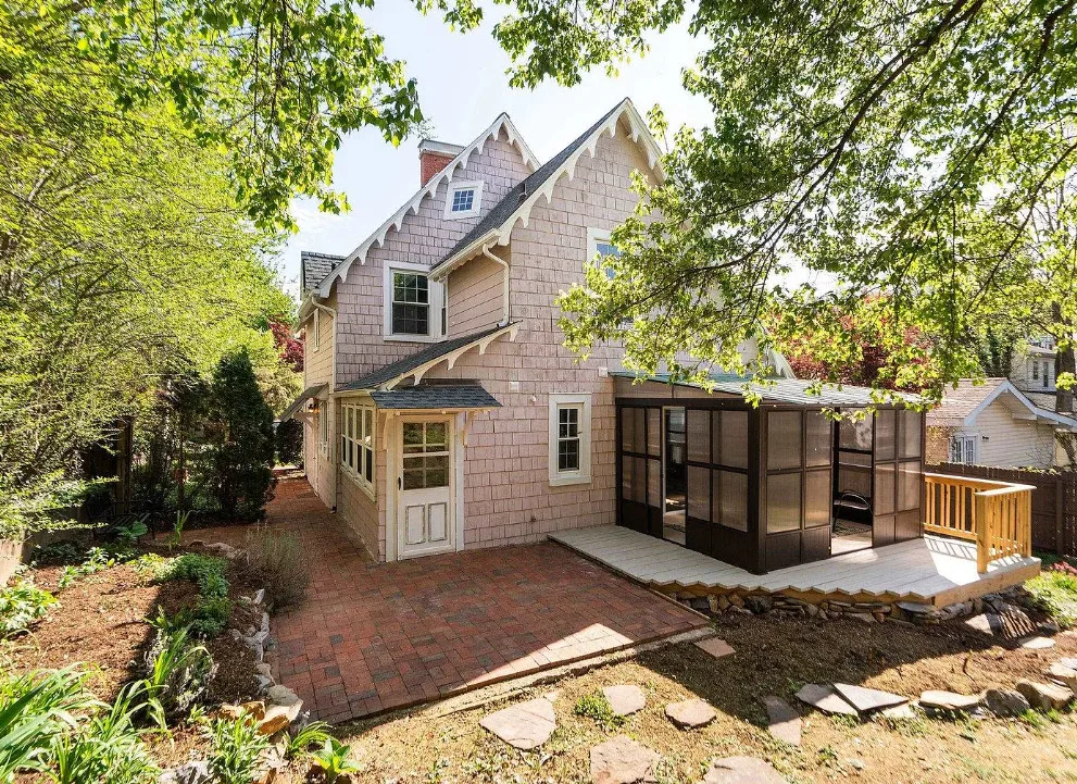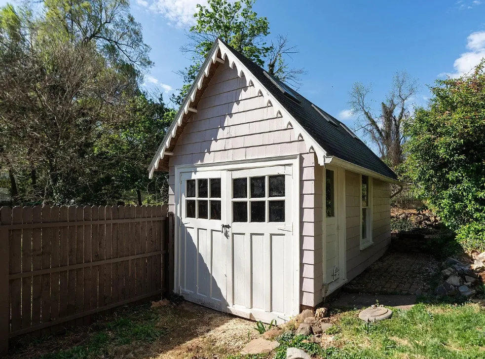 This looks like a fairytale house and it has an interesting history! It was built by TJ Collins of Collins Bros. It was originally built as a model home for the neighborhood, but this ended up being the one and only! So it is truly a one of a kind. While the house looks gothic and a bit earlier, it was built in 1927. Back then some builders were creating homes and neighborhoods that looked older than they were. The house is located in Staunton, Virginia. The house features a covered front porch, wood floors, baseboards, vintage stove, a lot of natural light, pressed tin ceiling and an enclosed back porch. There is a great shed in the backyard that matches the house. This home could use some of my pink roses climbing on that porch railing. Three bedrooms, two bathrooms and 1,852 square feet. $375,000