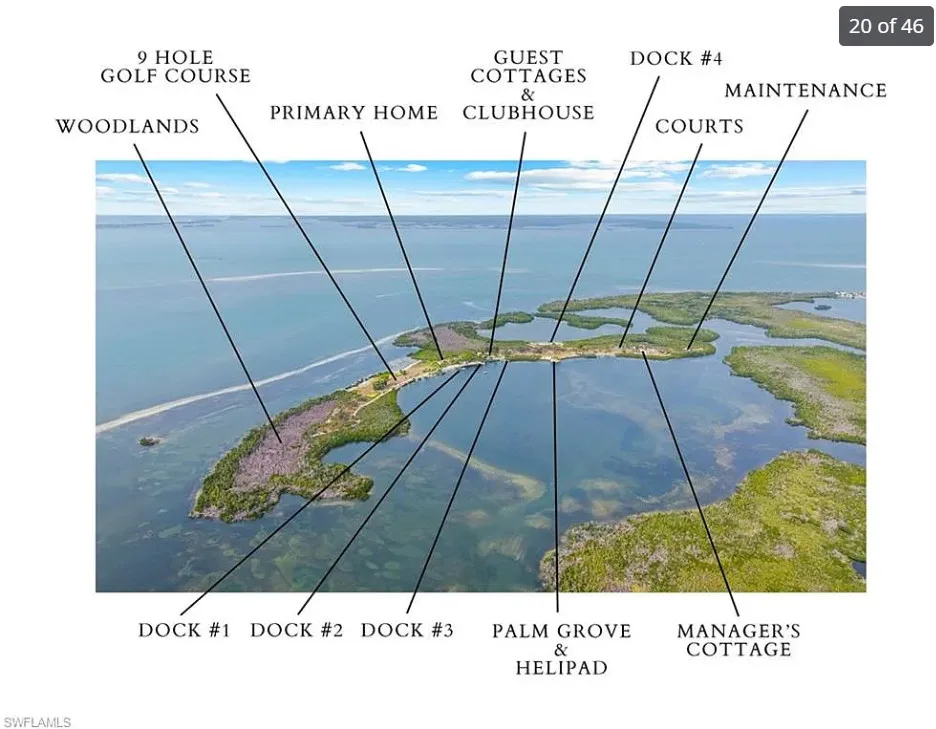 Burgess Island is one of Florida’s most significant private island estates, conveniently positioned in Pine Island Sound between Sarasota and Naples. Spanning approximately 104 acres with extensive shoreline and unmatched privacy, the property presents an extraordinary opportunity for a singular private family compound, a corporate retreat, or an exclusive development, with its 29 developable lots. Centered around an updated 1920s Mizner-style residence, the island is complemented by four charming guest cottages, a clubhouse and pool, and a dedicated property manager’s cottage. There are a total of 11 bedrooms, 10 full and 3 half bathrooms across the island. Lifestyle amenities are equally compelling, featuring a private 9-hole golf course, a pickleball, tennis, and basketball sport court, along with four separate docks providing convenient water access. A helipad enhances accessibility, allowing seamless travel to and from the mainland. The level of infrastructure is rarely found in island offerings of this scale, including mainland power service, four onsite generators, and a reverse osmosis water system – providing both comfort and self-sufficiency. The property’s heritage is as remarkable as its physical attributes. Originally acquired in 1924 by renowned inventor and electrochemist Charles Frederick Burgess – a pioneer in dry-cell battery technology – the island has long been a destination for innovation and distinguished company. Thomas Edison himself visited and planted banyan trees that endure today as living landmarks of this legacy. Comprehensive amenities, flexible access, a convenient yet private location, and a storied past converge to make Burgess Island not merely a residence, but a rare and irreplaceable asset. Ideally positioned for the Southwest Florida lifestyle, the island offers immediate access to world-class tarpon fishing, exceptional boating, and kayaking through pristine waters, while remaining just moments from the historic Gasparilla Inn and championship golf. From your dock, cruise to Cabbage Key for a relaxed waterfront lunch or continue on to Boca Grande for an evening of dining and coastal charm—where nearby islands and waterways naturally extend the experience beyond the property. Located ~6 mi. to Gasparilla Inn & Golf Club, ~2 mi. Useppa Island, ~1 mi. to Four Winds Marina, ~5.5 mi. to Boca Grande Marina (Miller’s), ~11 mi. to Coral Creek Airport & Golf Club, ~19 mi. to Punta Gorda Airport (PGD), ~28 mi. to RSW, and ~45 mi. to Naples Airport (APF). The island is known as Little Bokeelia Island, Burgess Island, and Pentecost Island.