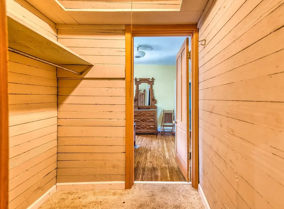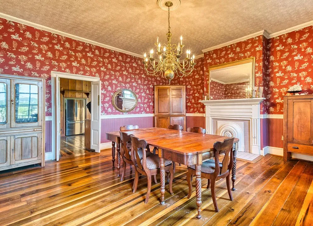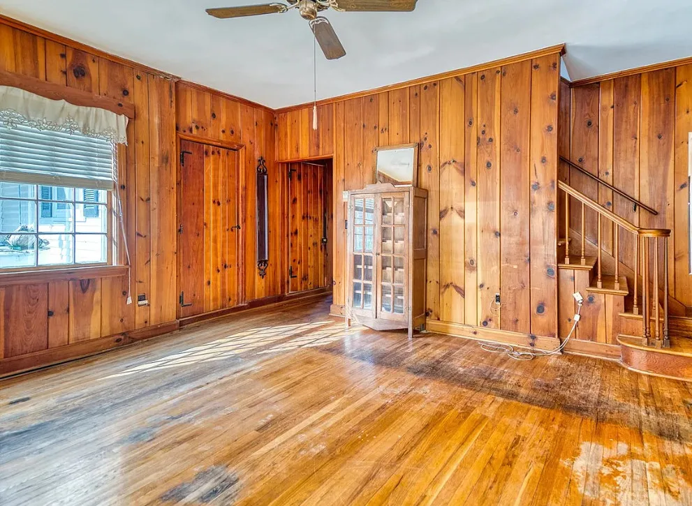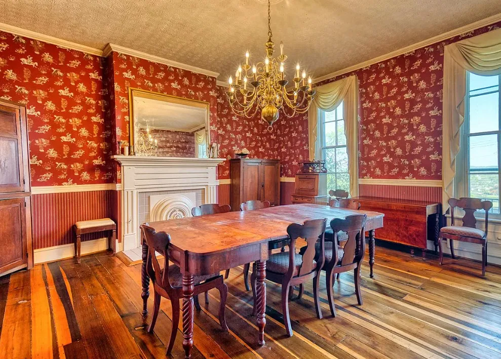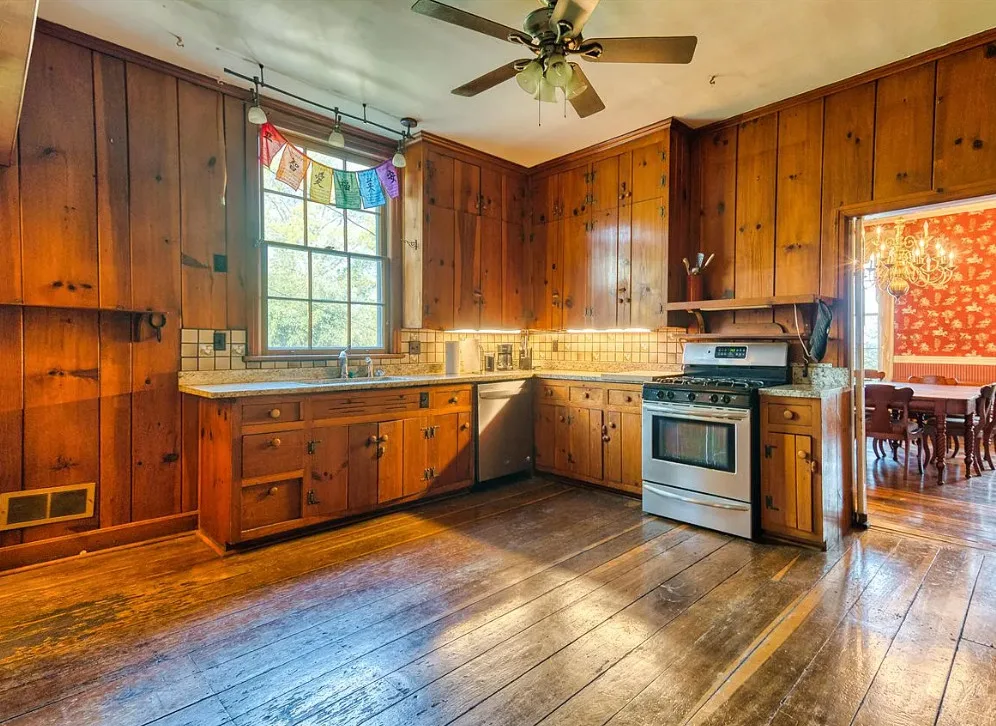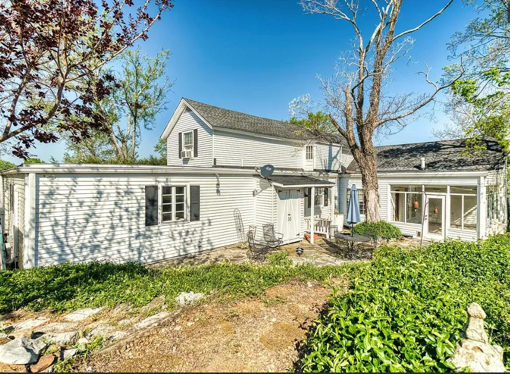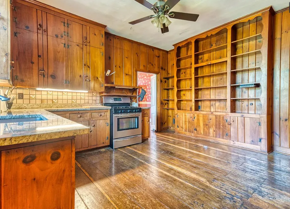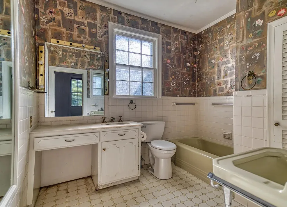 The pool was a nice surprise! The gazebo is nice. How about that bathroom wallpaper? Are you keeping it? This house was built in 1820. It is located on .66 acre in Russellville, Kentucky. The house features a small front porch, knotty pine, wood floors, built-in bookshelves, spacious kitchen, crown moulding, chair rails, wainscoting, original mantels, baseboards, double front doors, sunroom, one updated bathroom and one vintage bathroom. There is a nice backyard with an in-ground pool, gazebo and flagstone patio. Three bedrooms, two bathrooms and 3,157 square feet. $249,900
