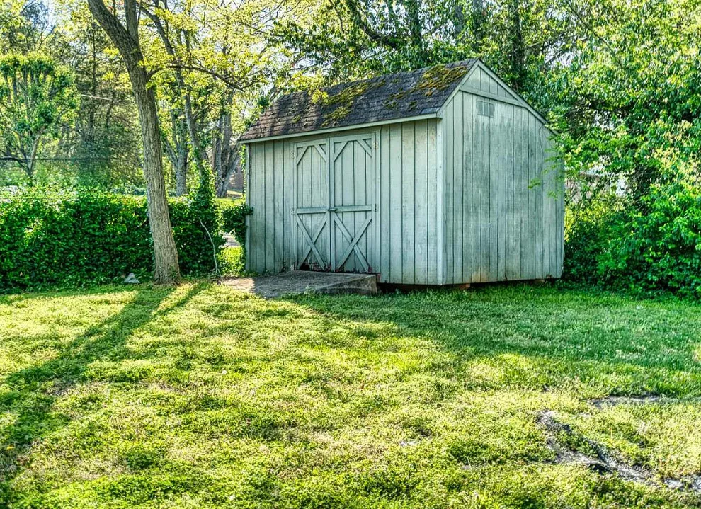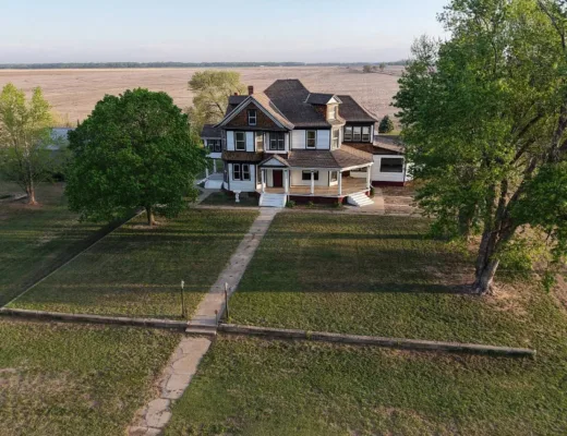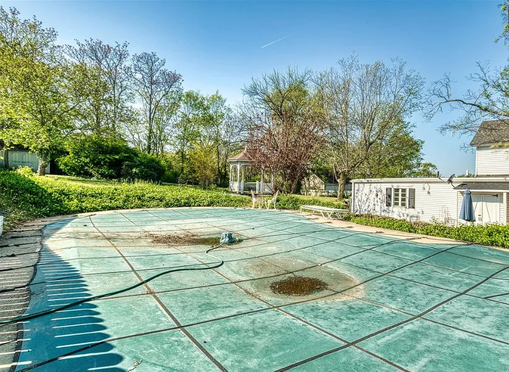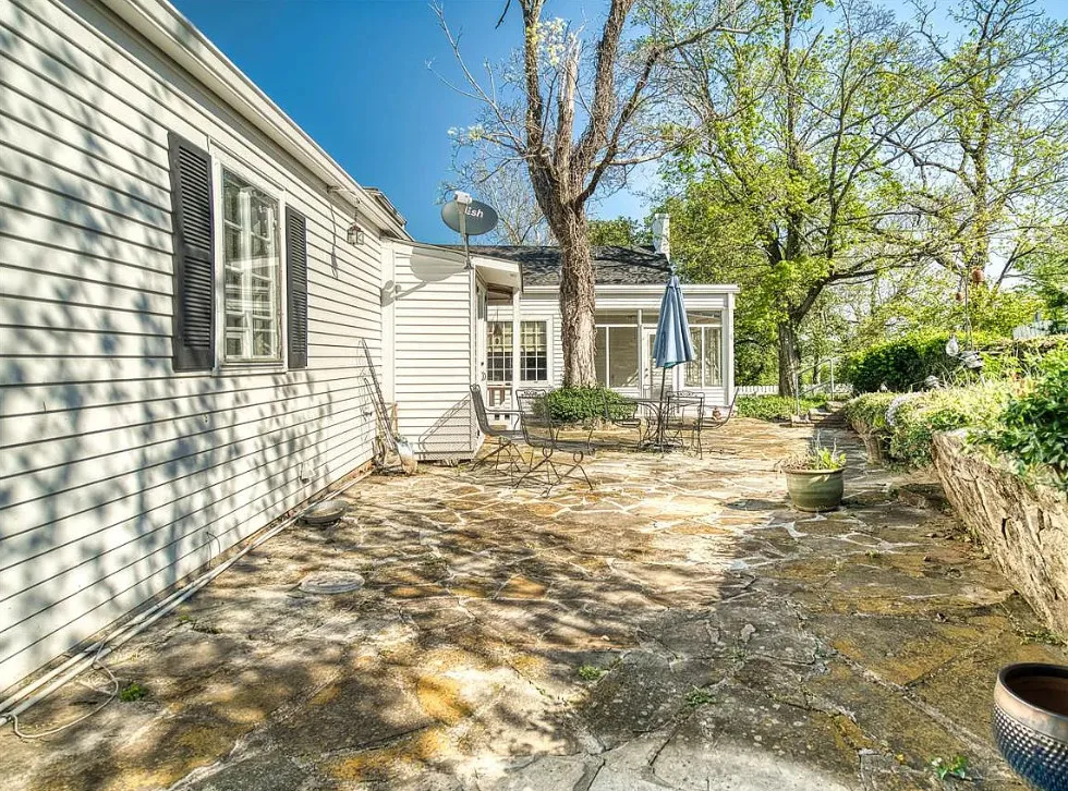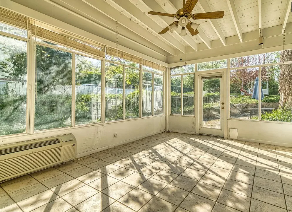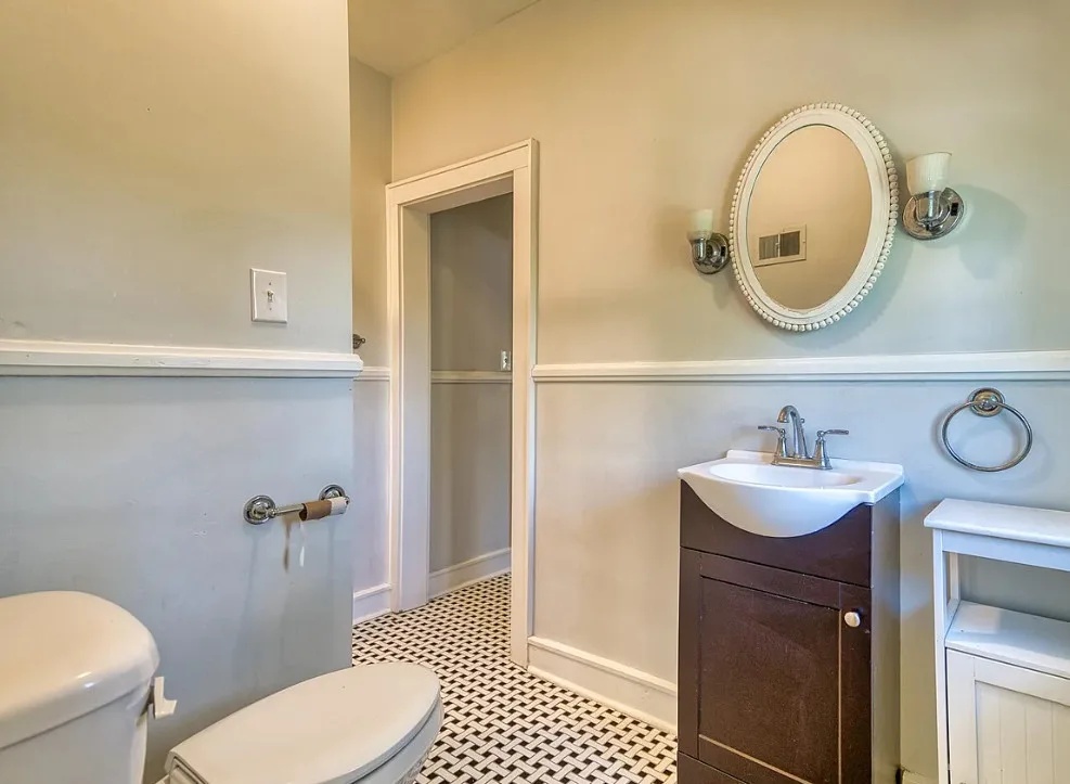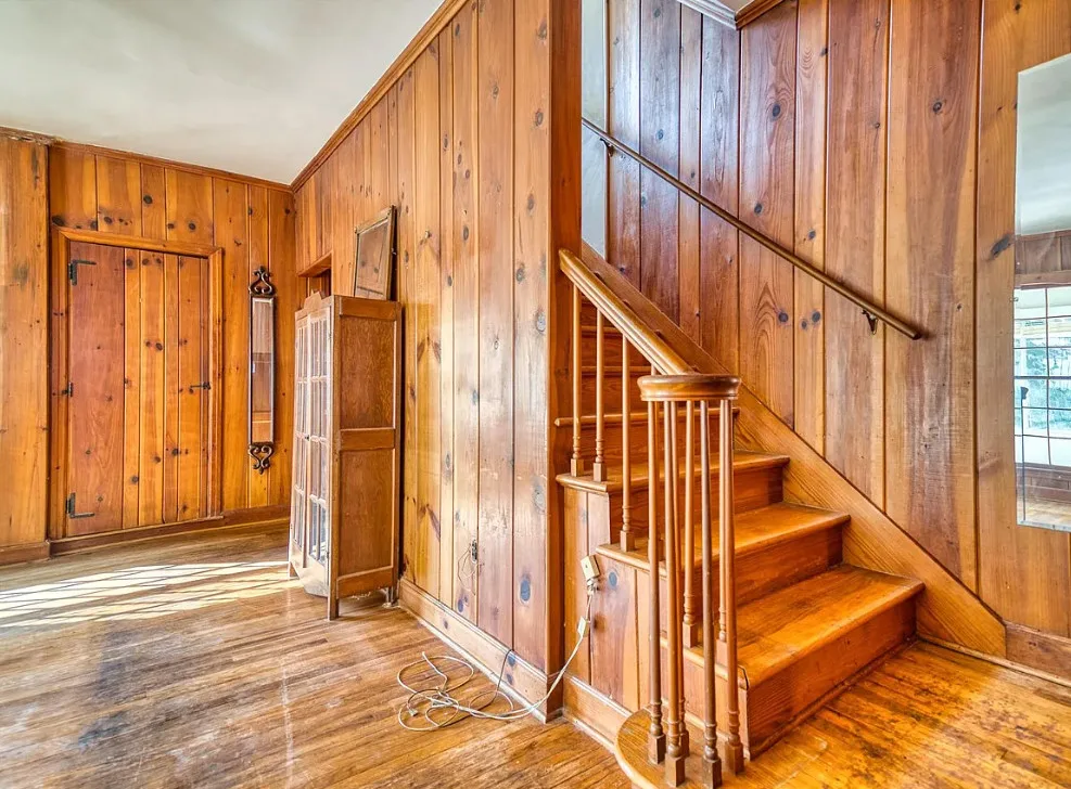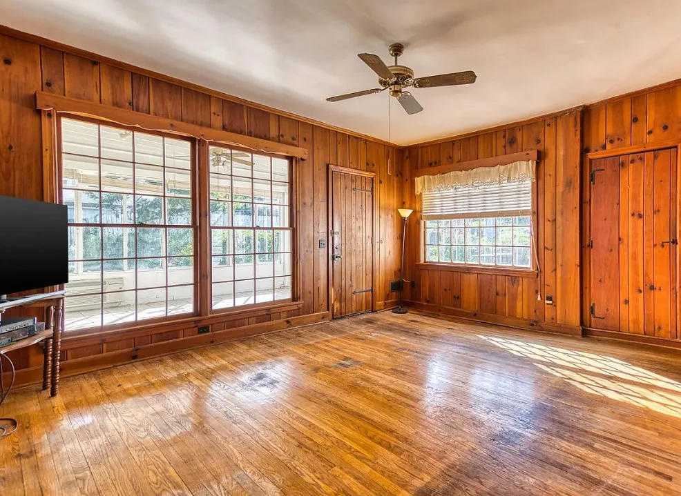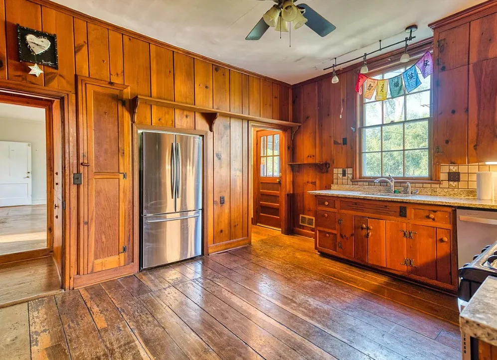 The pool was a nice surprise! The gazebo is nice. How about that bathroom wallpaper? Are you keeping it? This house was built in 1820. It is located on .66 acre in Russellville, Kentucky. The house features a small front porch, knotty pine, wood floors, built-in bookshelves, spacious kitchen, crown moulding, chair rails, wainscoting, original mantels, baseboards, double front doors, sunroom, one updated bathroom and one vintage bathroom. There is a nice backyard with an in-ground pool, gazebo and flagstone patio. Three bedrooms, two bathrooms and 3,157 square feet. $249,900