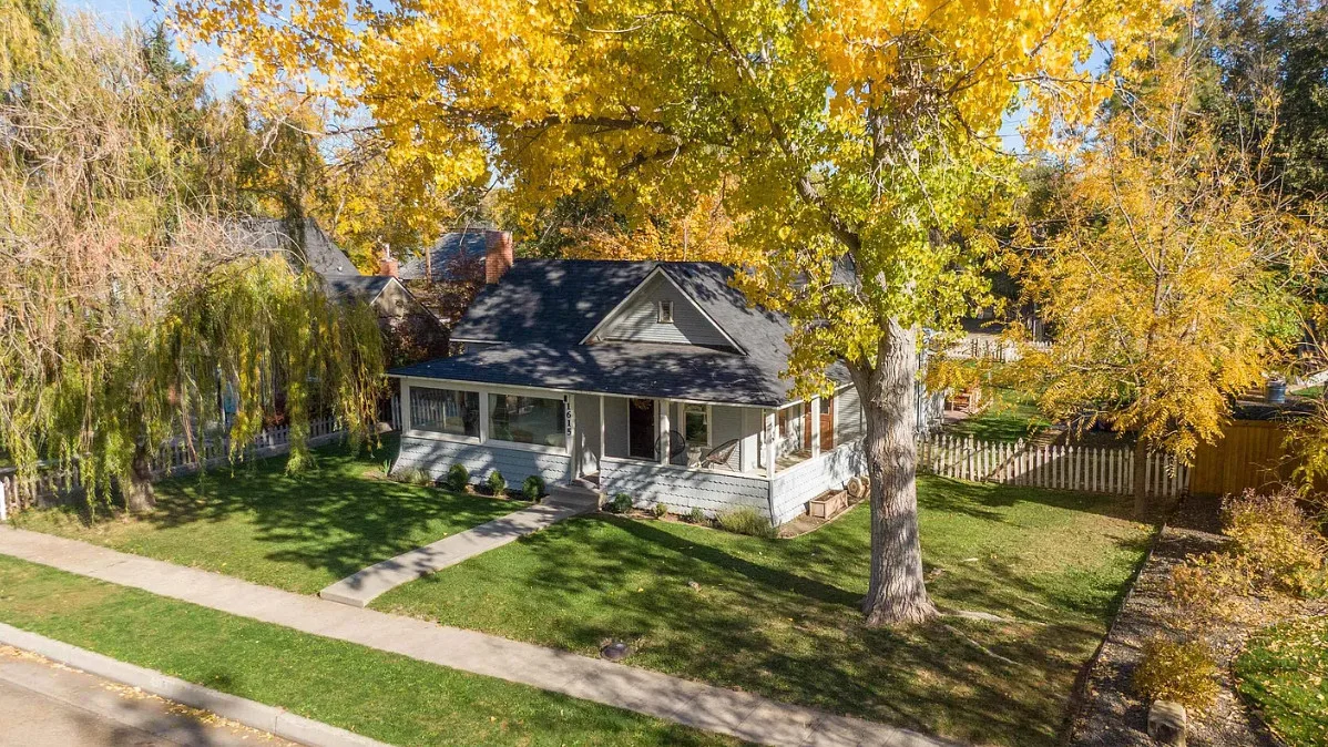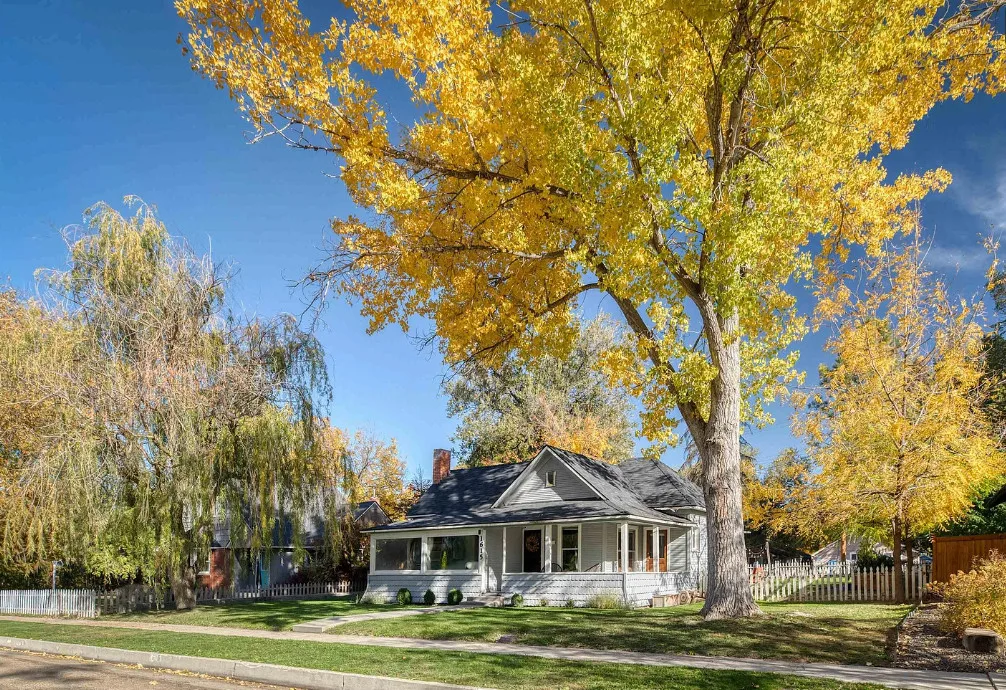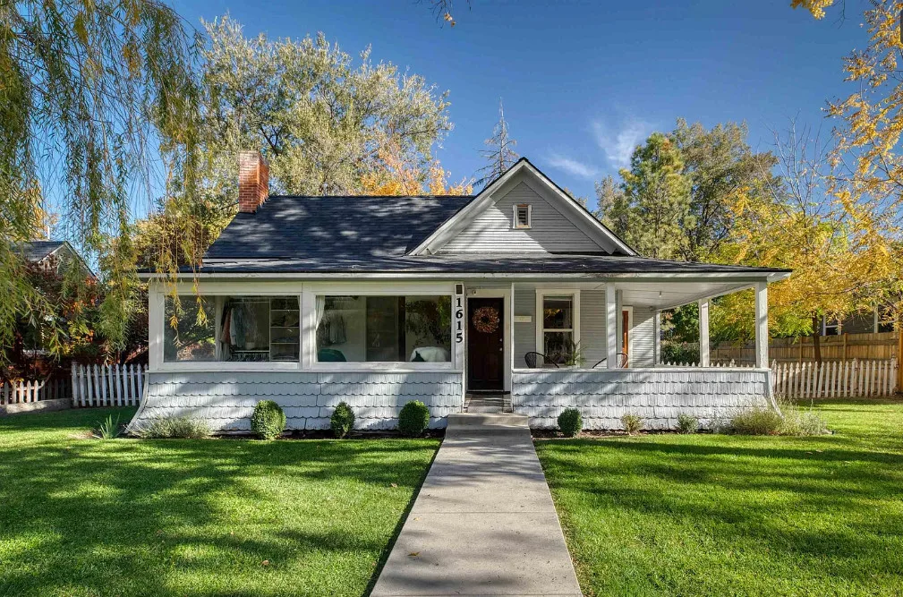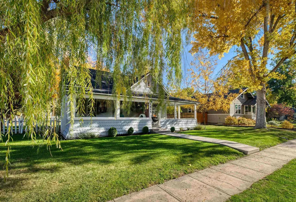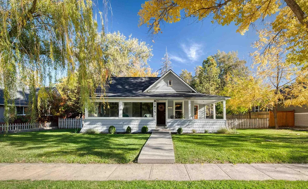 This house has nice curb appeal and character! I love the weeping willow tree out front! The house was built in 1918. It is located in Caldwell, Idaho. The house features nice curb appeal, a covered front porch, wood floors, wide baseboards, crown moulding and a sunroom. There is a fenced backyard, a patio and a detached storage shed. Two bedrooms, one bathroom and 881 square feet. $310,000