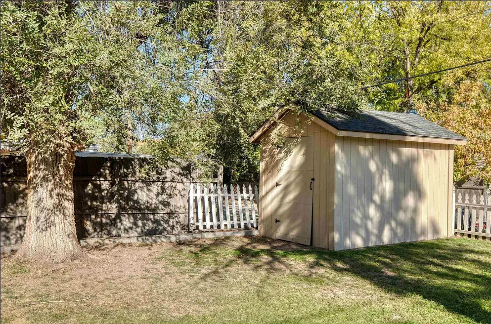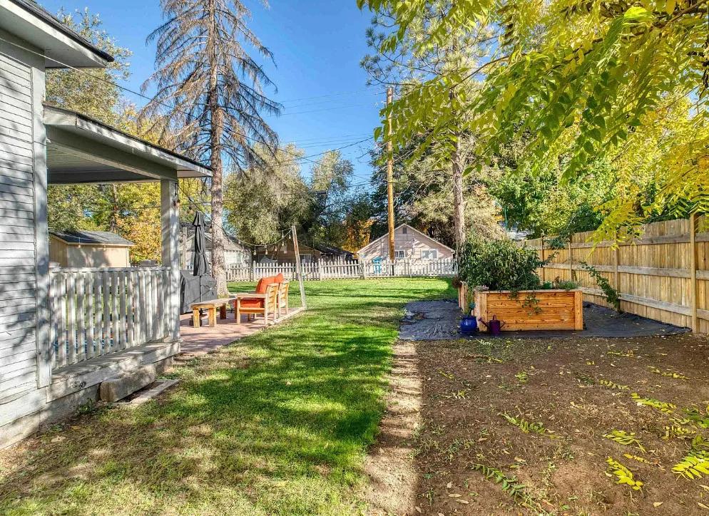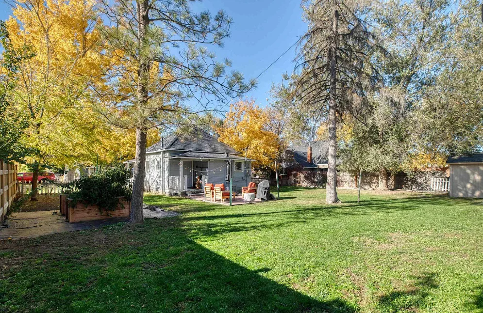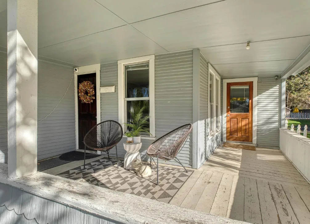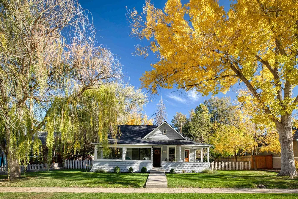 This house has nice curb appeal and character! I love the weeping willow tree out front! The house was built in 1918. It is located in Caldwell, Idaho. The house features nice curb appeal, a covered front porch, wood floors, wide baseboards, crown moulding and a sunroom. There is a fenced backyard, a patio and a detached storage shed. Two bedrooms, one bathroom and 881 square feet. $310,000