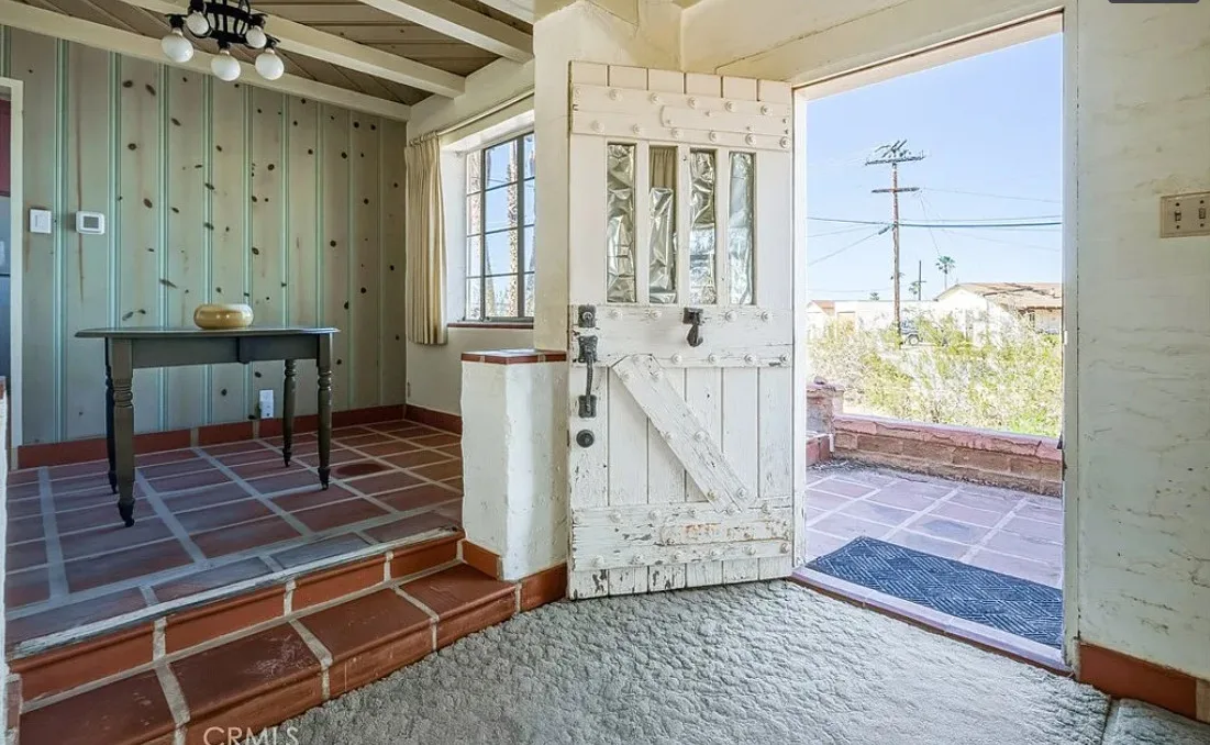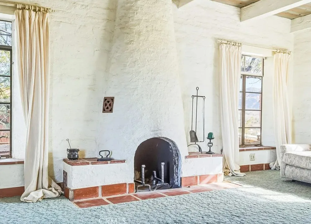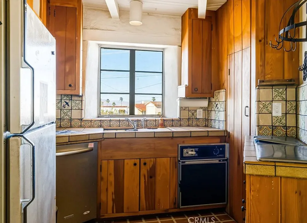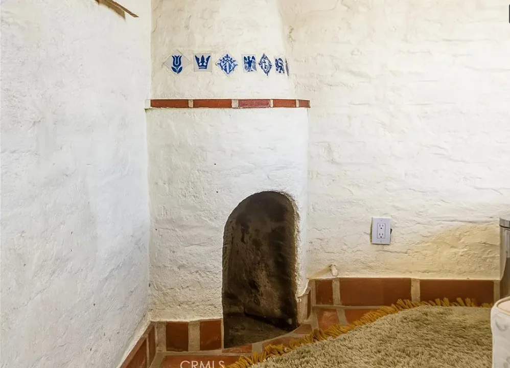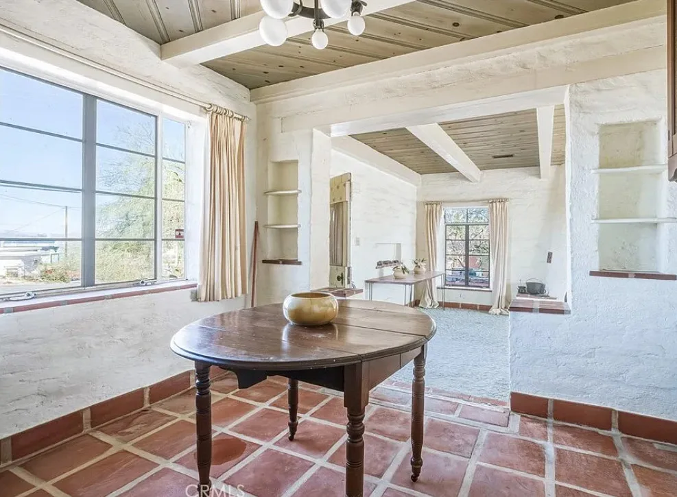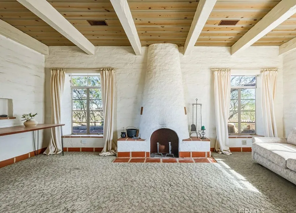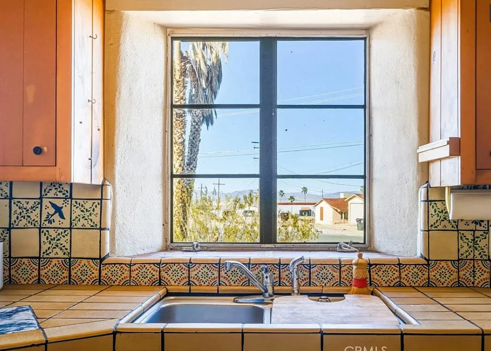 Those sure are some unique fireplaces! The house has pretty details. The home was built in 1945. It is located on .68 acre in Twentynine Palms, California. The house features exposed beams, unique fireplaces, great front door, custom tile backsplash and built-in bookshelves. There is a large detached garage. Three bedrooms, two bathrooms and 1,434 square feet. $280,000