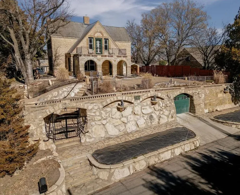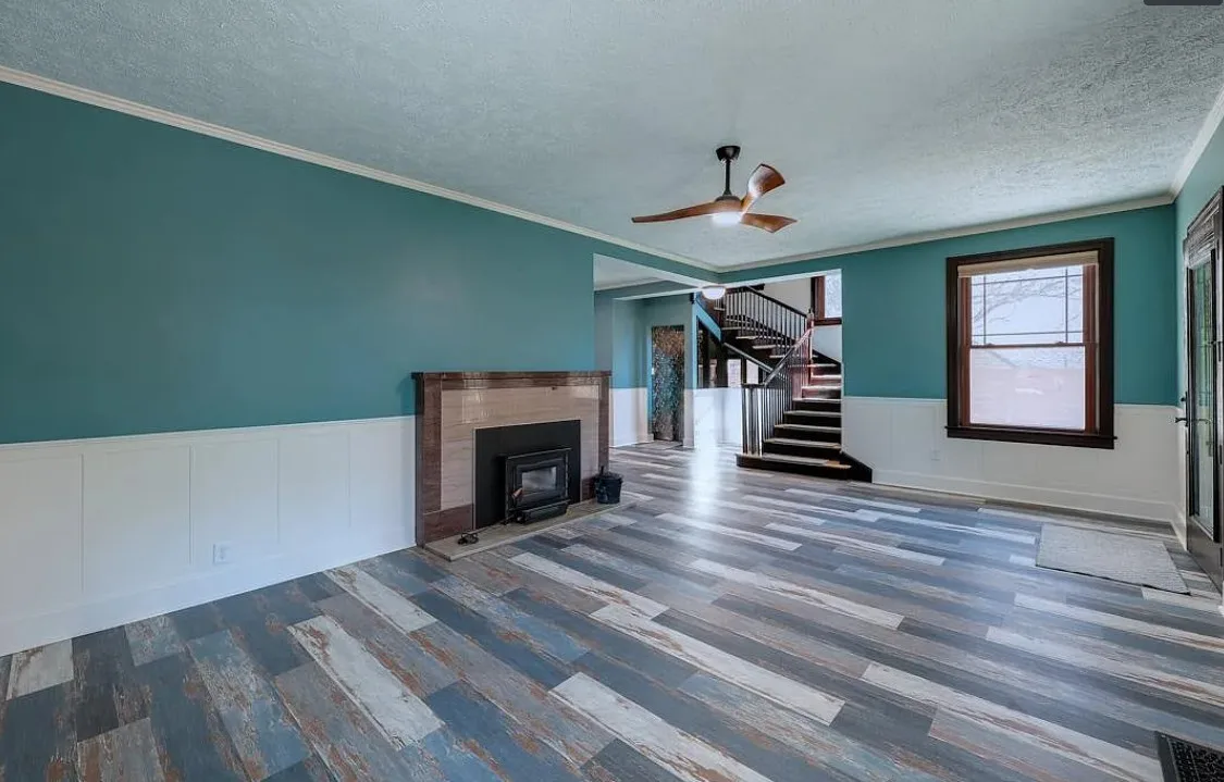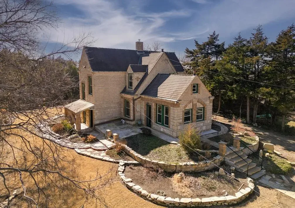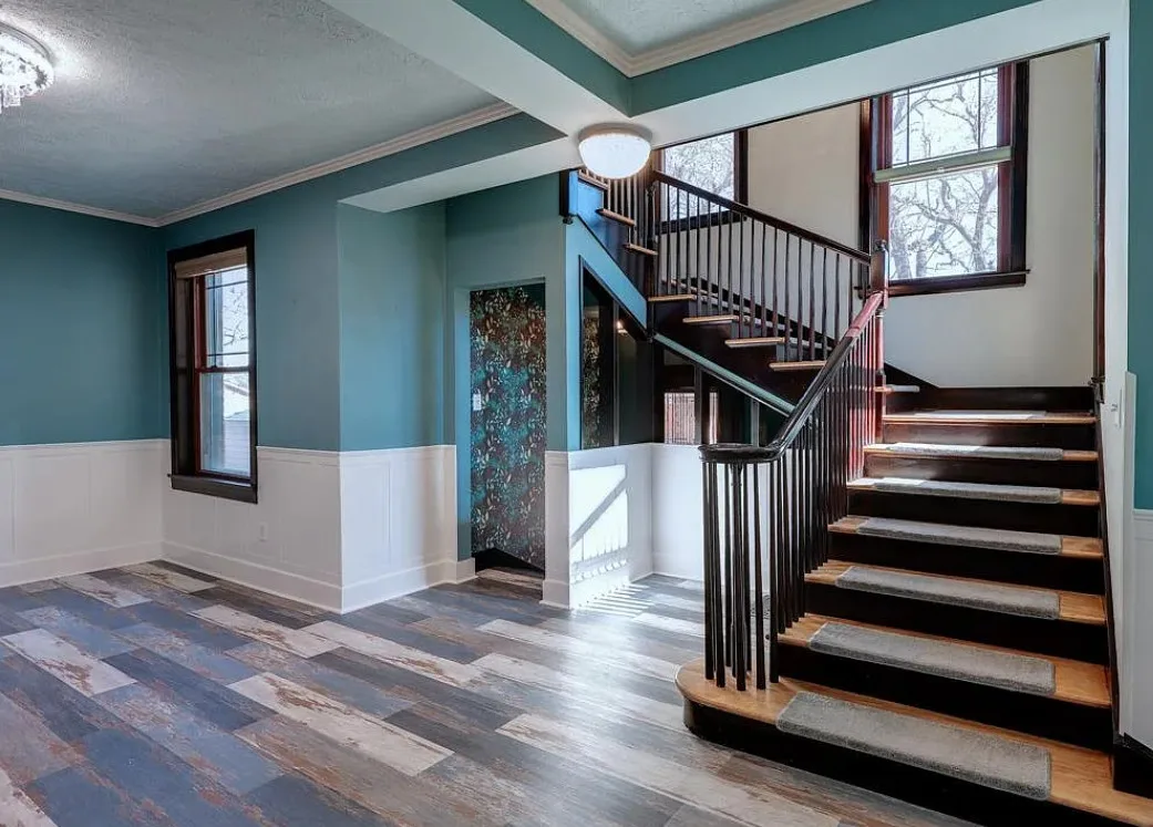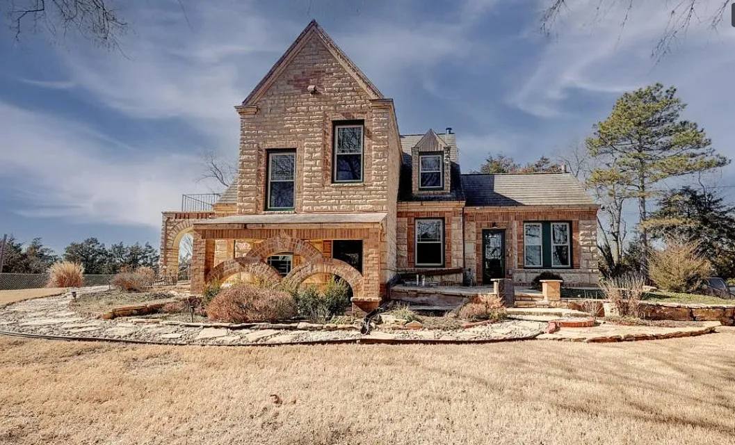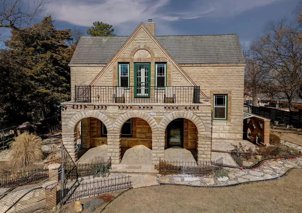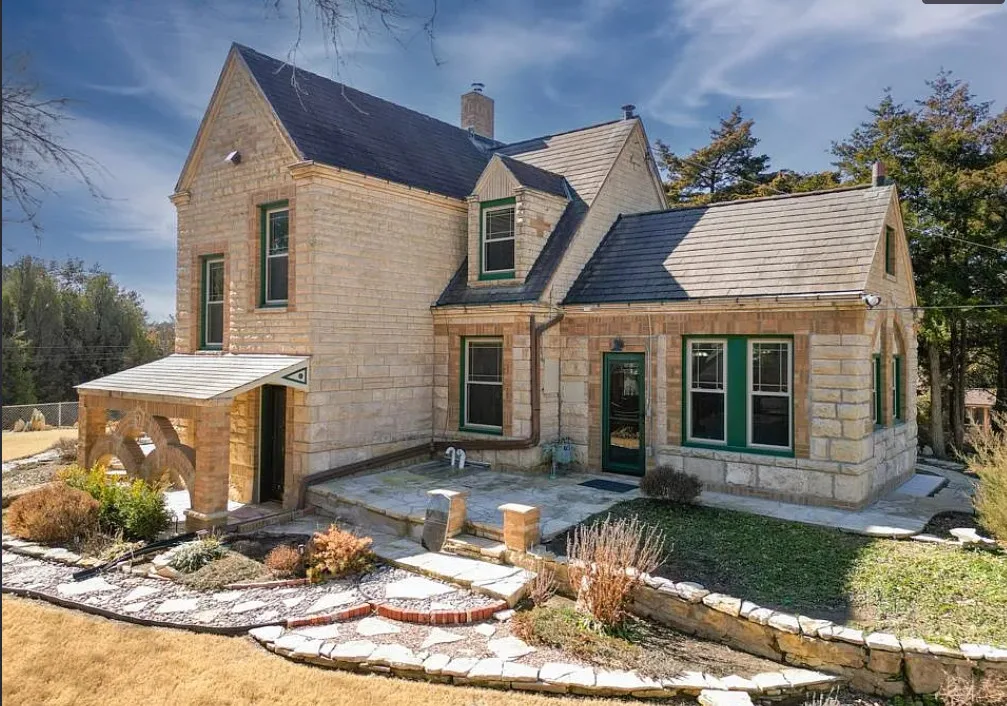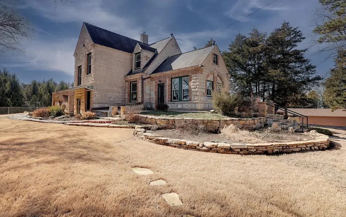 This house has such a cool exterior and property! The interior on the other hand is a bit of a let down. Wish we could see pictures of it before someone got hold of it. Most likely the flooring on the stairs continued throughout the house. The home was built in 1871. It is located on .26 acre in Winfield, Kansas. The home features a limestone exterior, pretty exterior details and original wood flooring on the stairs. Three bedrooms, three bathrooms and 2,037 square feet. $375,000