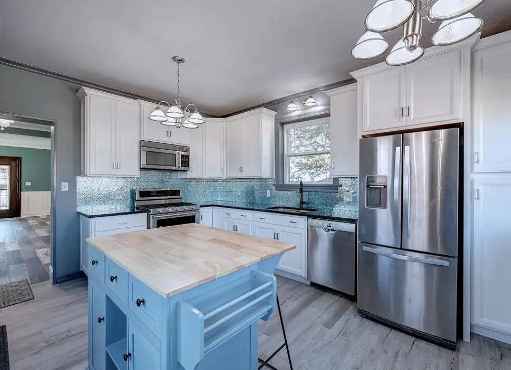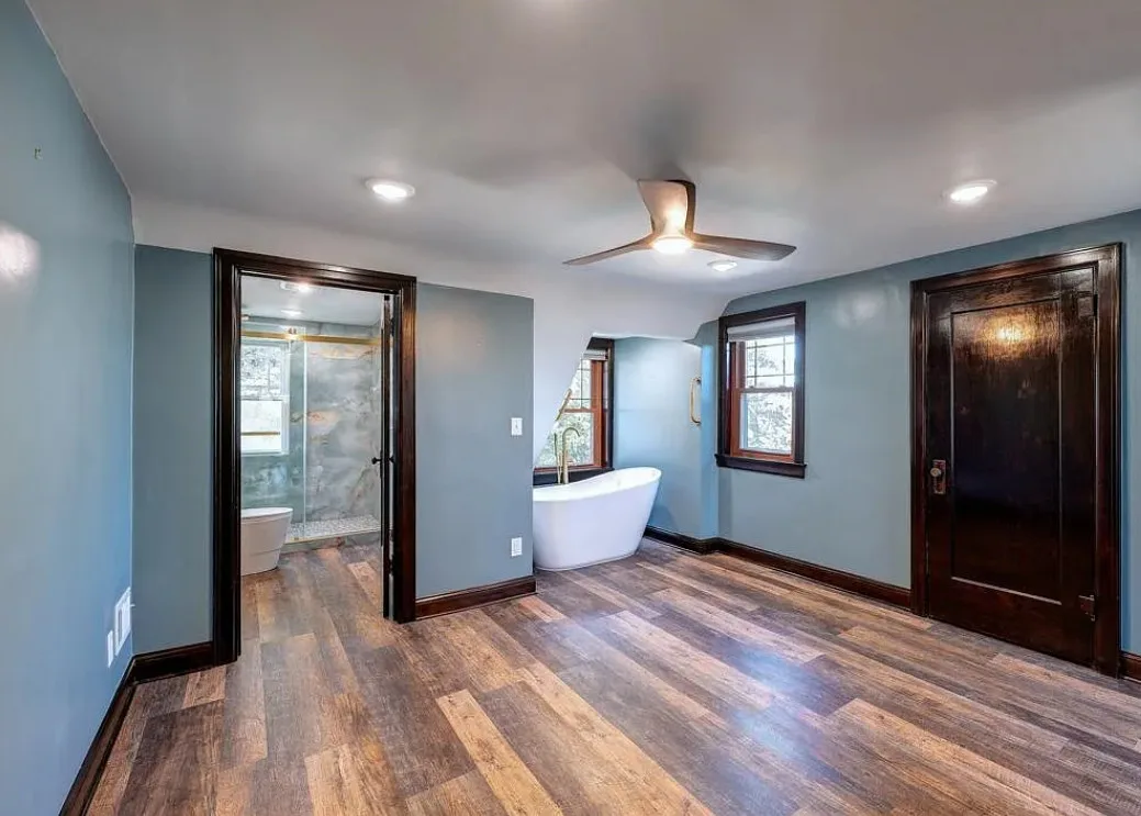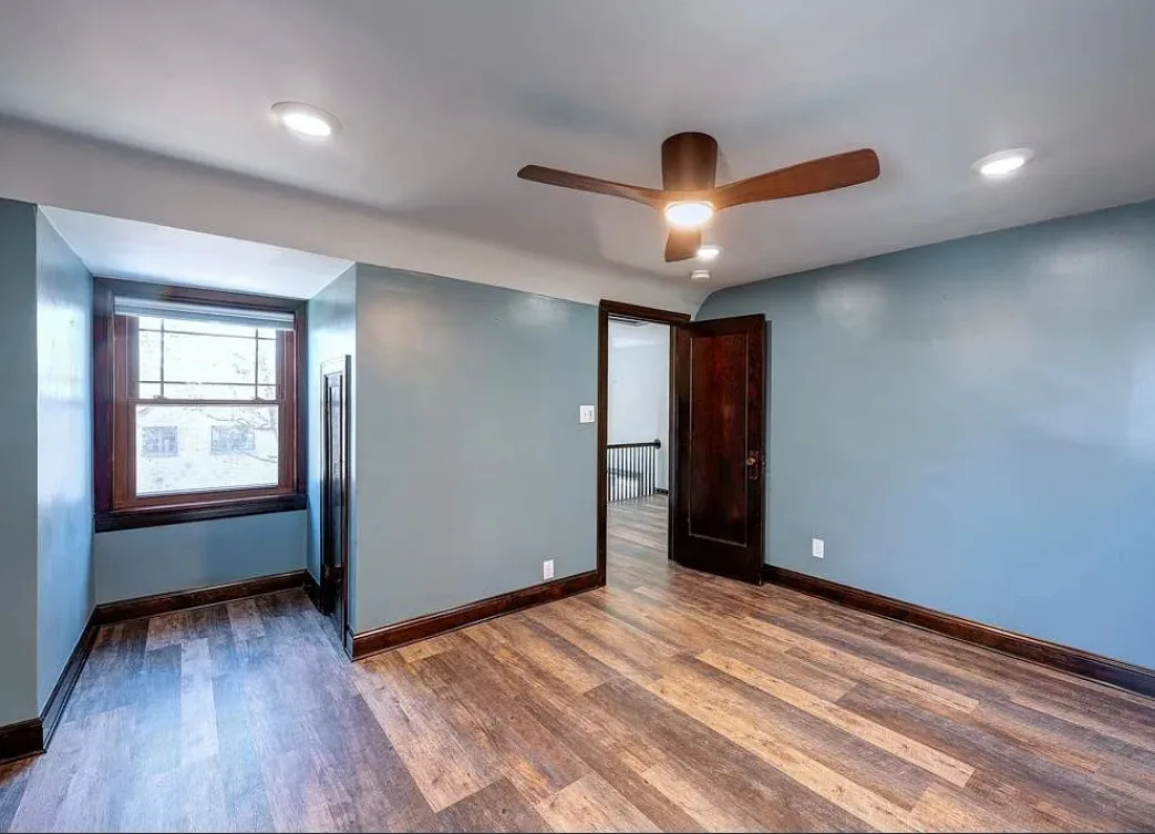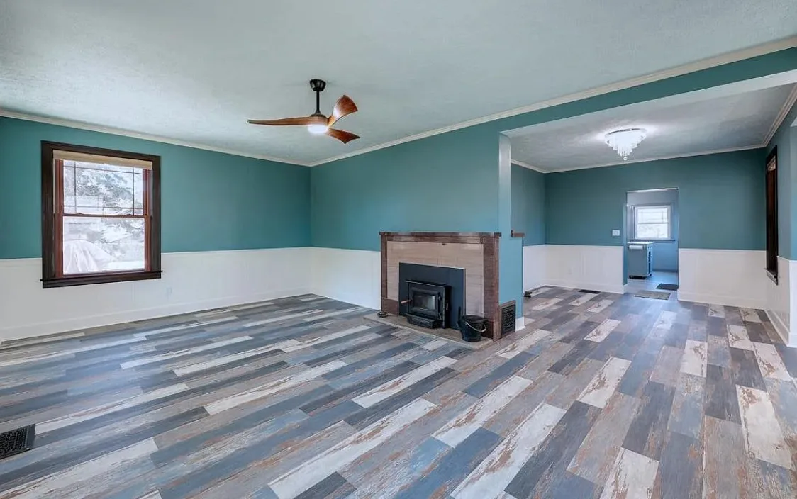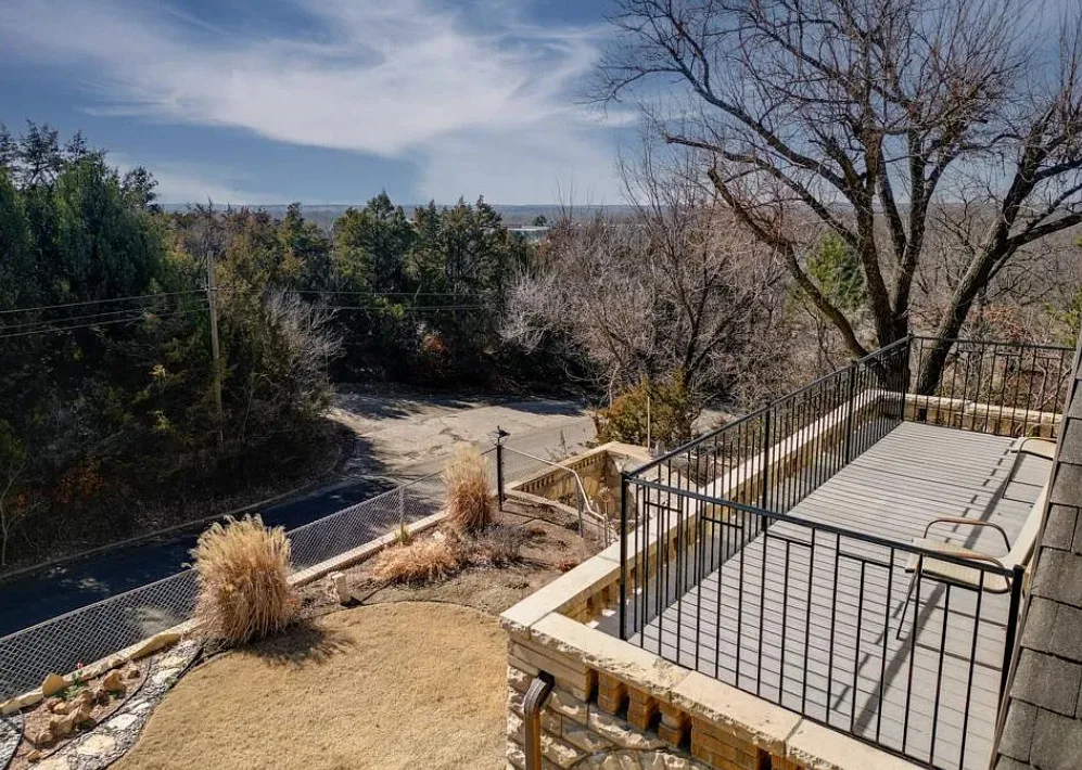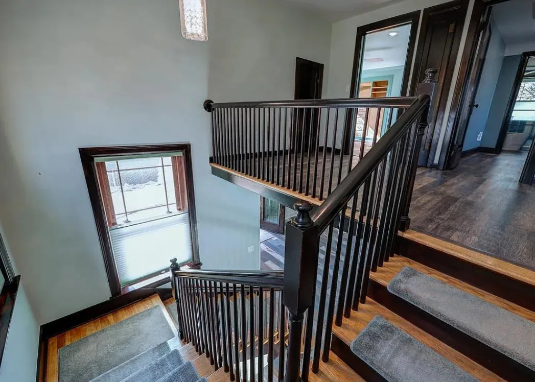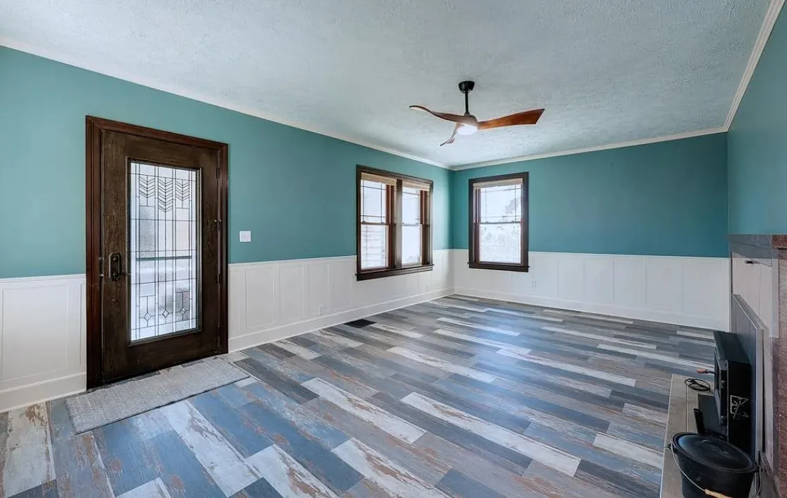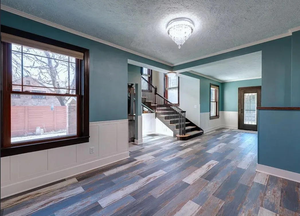 This house has such a cool exterior and property! The interior on the other hand is a bit of a let down. Wish we could see pictures of it before someone got hold of it. Most likely the flooring on the stairs continued throughout the house. The home was built in 1871. It is located on .26 acre in Winfield, Kansas. The home features a limestone exterior, pretty exterior details and original wood flooring on the stairs. Three bedrooms, three bathrooms and 2,037 square feet. $375,000