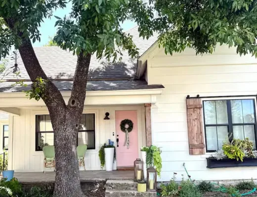 I like the pink door! The interior has a shabby chic feel to it. The house was built…